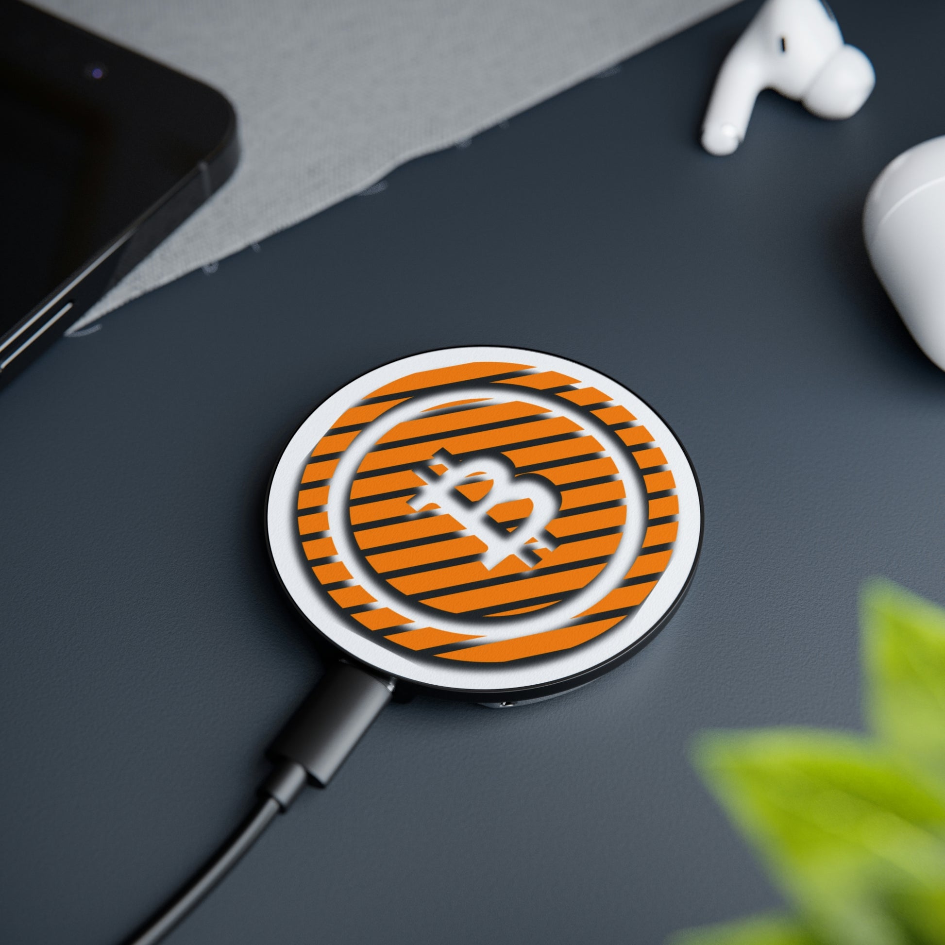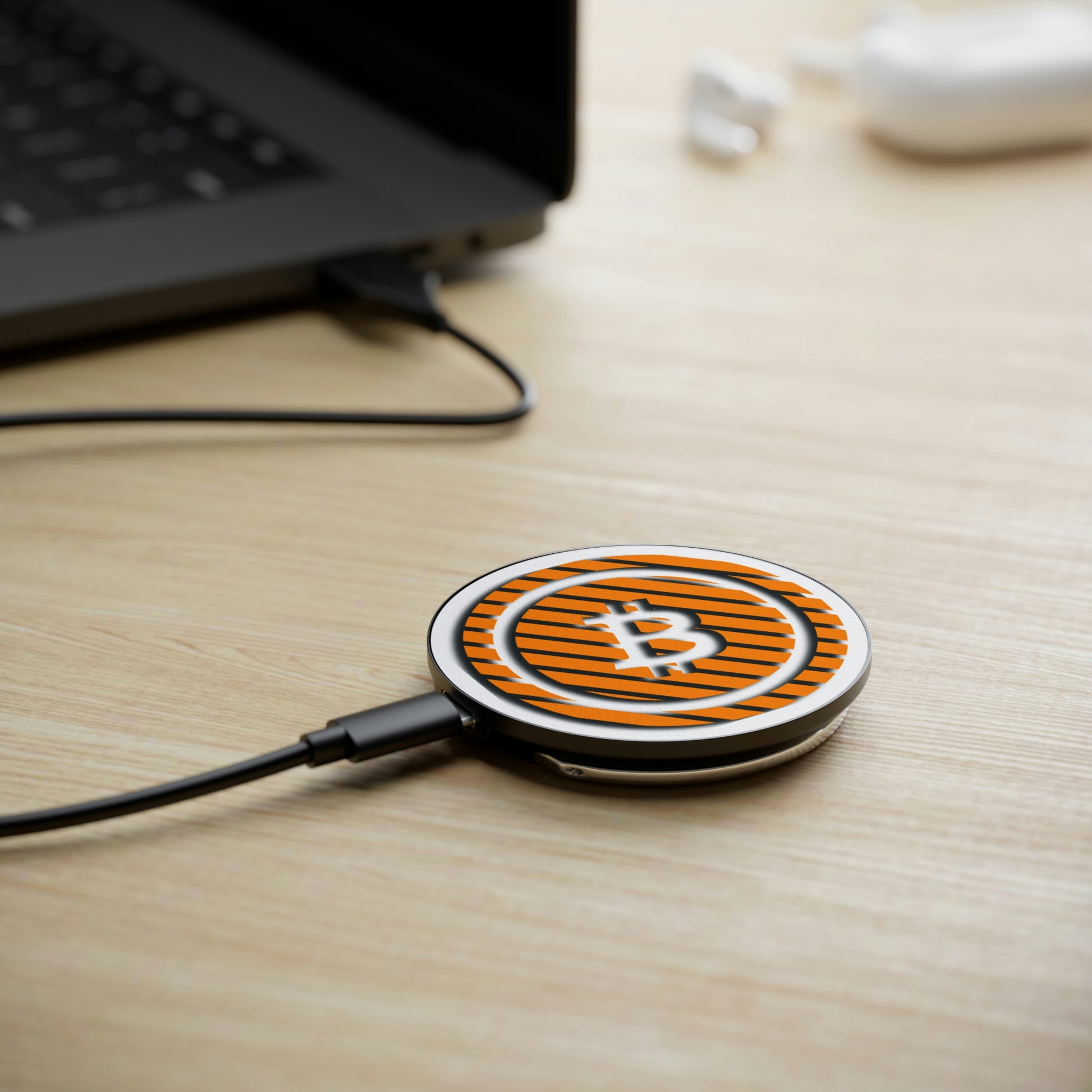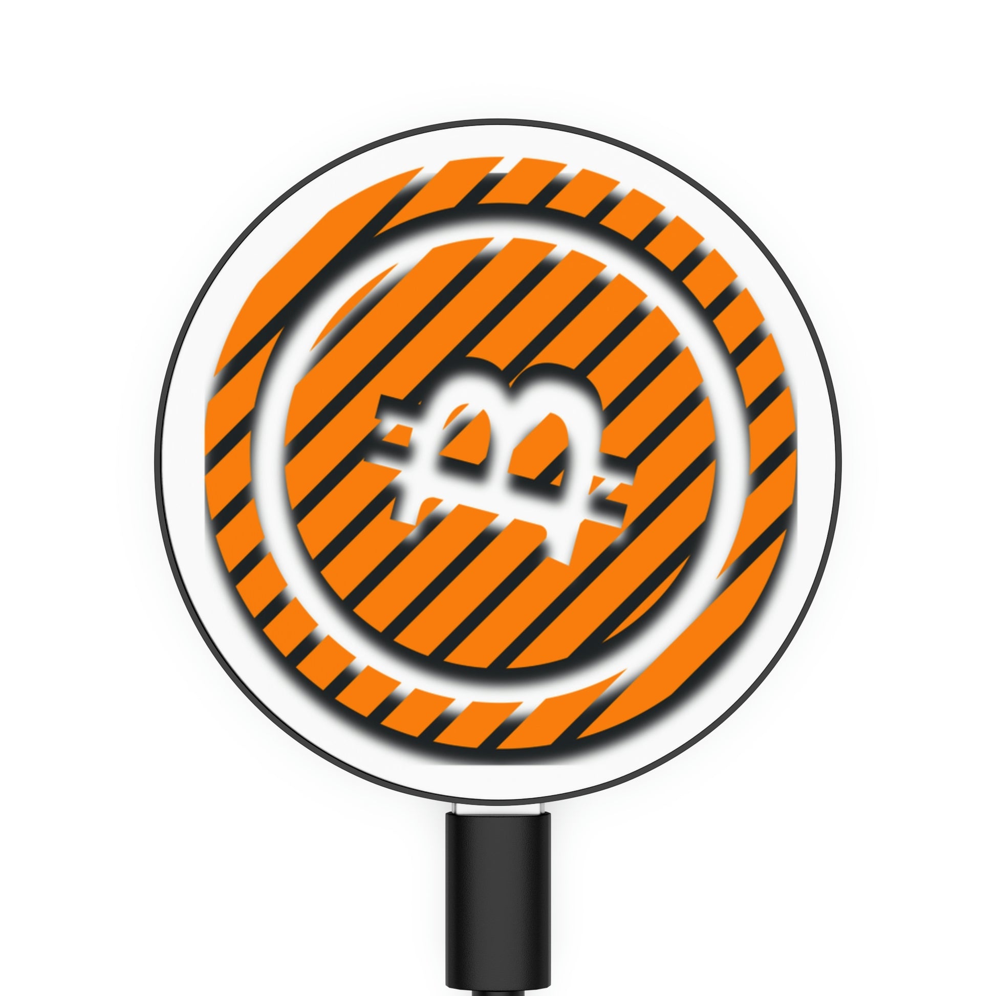 Created to satisfy gadget fans around the world, this customized wireless charger works universally with all wireless charging-compatible smartphones. With a slick black body, a matte white top, and a silver metal ring, it's a perfect way to subtlety plant a reminder of you conviction for Bitcoin in a tasteful and useful way. Comes with a built-in ring holder, supports Qi wireless charging standard and MagSafe function, and ships with a USB-C cable included.