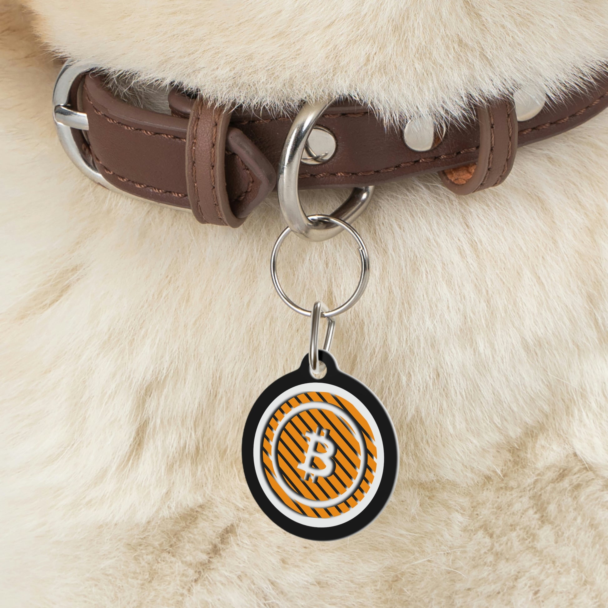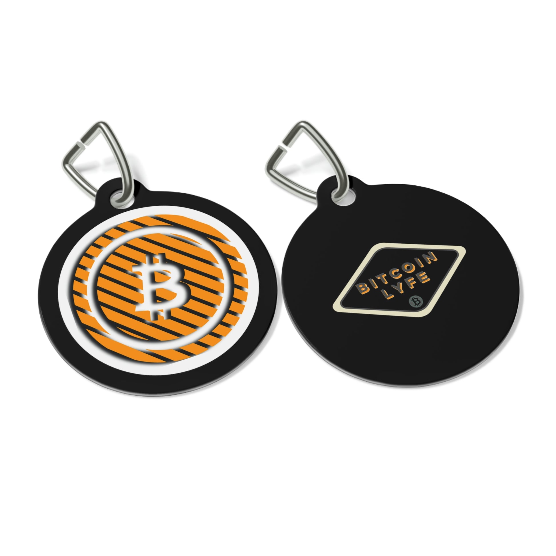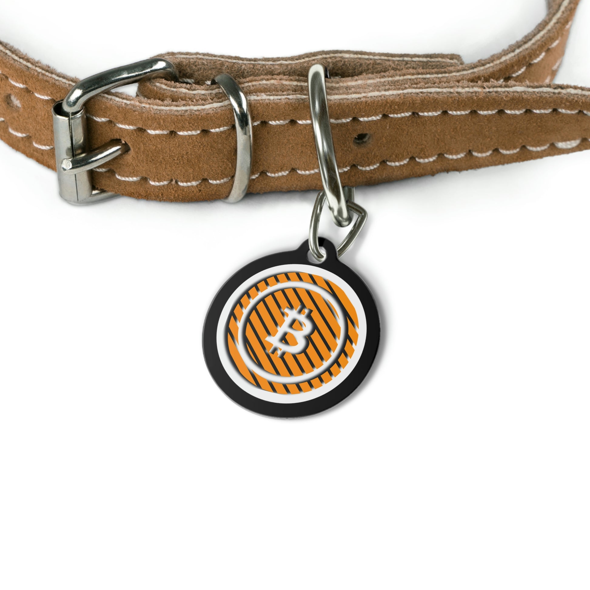 BItcoin pet tags provide a fresh way to spice up a furry friend's collar. The tag and clip are both made of metal. This increased durability comes in handy, as collar pieces can snag on brush, corners, etc.
