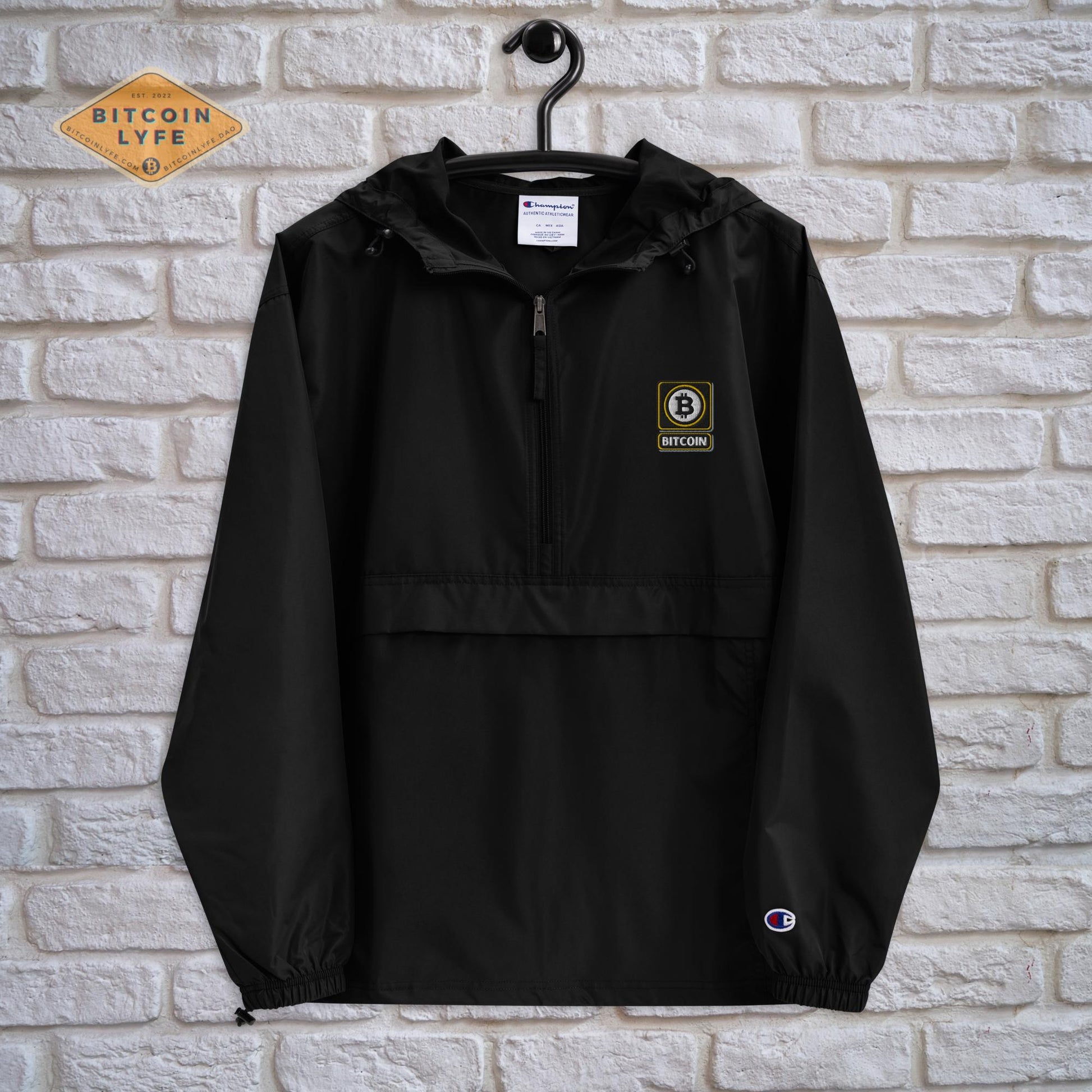 Protect yourself from the elements with this Bitcoin LYFE-Champion packable jacket. This wind and rain resistant polyester jacket with a detailed Bitcoin embroidery design has a practical hood, front kangaroo pocket, and zipped pouch pocket which you can pull out and use to scrunch the jacket into for convenient storage. With the right disposition, this may even be FUD repellant! Well, it’s worth a try anyway!