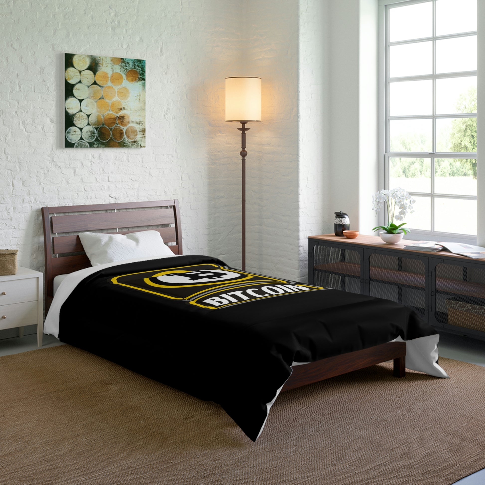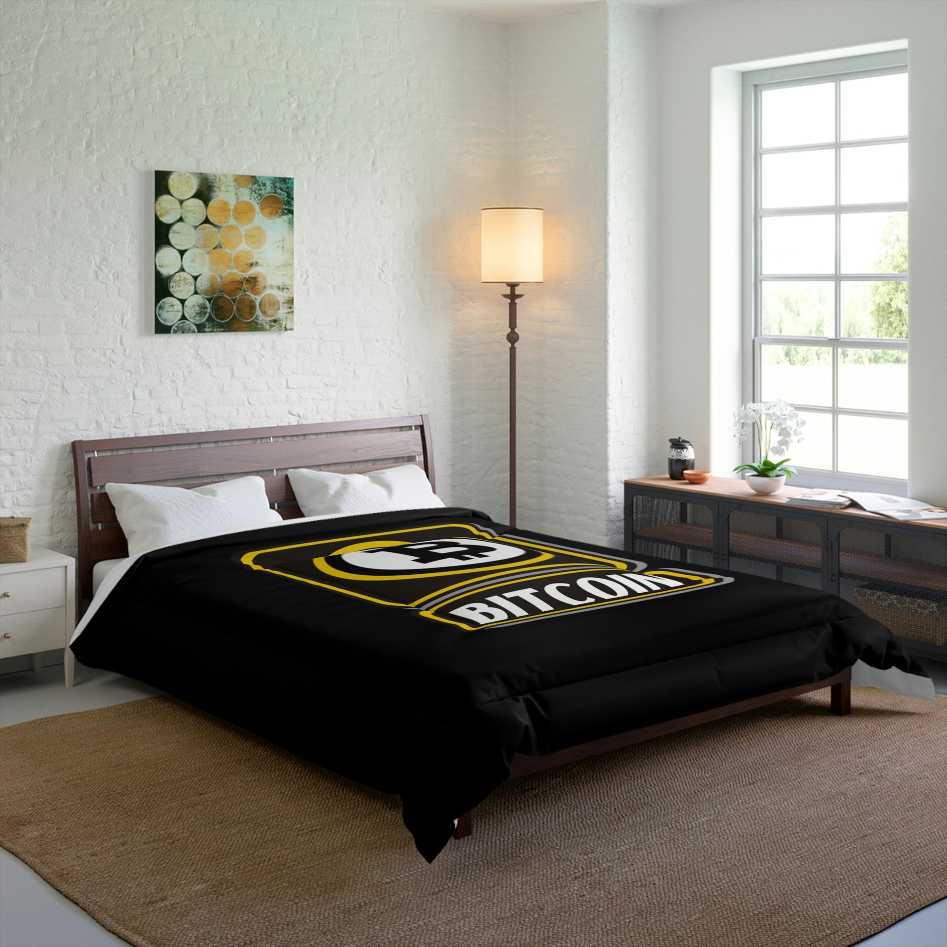 Comfy, fluffy, and warm. Cozy up underneath our snug comforter for a deep and relaxing sleep. This Bitcoin comforter is the perfect solution for cold days in bed with coffee, waiting for the morning light to peak through the window and wake up the house.