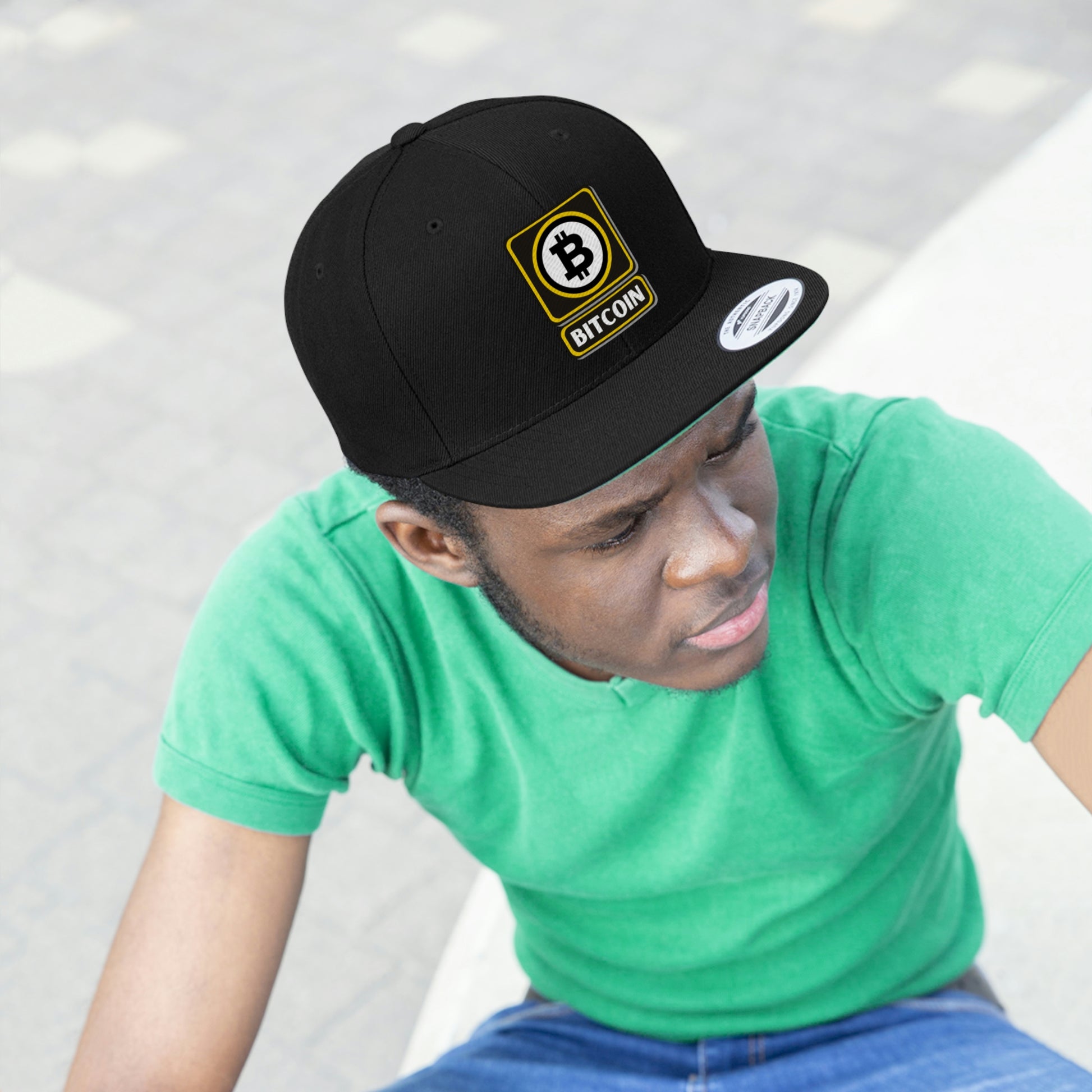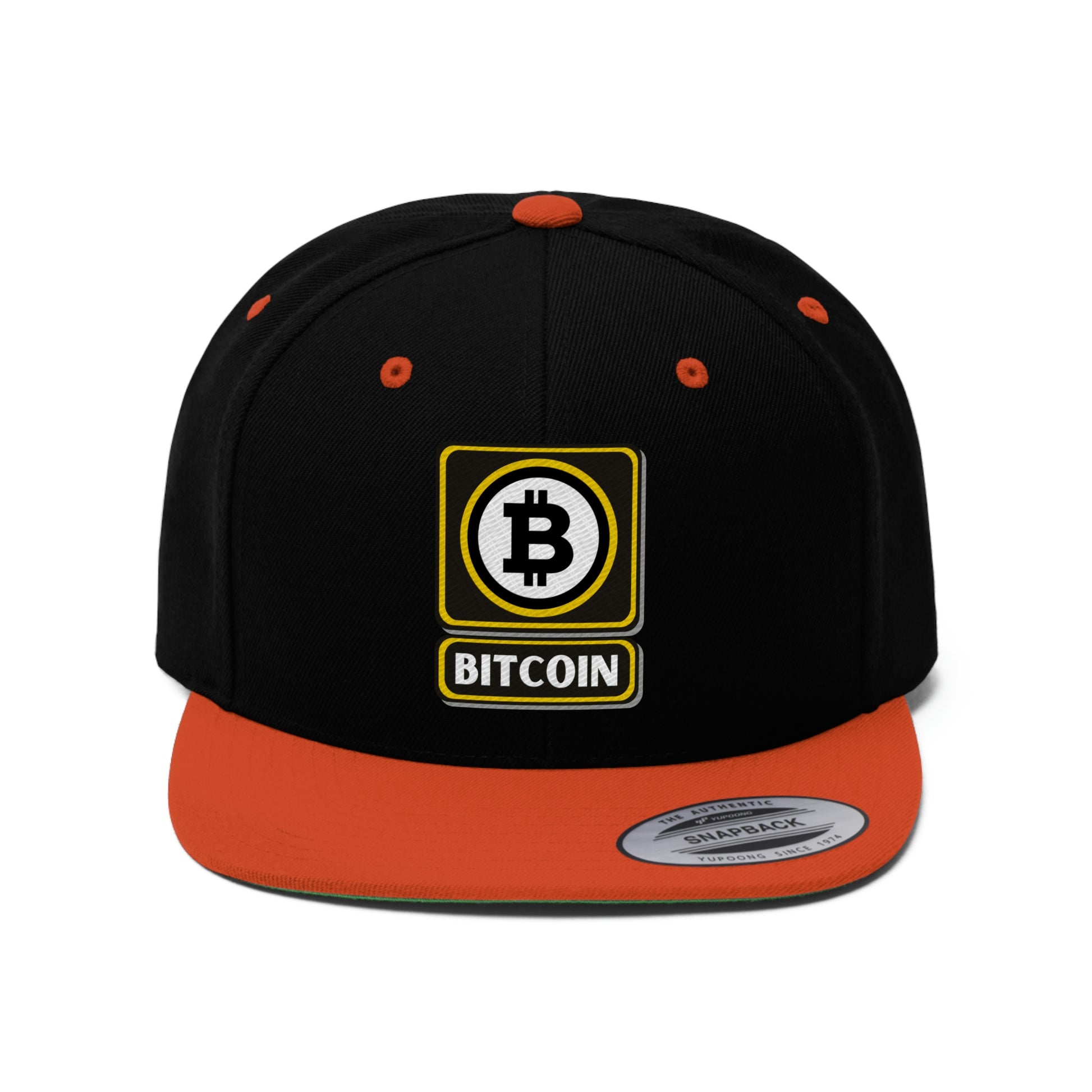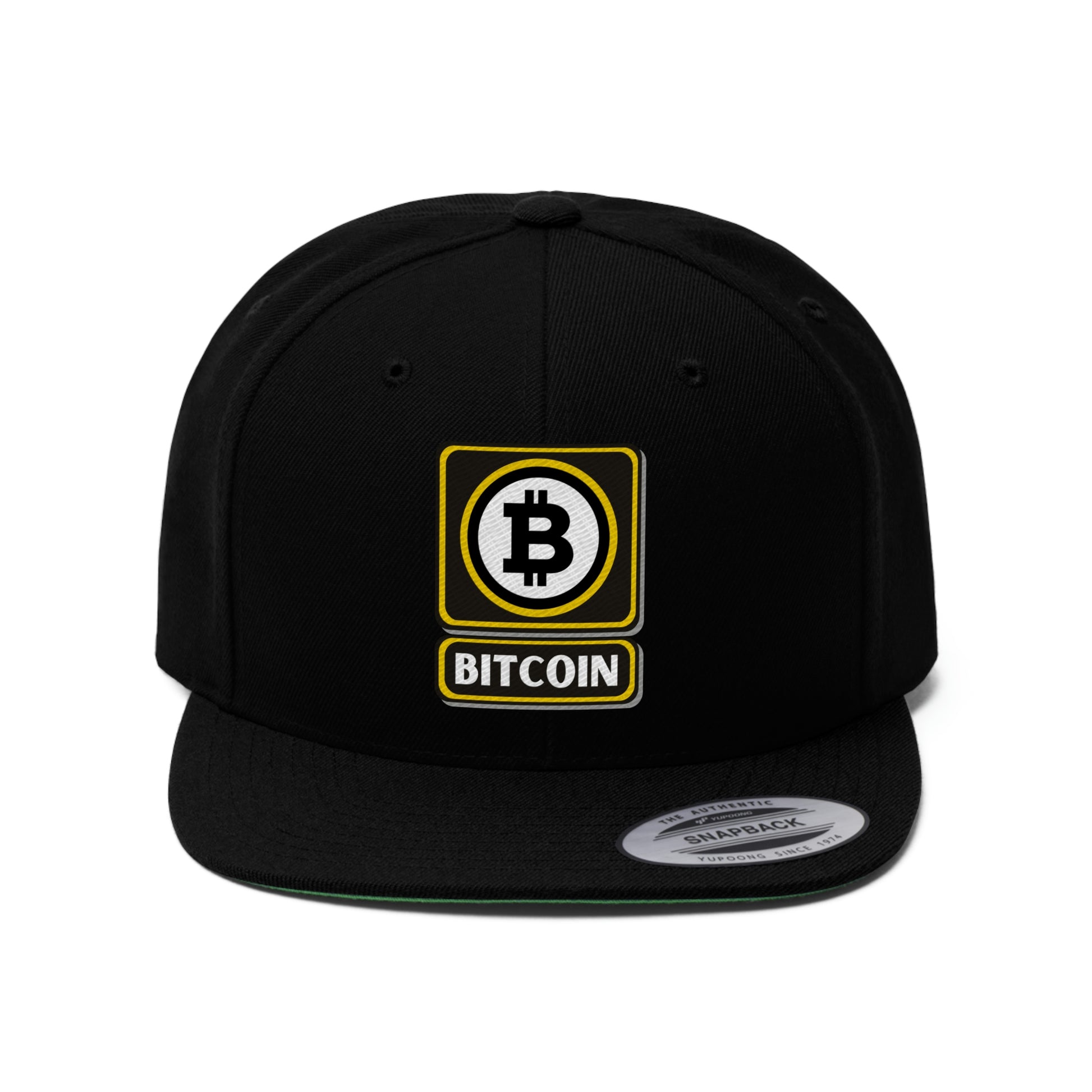 This Bitcoin 6-panel cap is a modern take on a classic design. This hat is the perfect choice thanks to its sharp styling, spirited color and lively green underbill. The old-school snapback closure and iconic flat bill add a subtle charm that takes you back to the good ol’ days ...with BTC laser eyes focused on the future. :-)