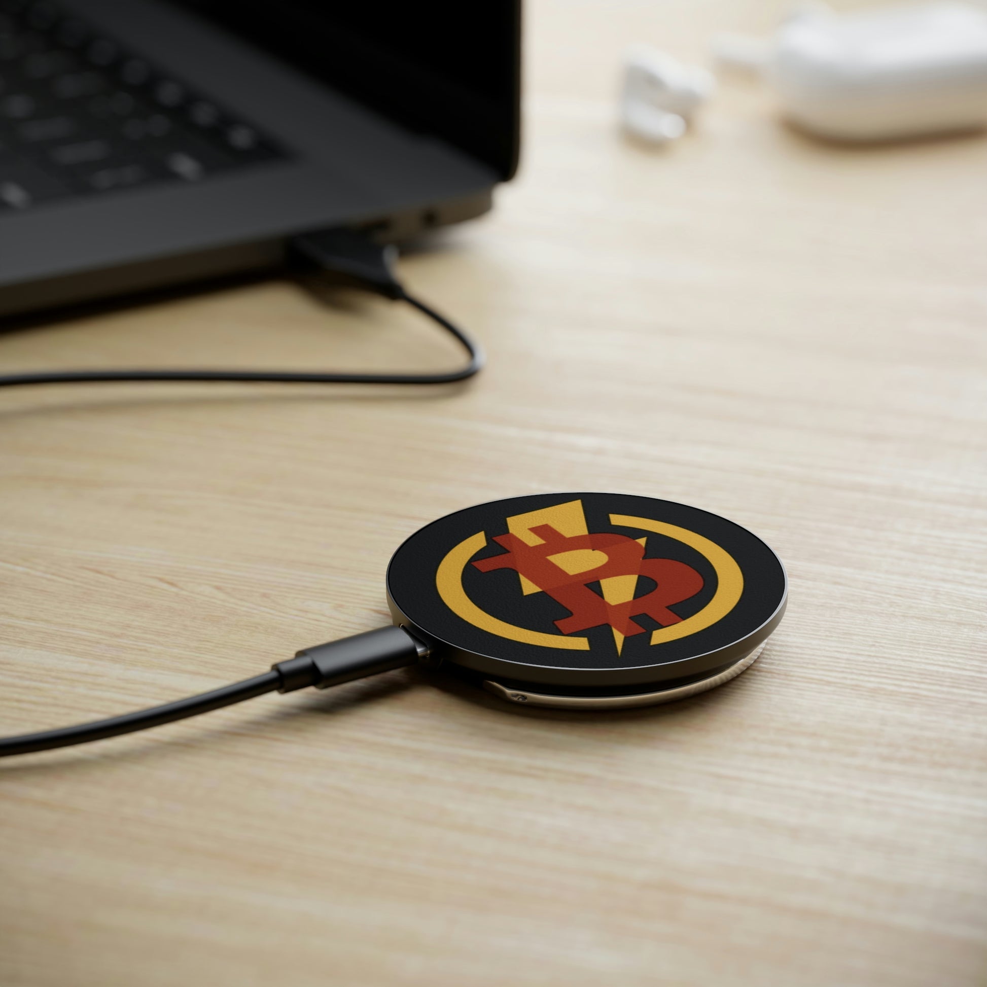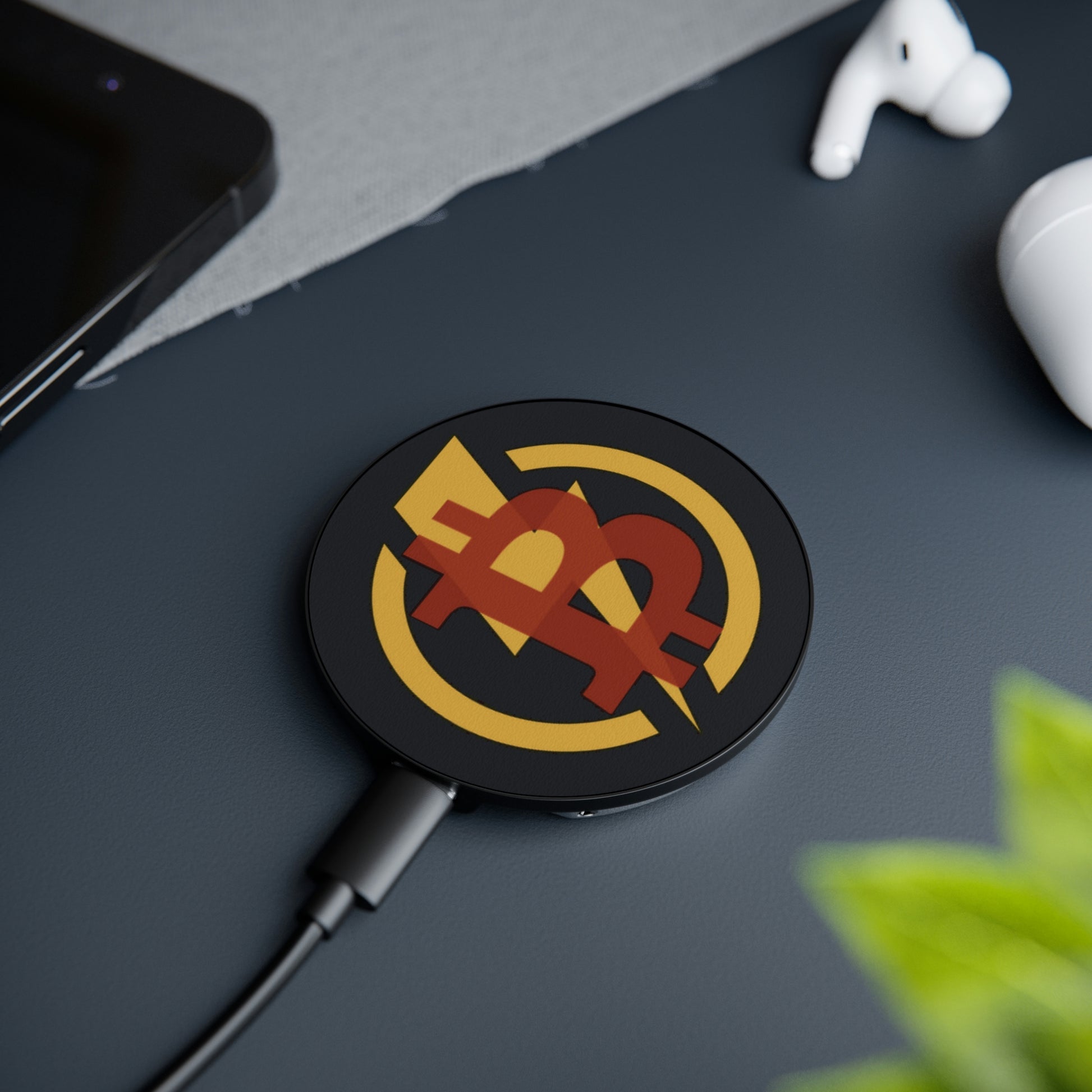 Created to satisfy gadget fans around the world, this customized wireless charger works universally with all wireless charging-compatible smartphones. With a slick black body, a matte white top, and a silver metal ring, it's a perfect way to subtlety plant a reminder of you conviction for Bitcoin in a tasteful and useful way. Comes with a built-in ring holder, supports Qi wireless charging standard and MagSafe function, and ships with a USB-C cable included.