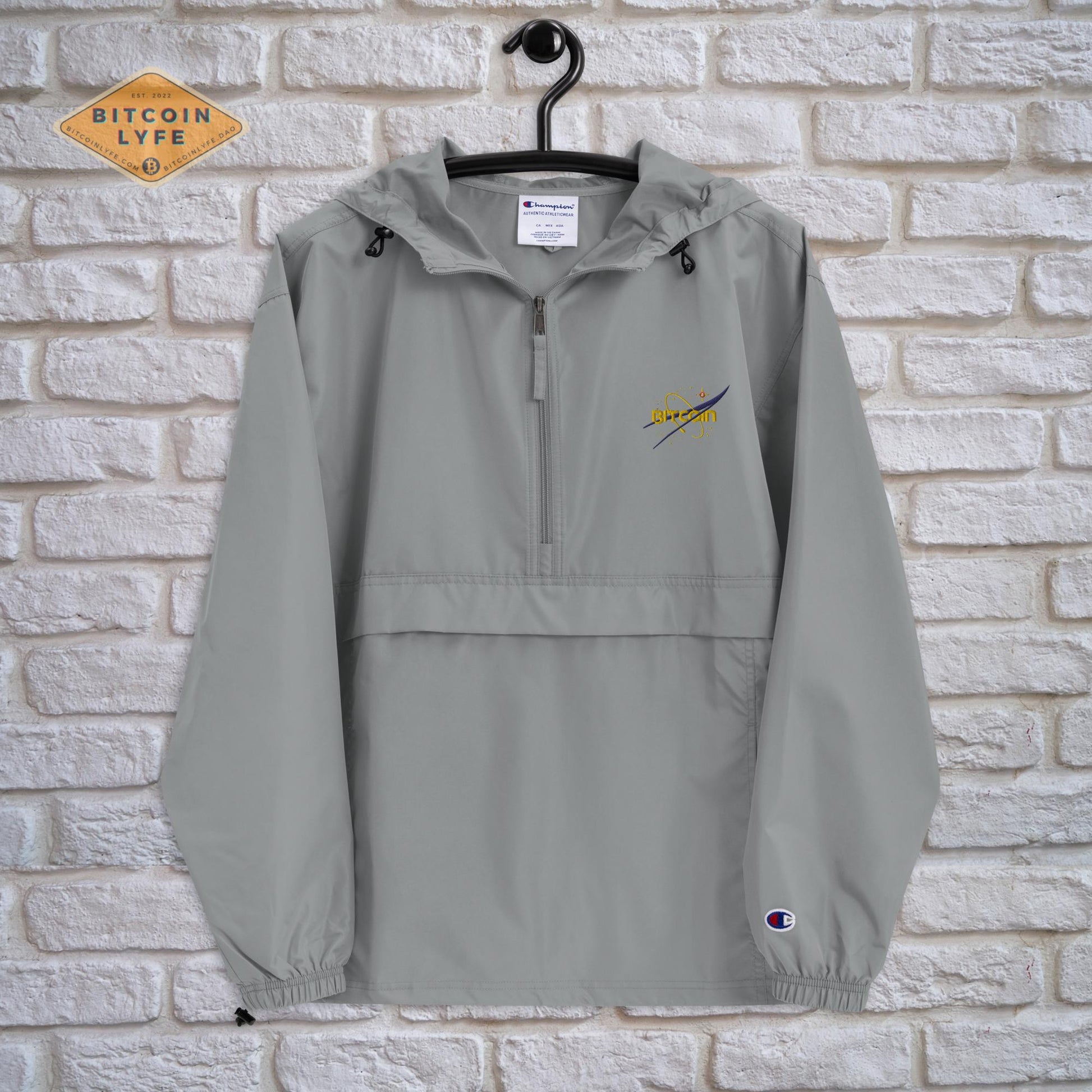 Protect yourself from the elements with this Bitcoin LYFE-Champion packable jacket. This wind and rain resistant polyester jacket with a detailed Bitcoin embroidery design has a practical hood, front kangaroo pocket, and zipped pouch pocket which you can pull out and use to scrunch the jacket into for convenient storage. With the right disposition, this may even be FUD repellant! Well, it’s worth a try anyway!