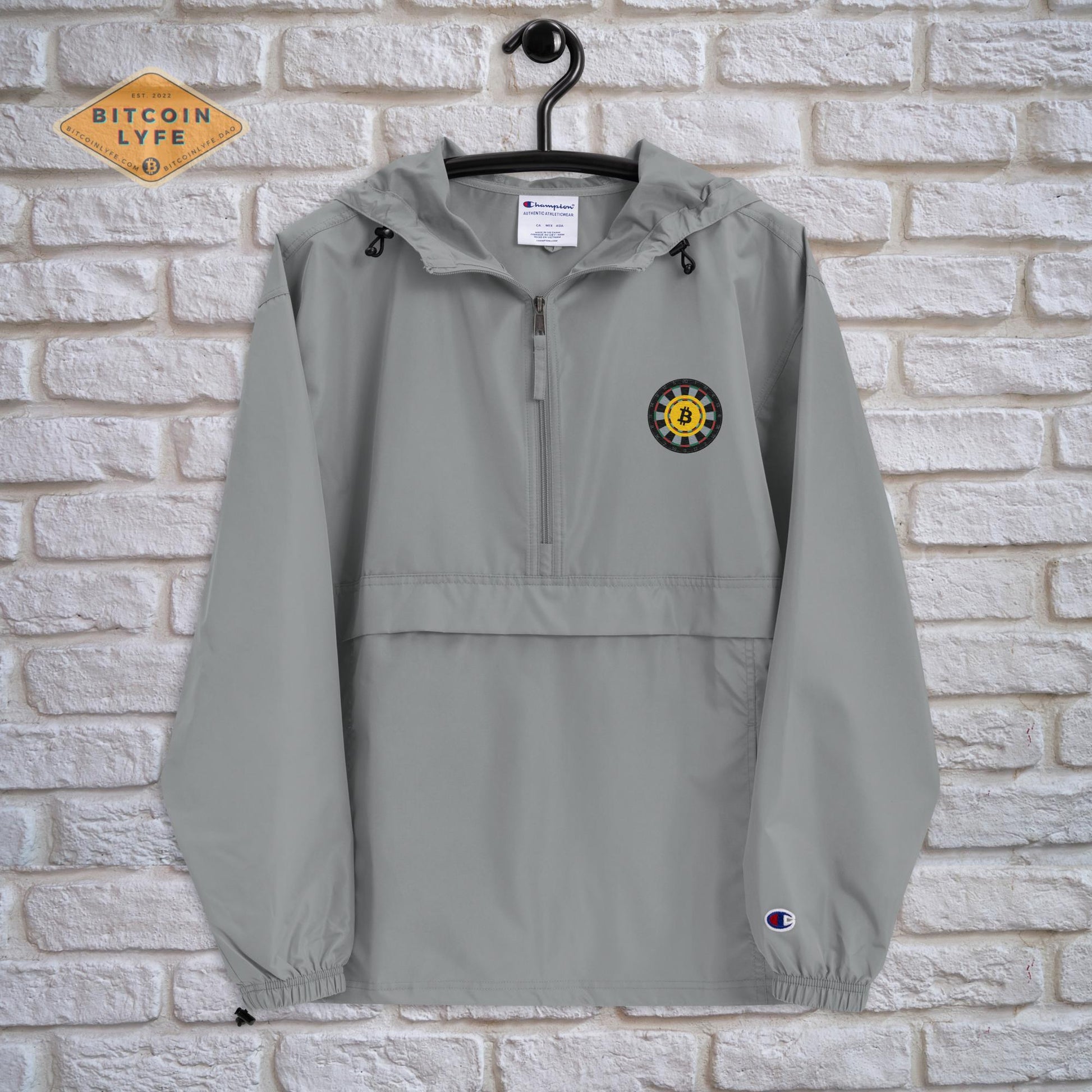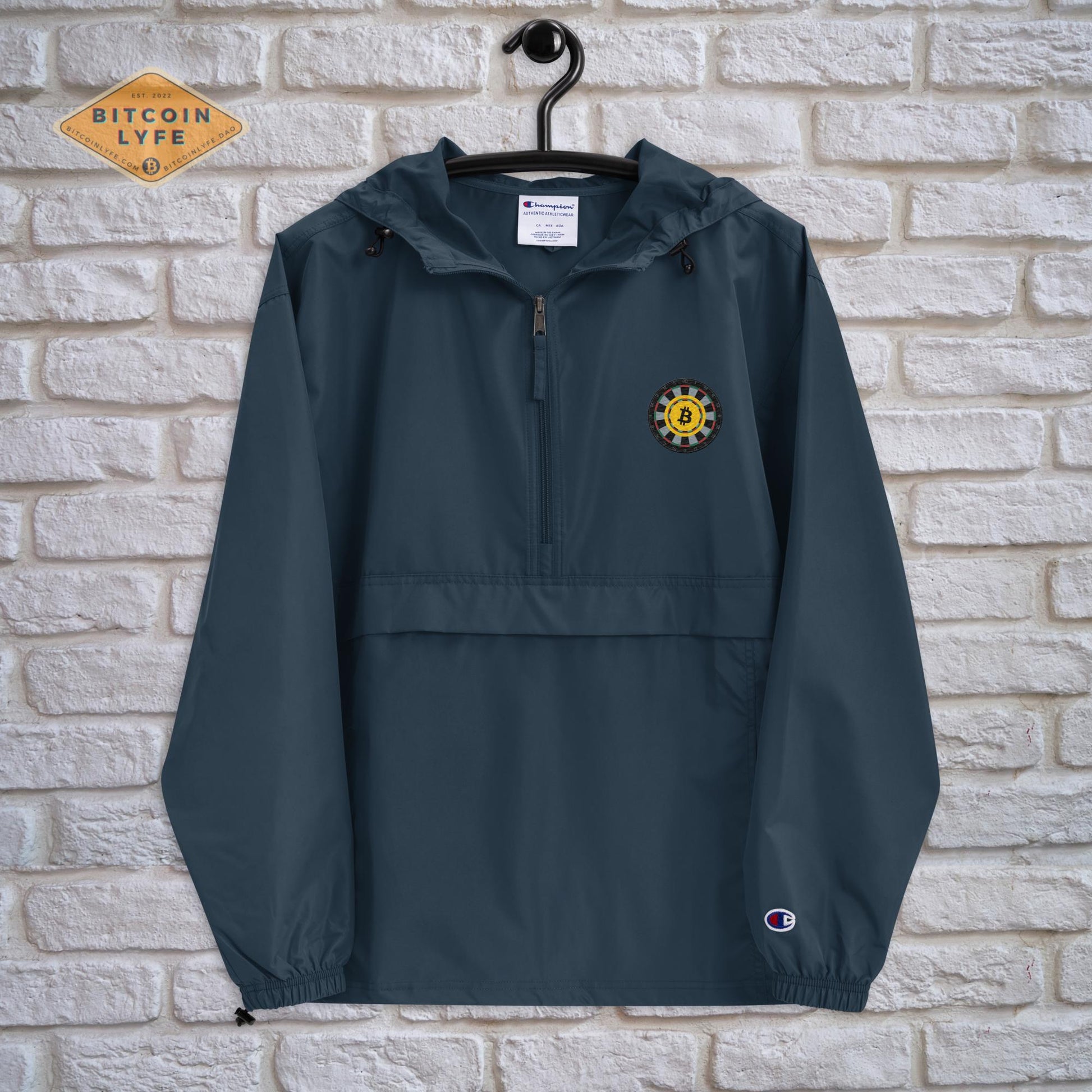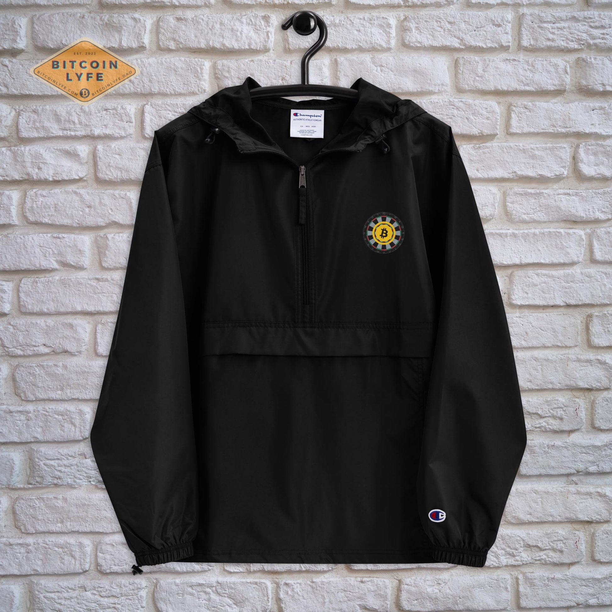 Protect yourself from the elements with this Bitcoin LYFE-Champion packable jacket. This wind and rain resistant polyester jacket with a detailed Bitcoin embroidery design has a practical hood, front kangaroo pocket, and zipped pouch pocket which you can pull out and use to scrunch the jacket into for convenient storage. With the right disposition, this may even be FUD repellant! Well, it’s worth a try anyway!