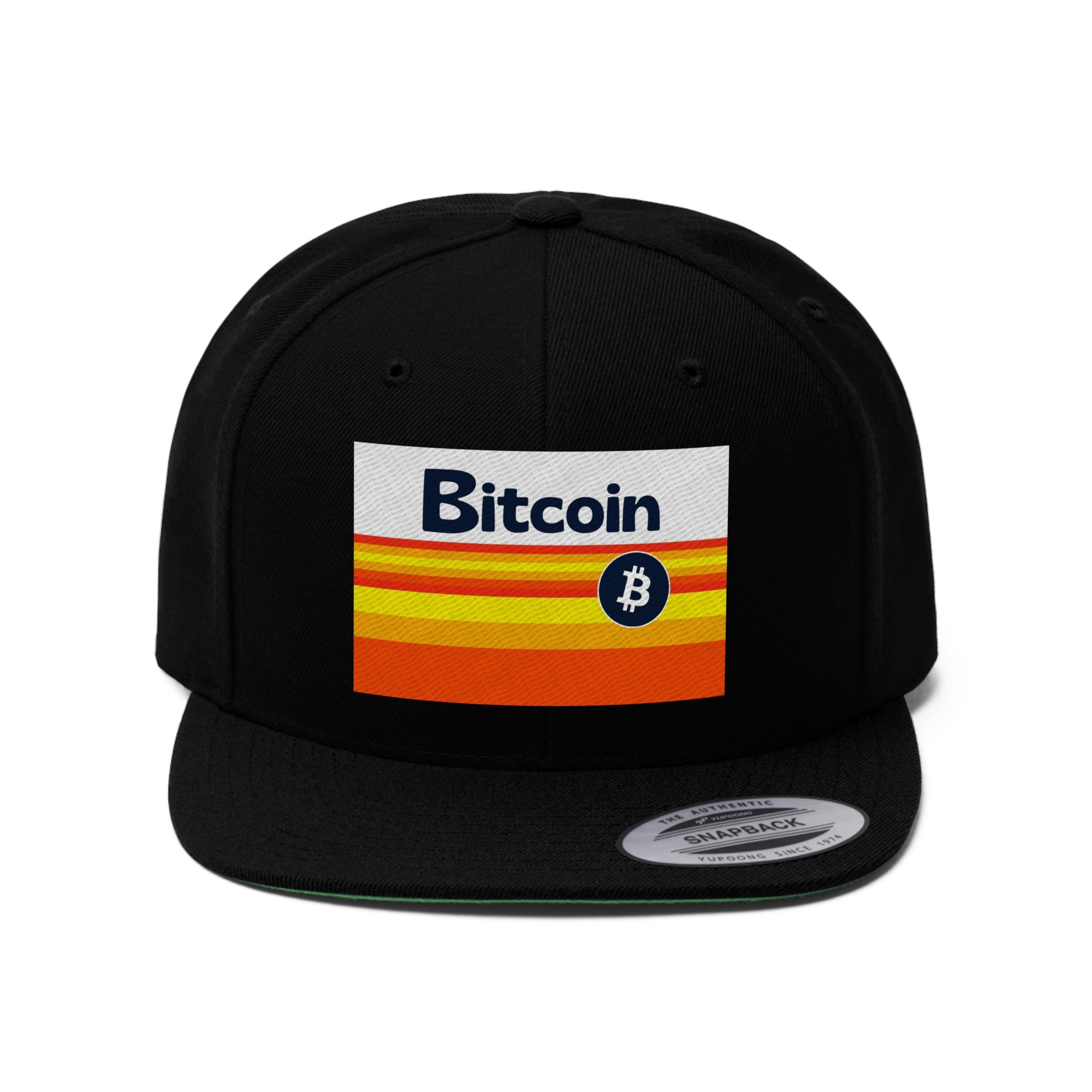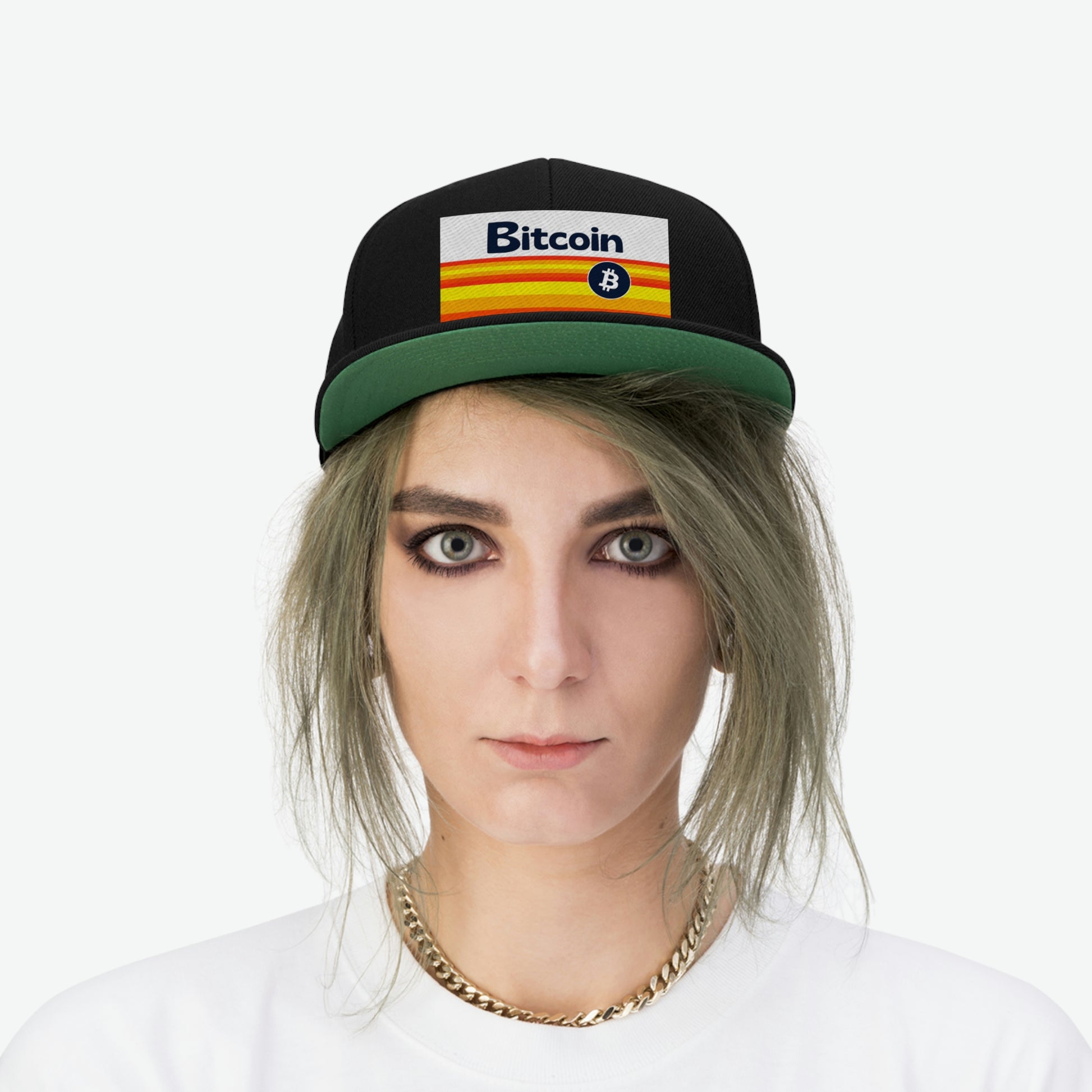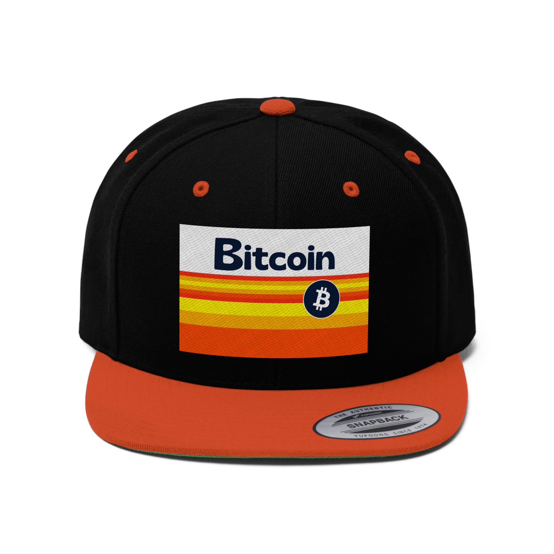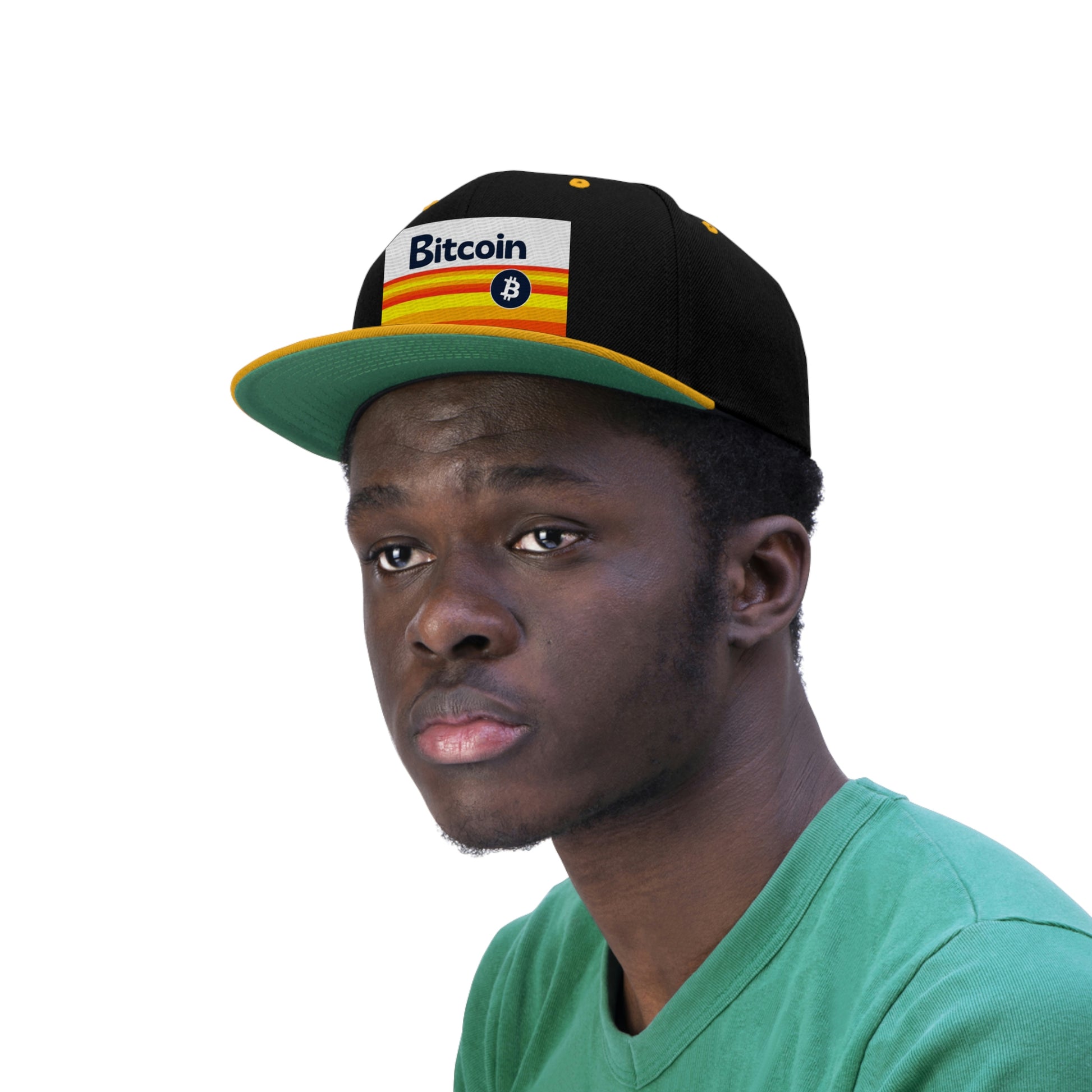This Bitcoin 6-panel cap is a modern take on a classic design. This hat is the perfect choice thanks to its sharp styling, spirited color and lively green underbill. The old-school snapback closure and iconic flat bill add a subtle charm that takes you back to the good ol’ days ...with BTC laser eyes focused on the future. :-)