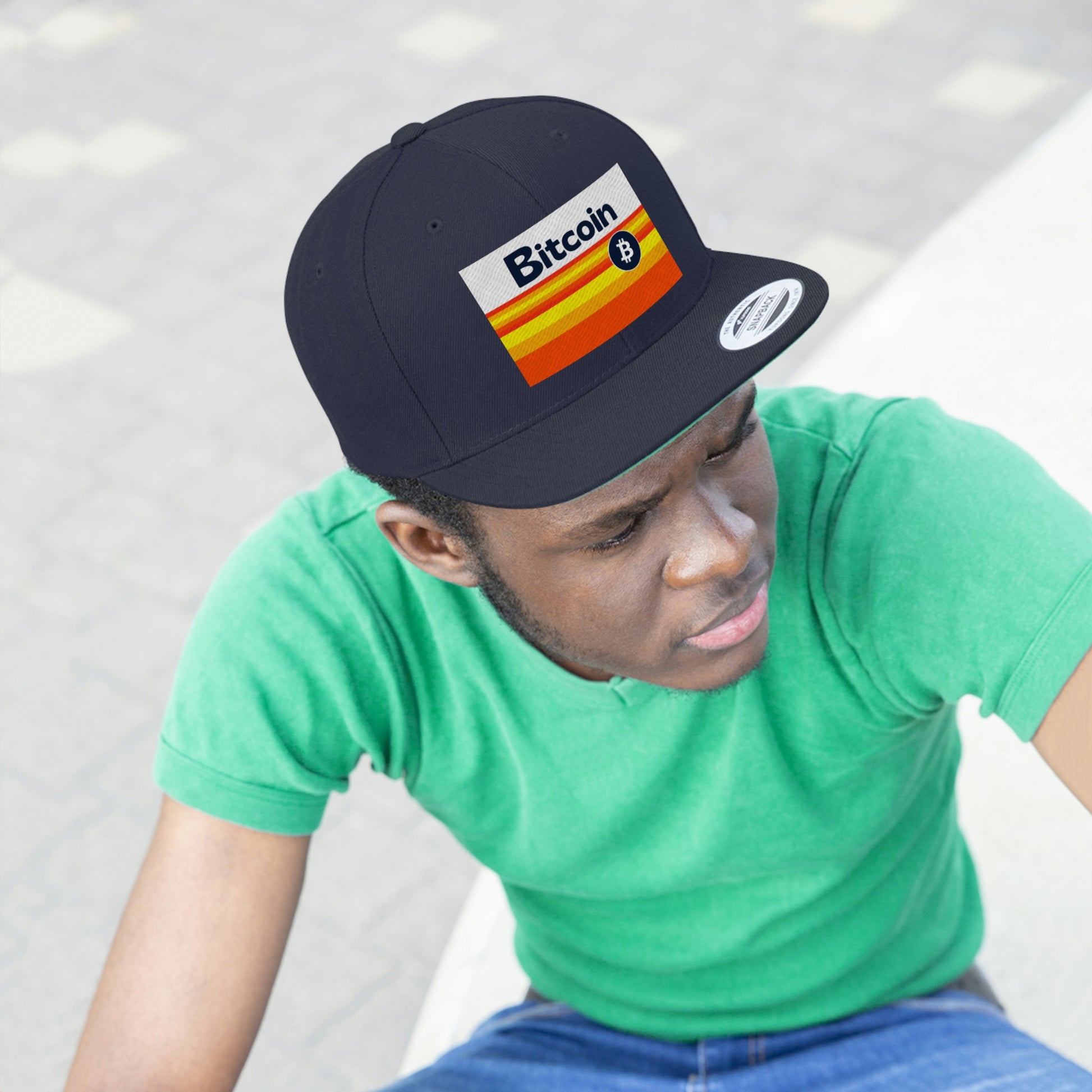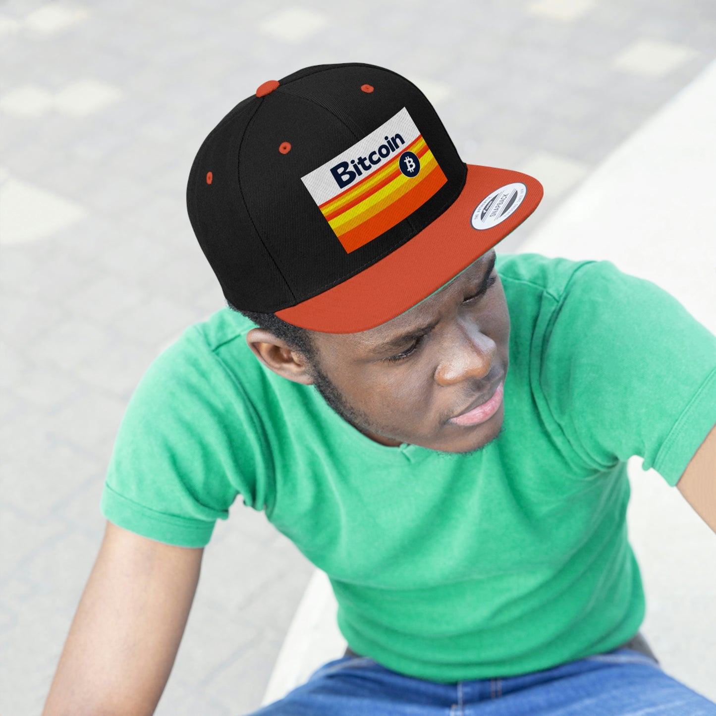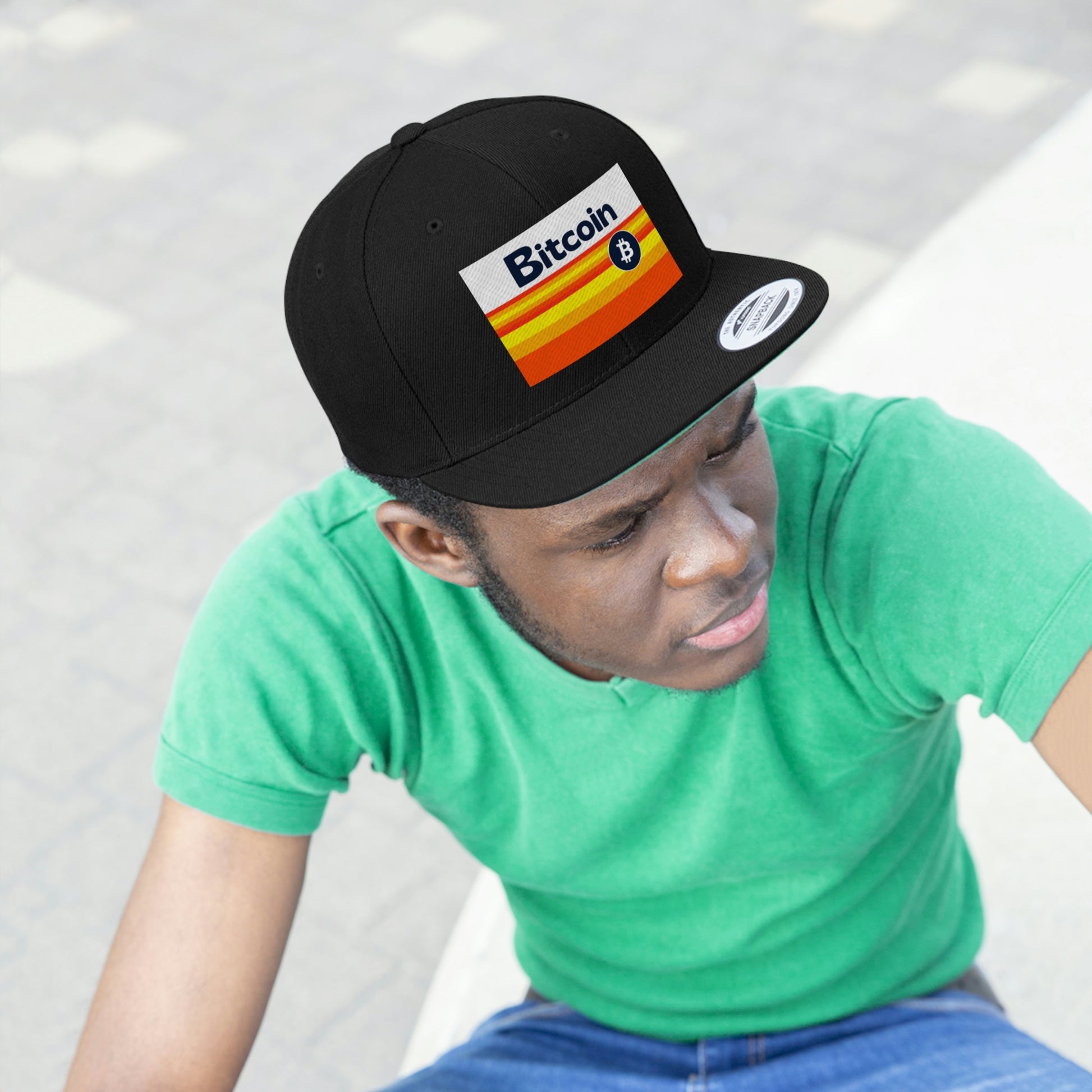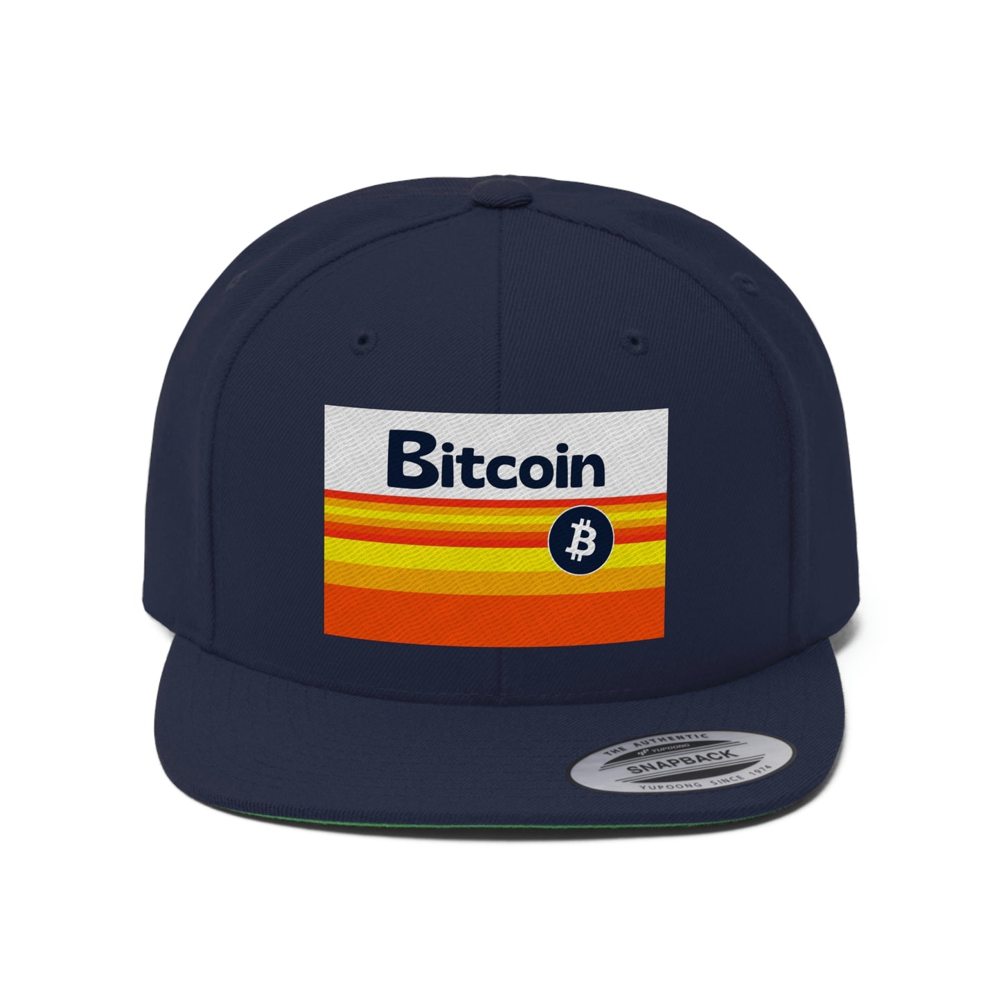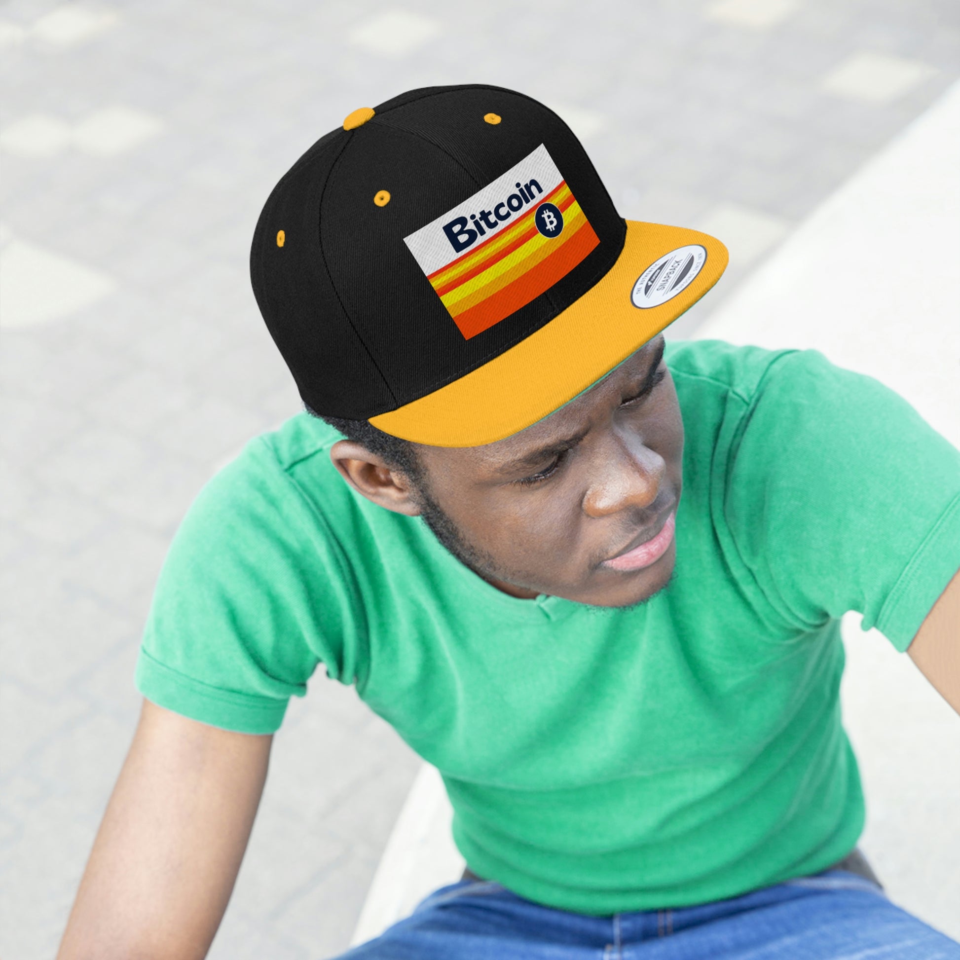 This Bitcoin 6-panel cap is a modern take on a classic design. This hat is the perfect choice thanks to its sharp styling, spirited color and lively green underbill. The old-school snapback closure and iconic flat bill add a subtle charm that takes you back to the good ol’ days ...with BTC laser eyes focused on the future. :-)