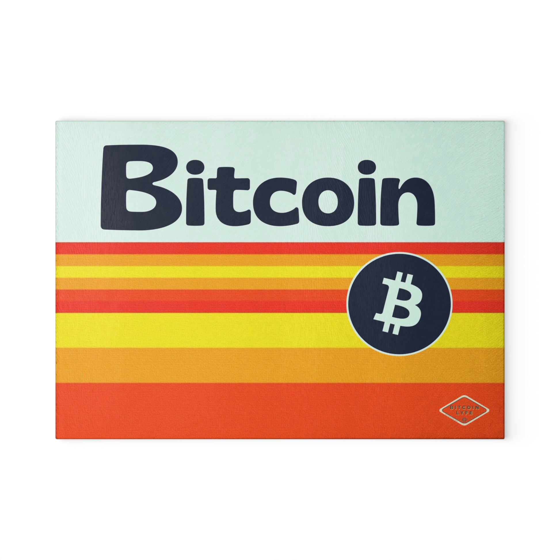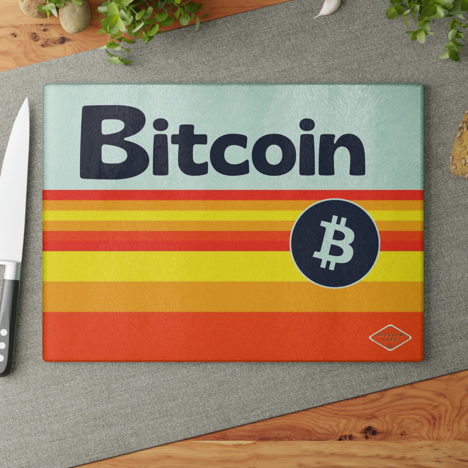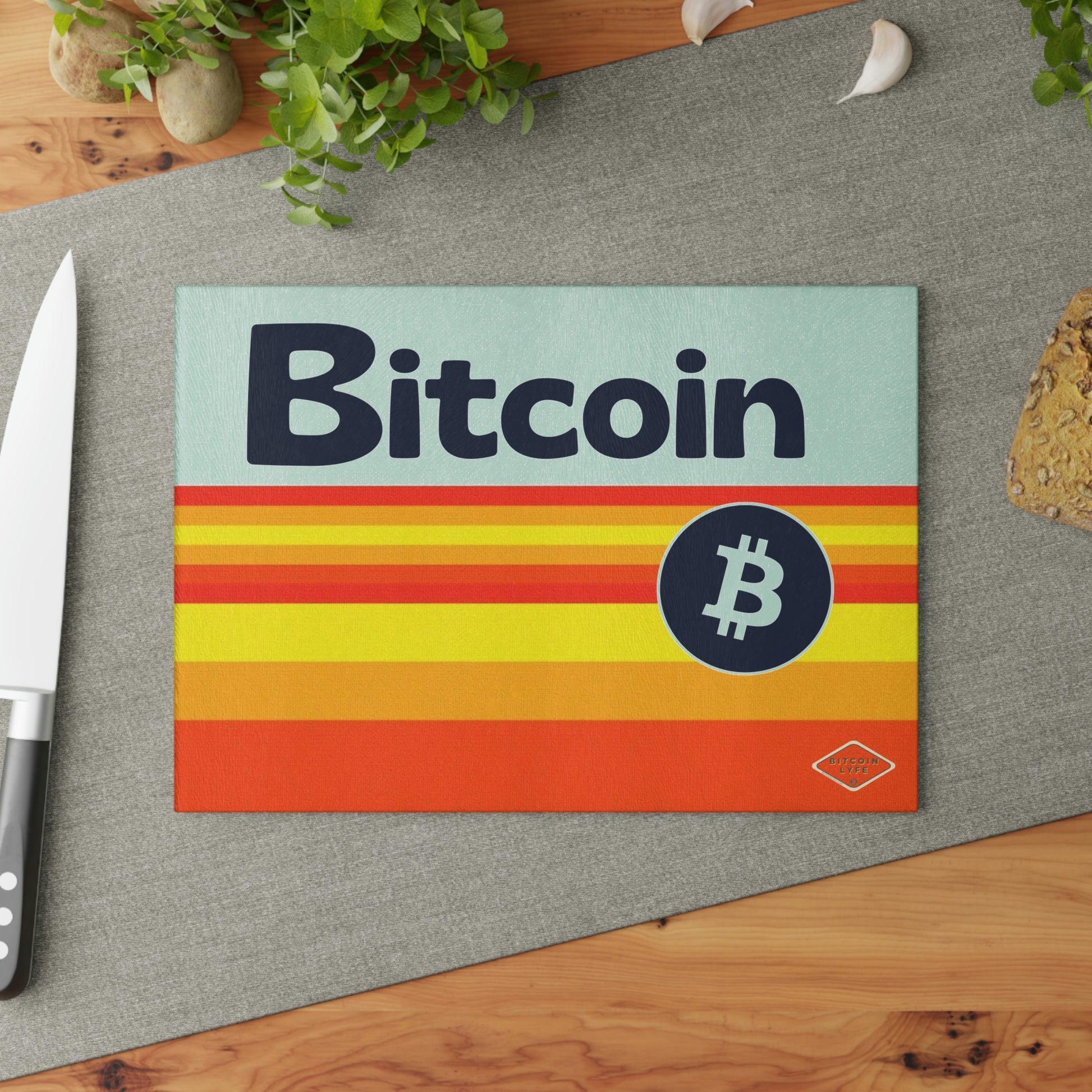 Bring a touch of character into any kitchen with this Bitcoin glass cutting board. Its tampered glass material is robust and helps prepare many a tasty meal for a long time to come. The textured surface makes it an ideal chopping, slicing, and dicing area. Available in two sizes: 8" x 11" and 11" x 15".
