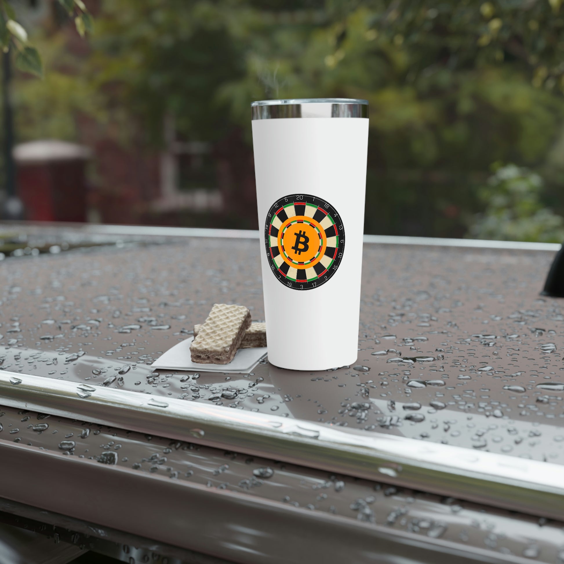 Stay hydrated in style on a daily basis with this Bitcoin tumbler. With a 22oz capacity and copper vacuum insulation, our tumbler keeps your favorite beverages refreshingly cold for 24 hours, and soothingly hot for up to 6. Its stainless steel exterior is condensation-resistant while the powder coating adds extra style points.