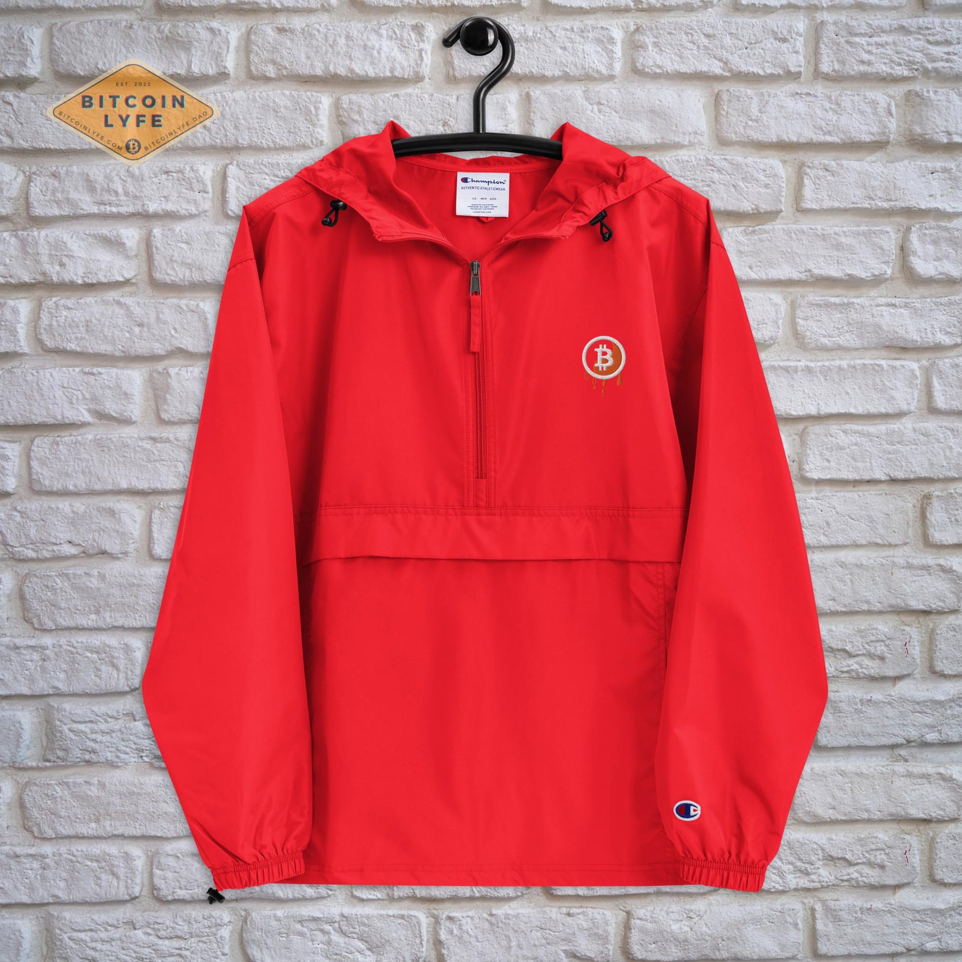 Protect yourself from the elements with this Bitcoin LYFE-Champion packable jacket. This wind and rain resistant polyester jacket with a detailed Bitcoin embroidery design has a practical hood, front kangaroo pocket, and zipped pouch pocket which you can pull out and use to scrunch the jacket into for convenient storage. With the right disposition, this may even be FUD repellant! Well, it’s worth a try anyway!