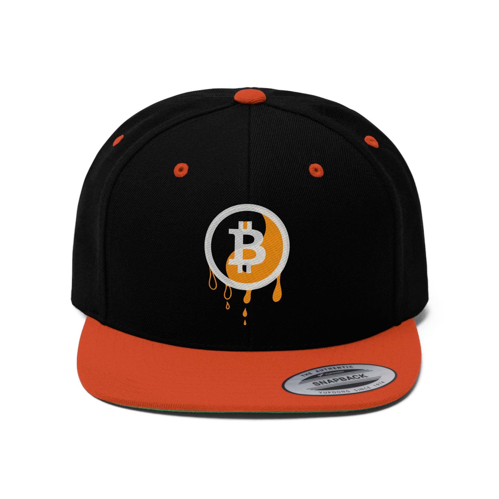 This Bitcoin 6-panel cap is a modern take on a classic design. This hat is the perfect choice thanks to its sharp styling, spirited color and lively green underbill. The old-school snapback closure and iconic flat bill add a subtle charm that takes you back to the good ol’ days ...with BTC laser eyes focused on the future. :-)