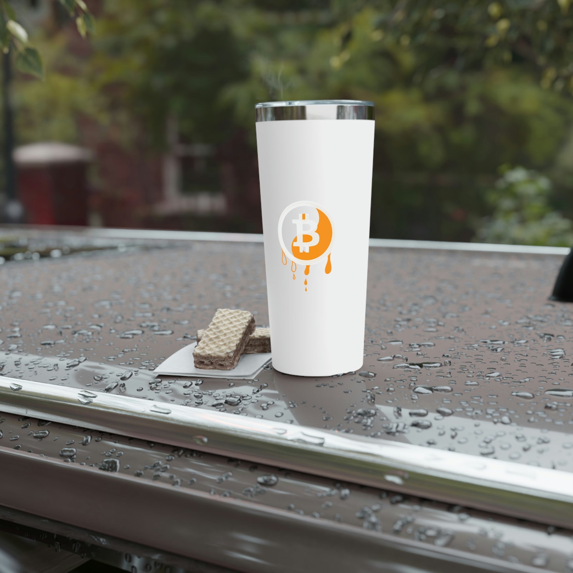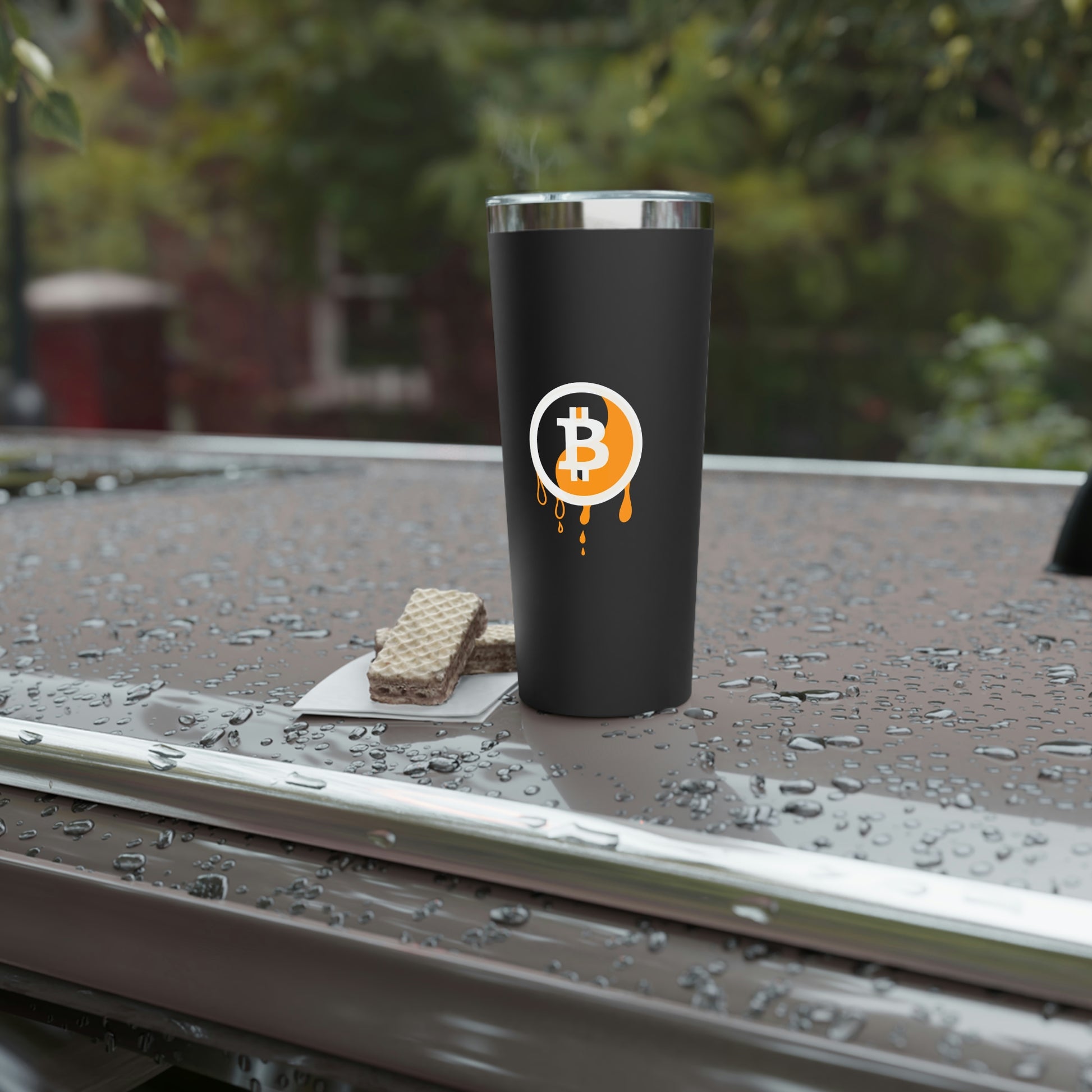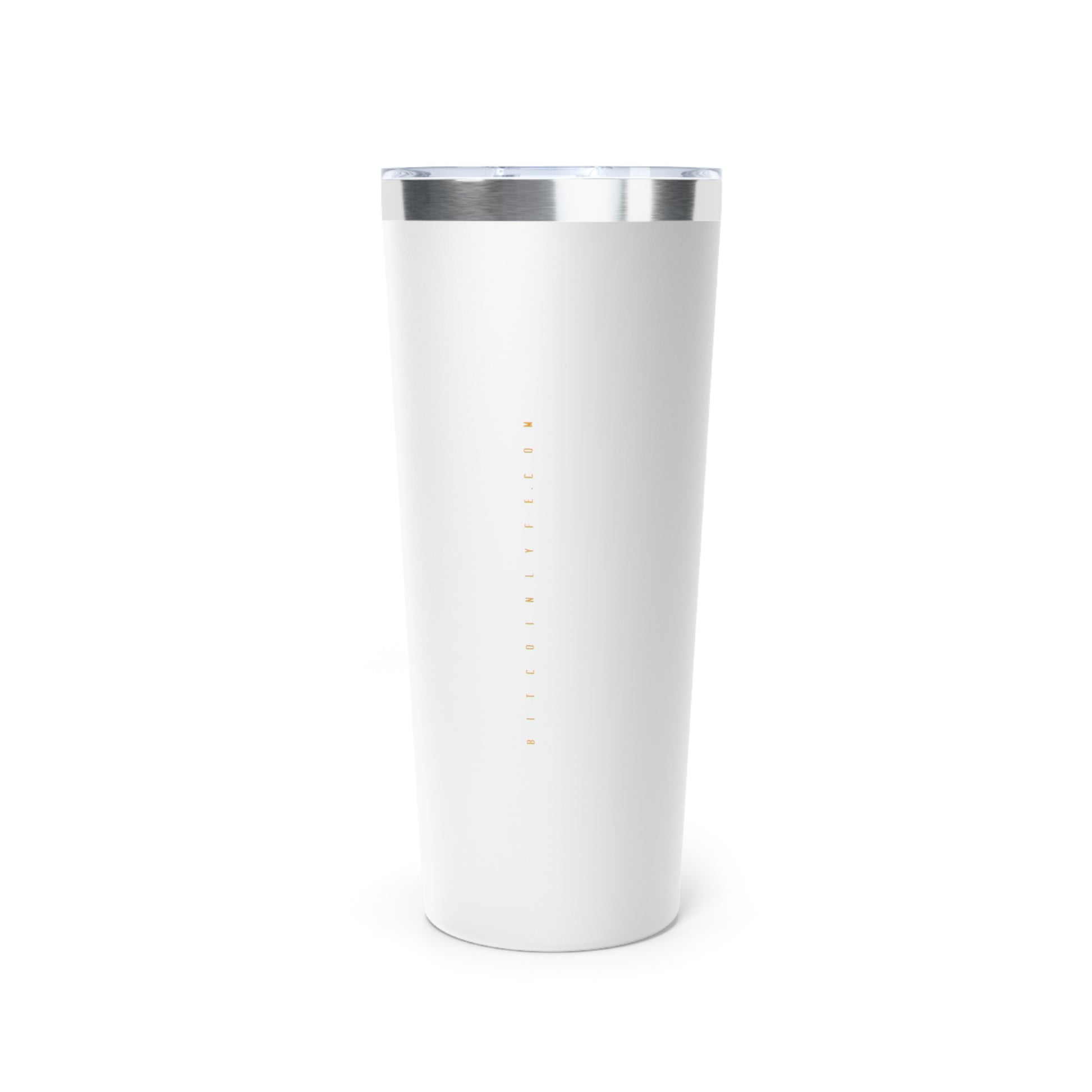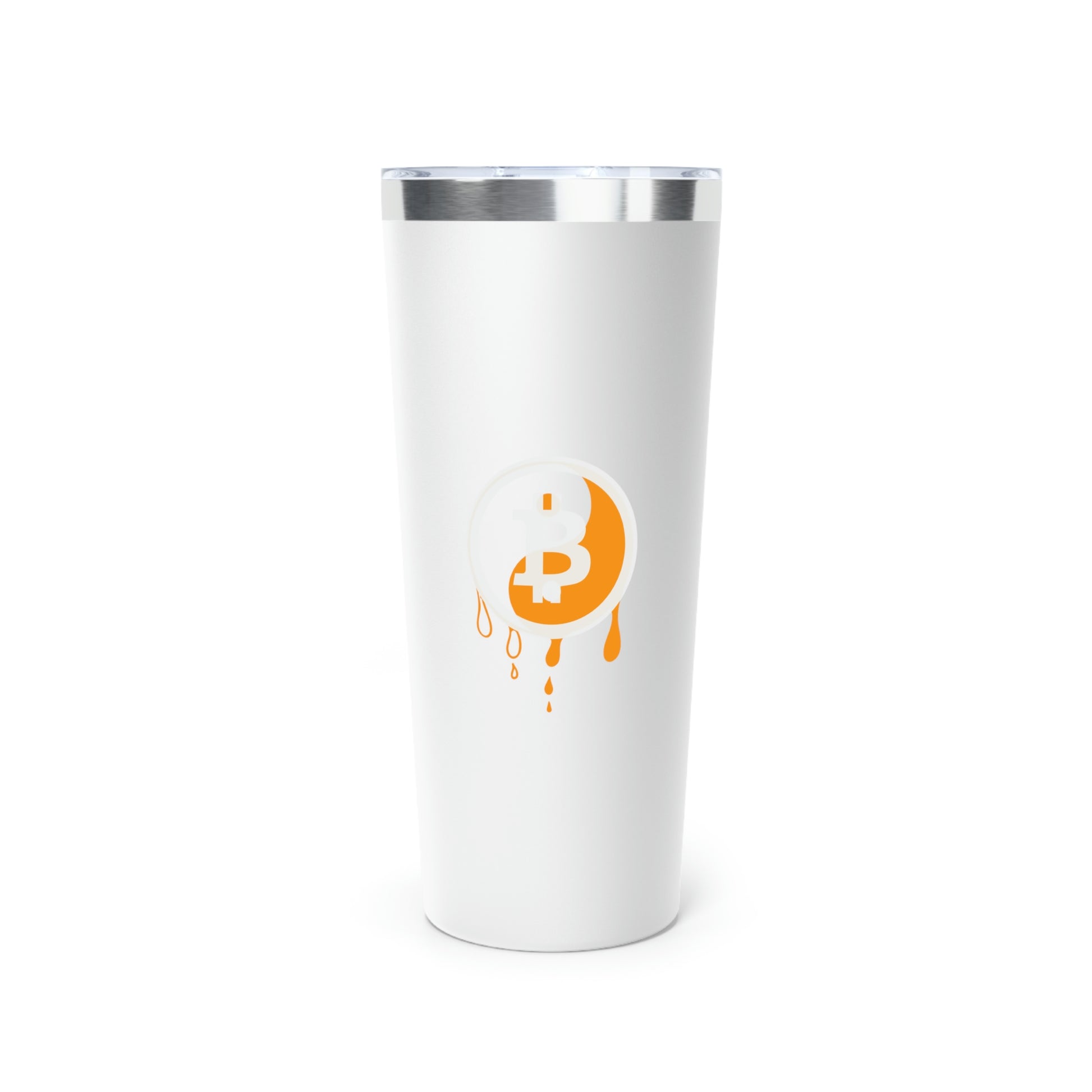 Stay hydrated in style on a daily basis with this Bitcoin tumbler. With a 22oz capacity and copper vacuum insulation, our tumbler keeps your favorite beverages refreshingly cold for 24 hours, and soothingly hot for up to 6. Its stainless steel exterior is condensation-resistant while the powder coating adds extra style points.