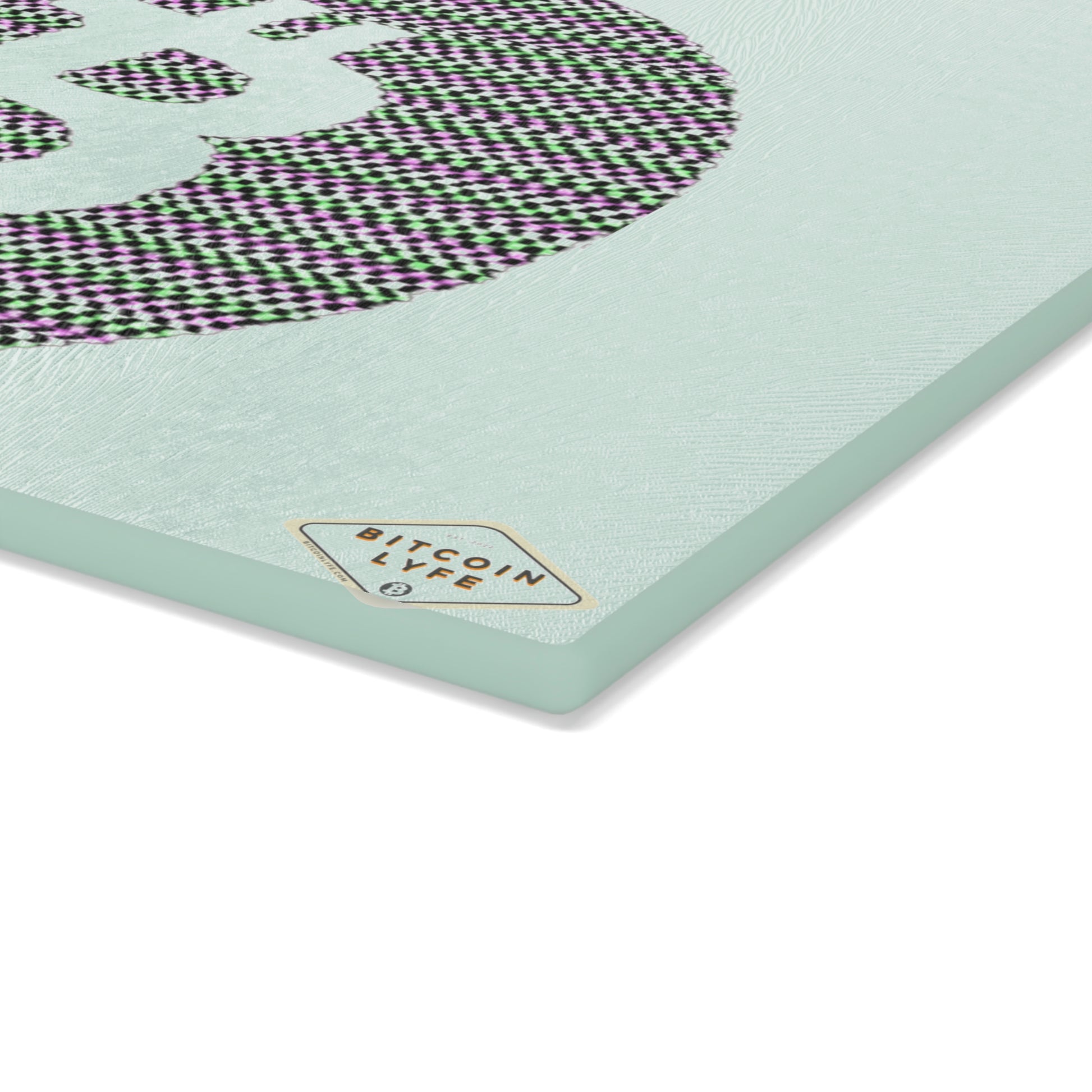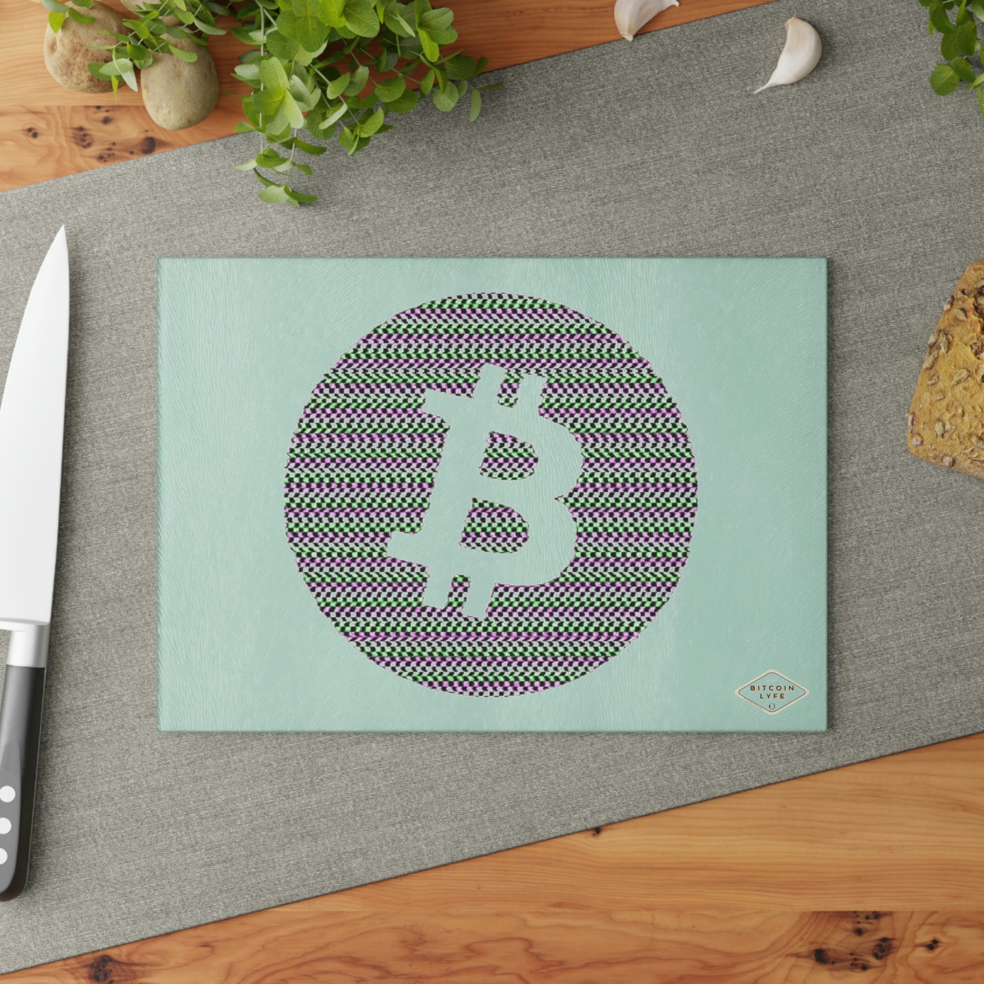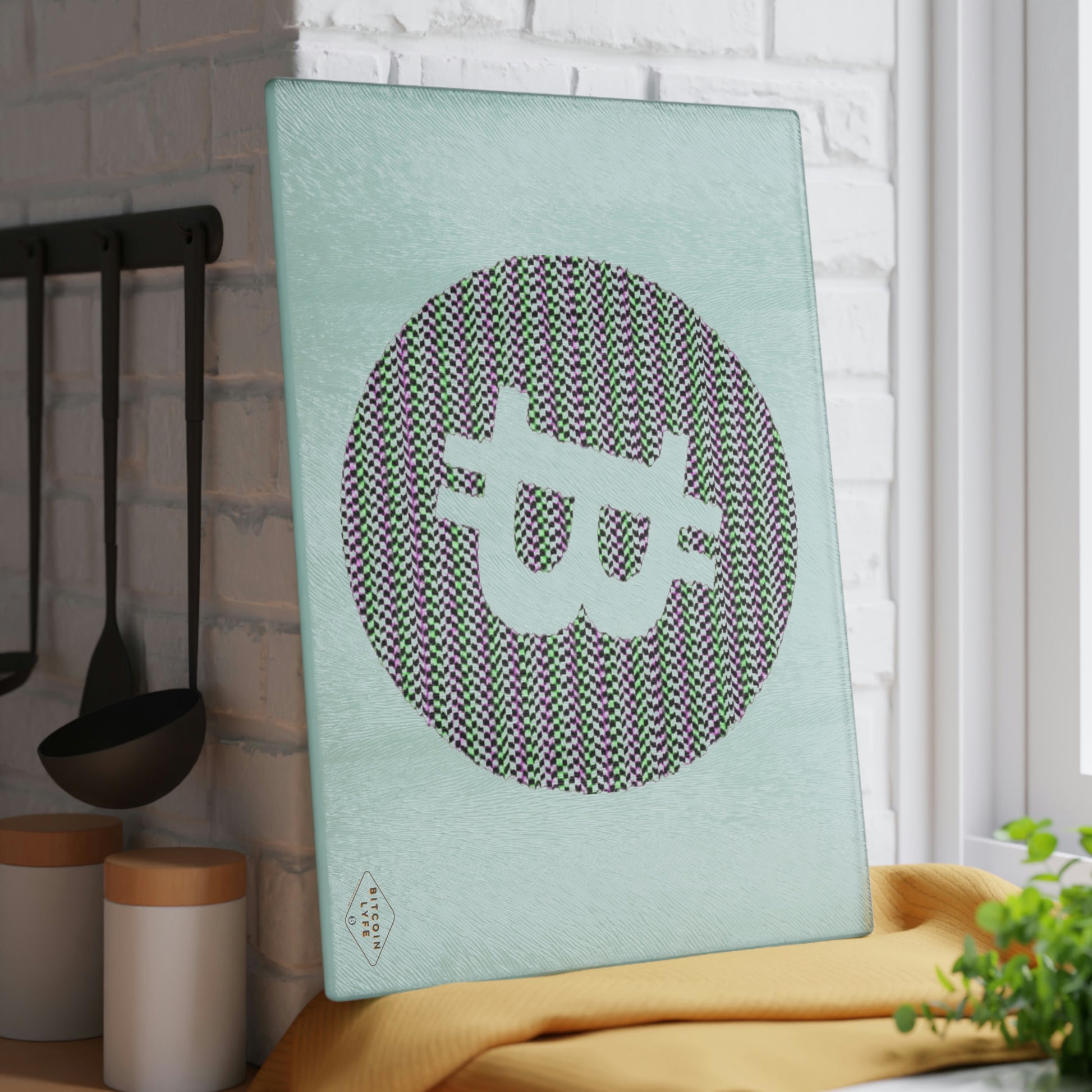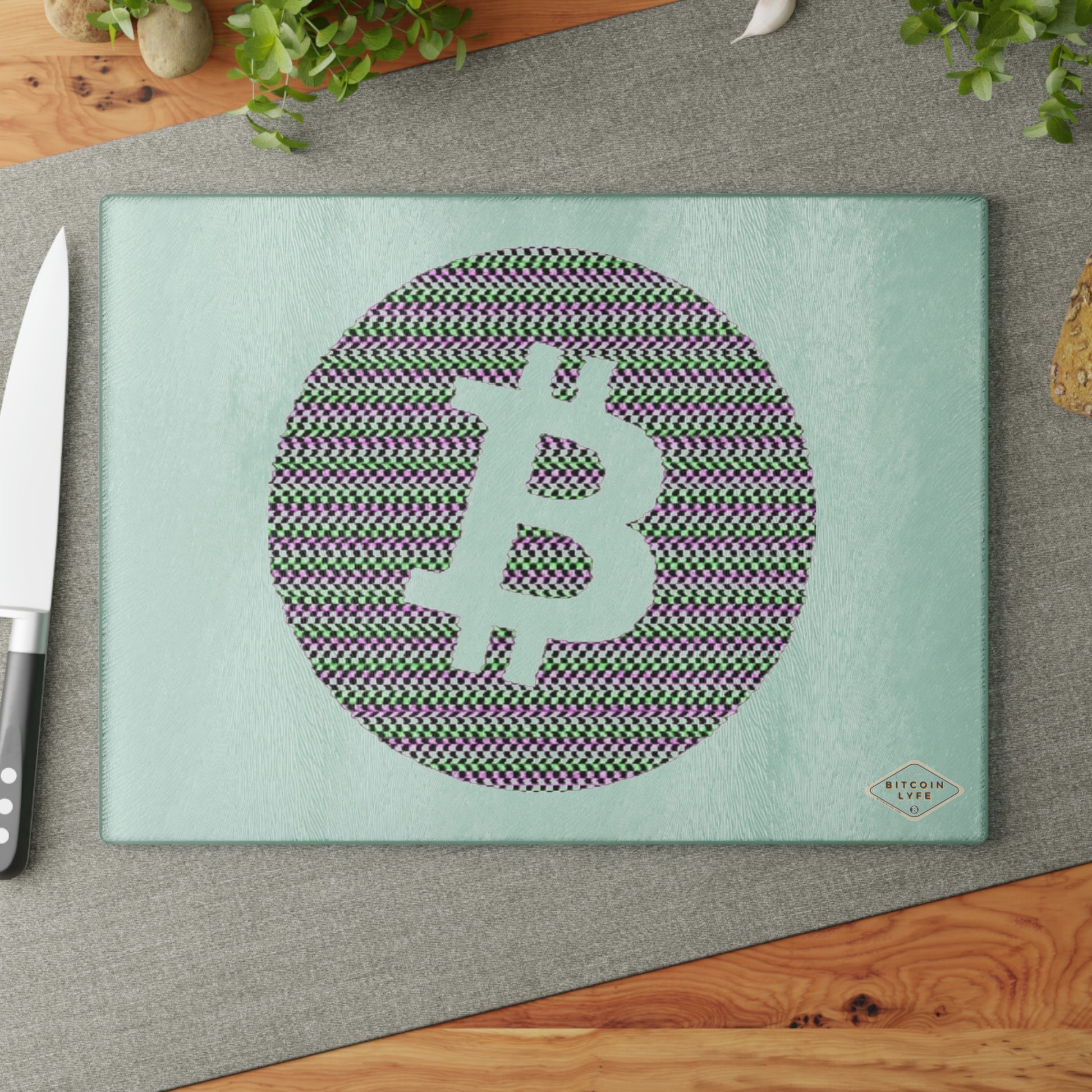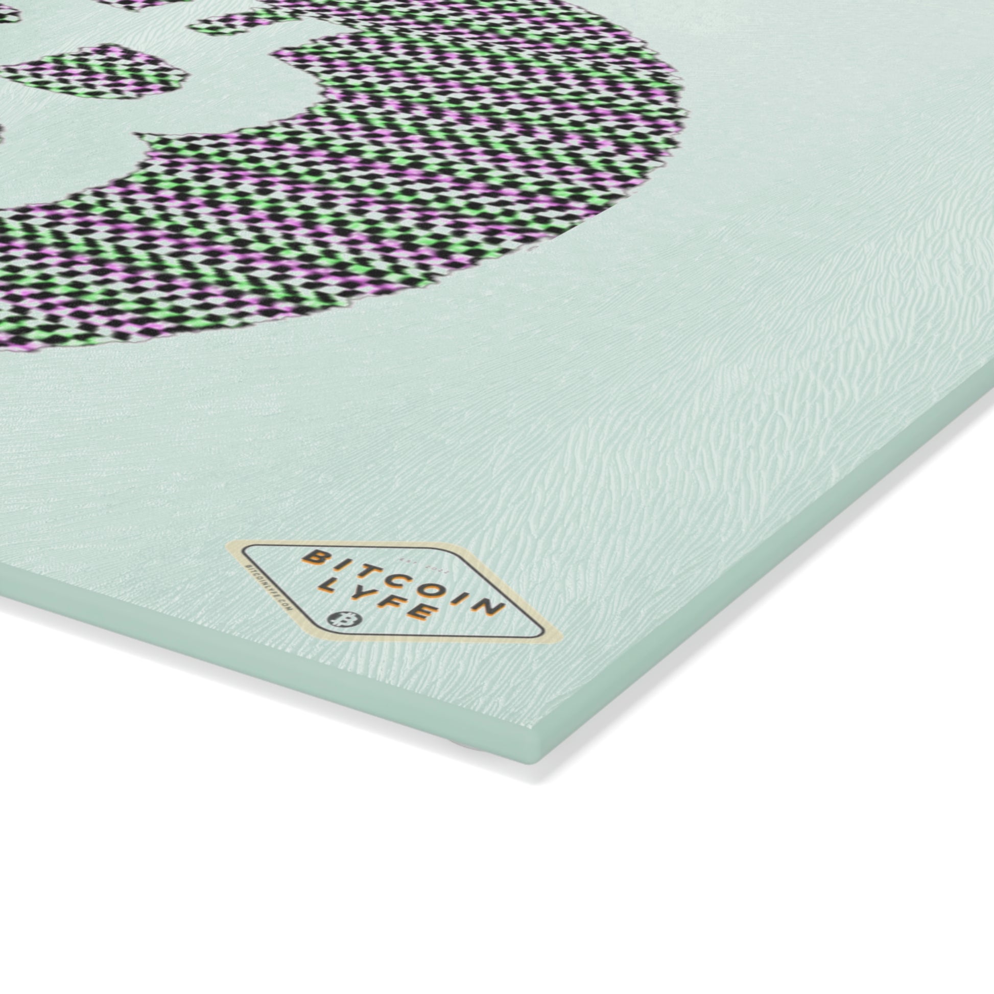 Bring a touch of character into any kitchen with this Bitcoin glass cutting board. Its tampered glass material is robust and helps prepare many a tasty meal for a long time to come. The textured surface makes it an ideal chopping, slicing, and dicing area. Available in two sizes: 8" x 11" and 11" x 15".