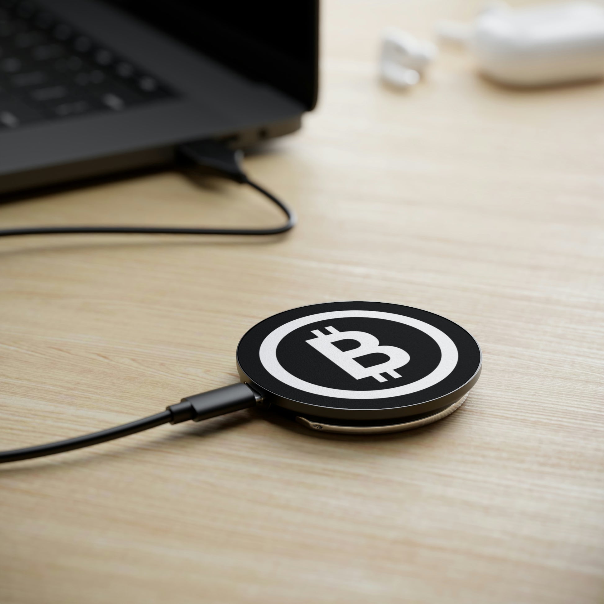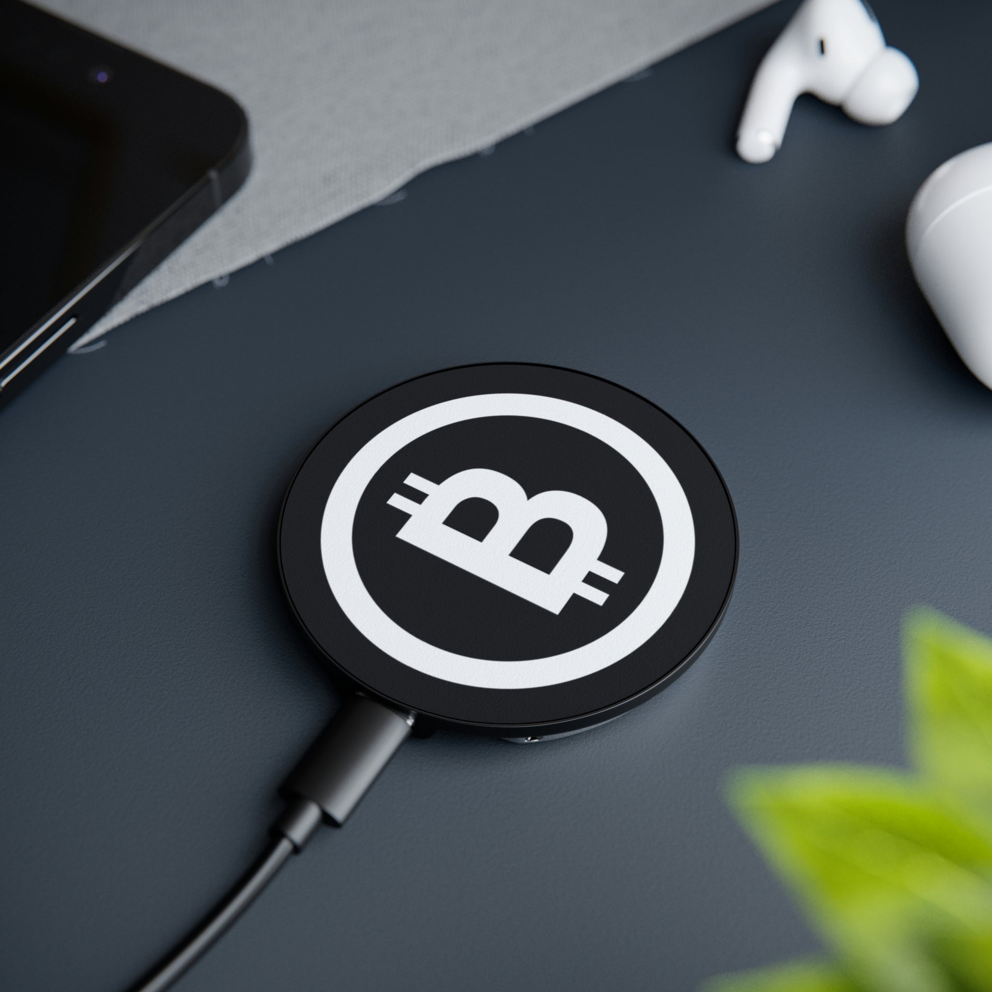 Created to satisfy gadget fans around the world, this Bitcoin wireless charger works universally with all wireless charging-compatible smartphones. With a slick black body, a matte white top, and a silver metal ring, it's a perfect way to subtlety plant a reminder of you conviction for Bitcoin in a tasteful and useful way. Comes with a built-in ring holder, supports Qi wireless charging standard and MagSafe function, and ships with a USB-C cable included.