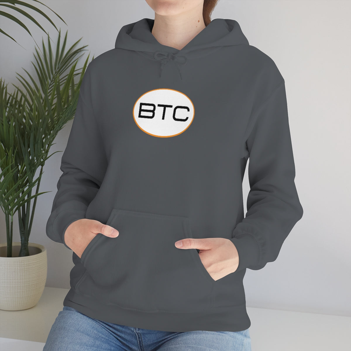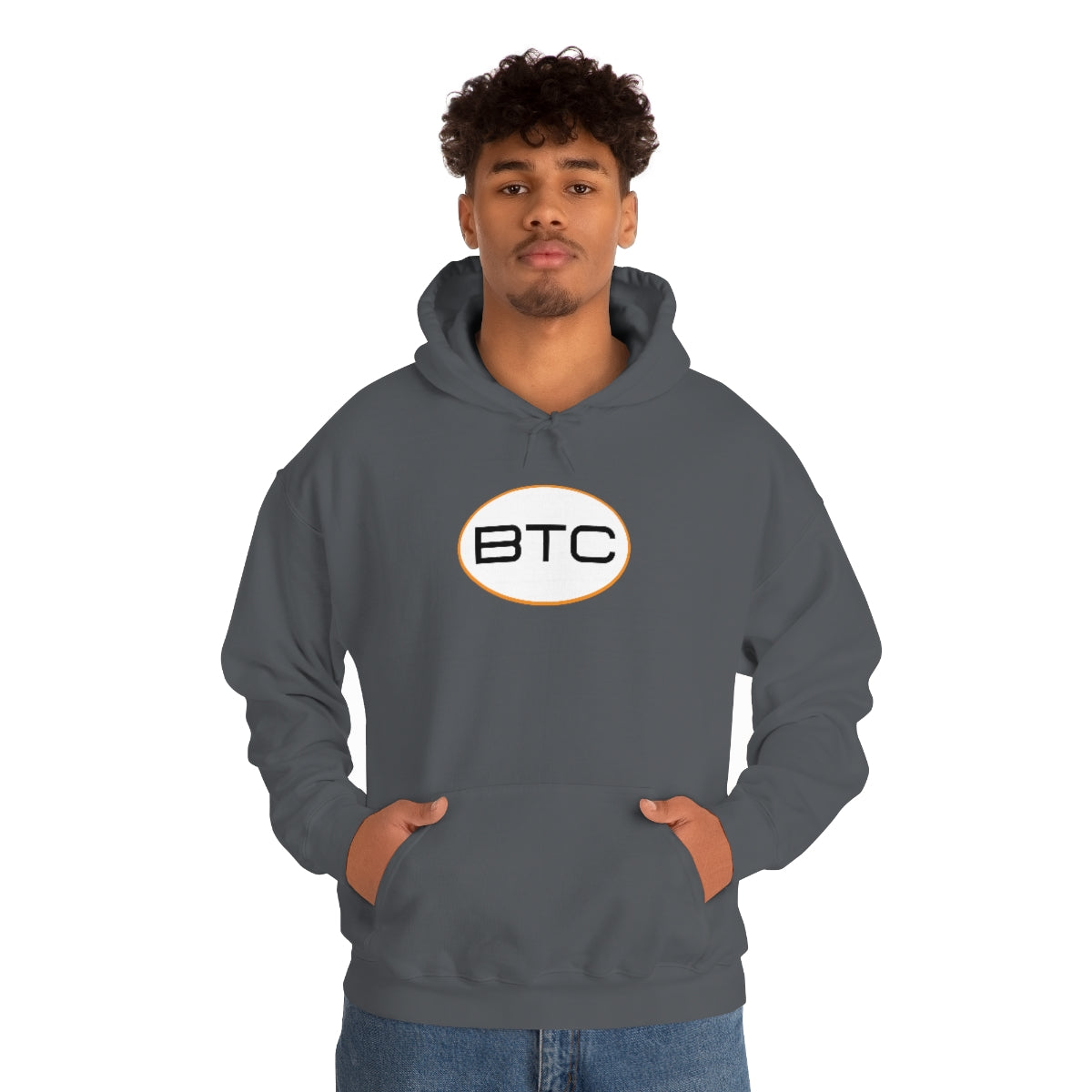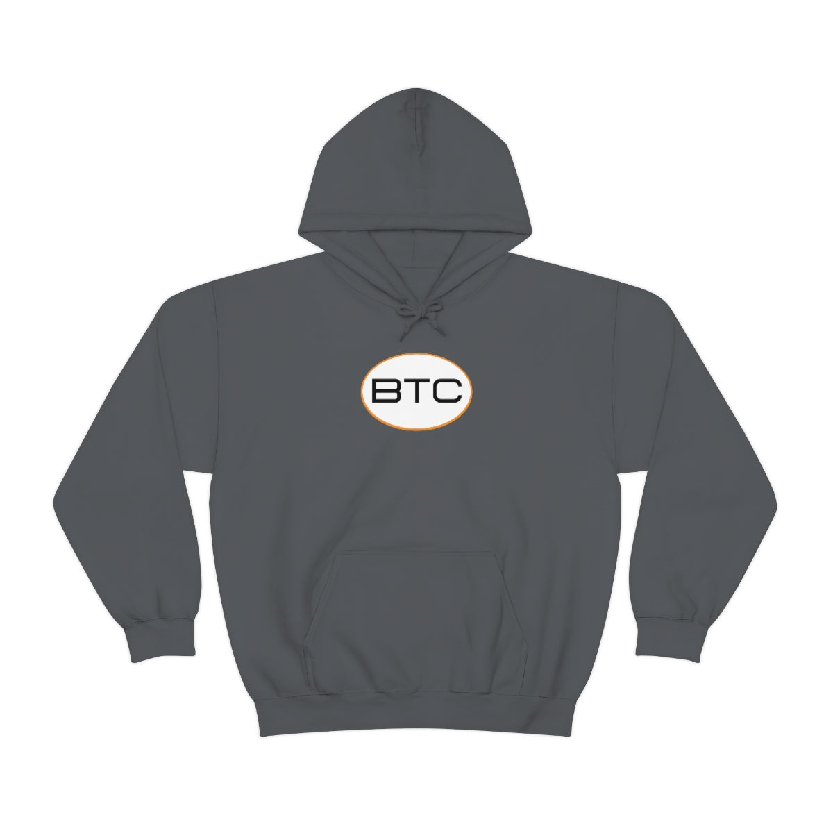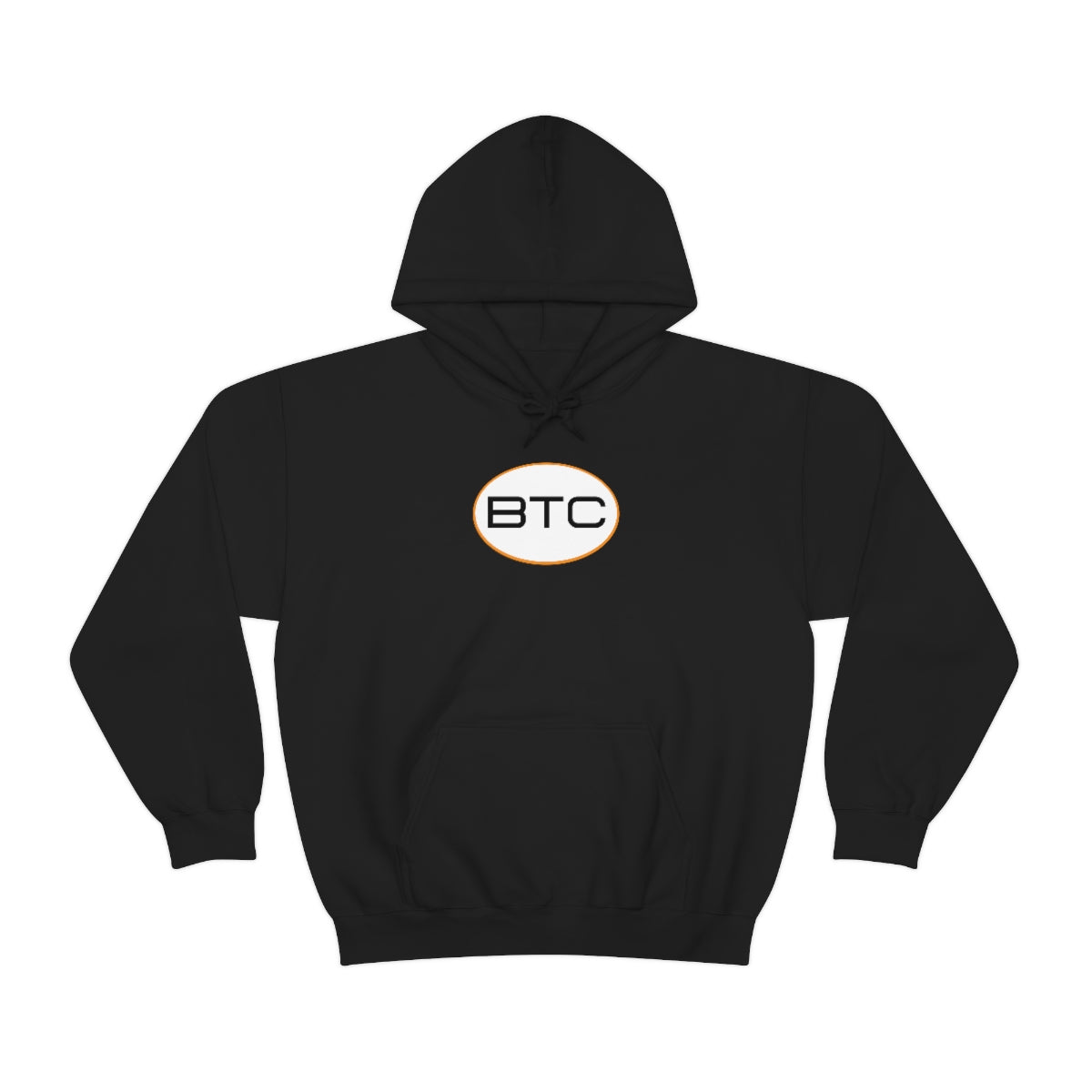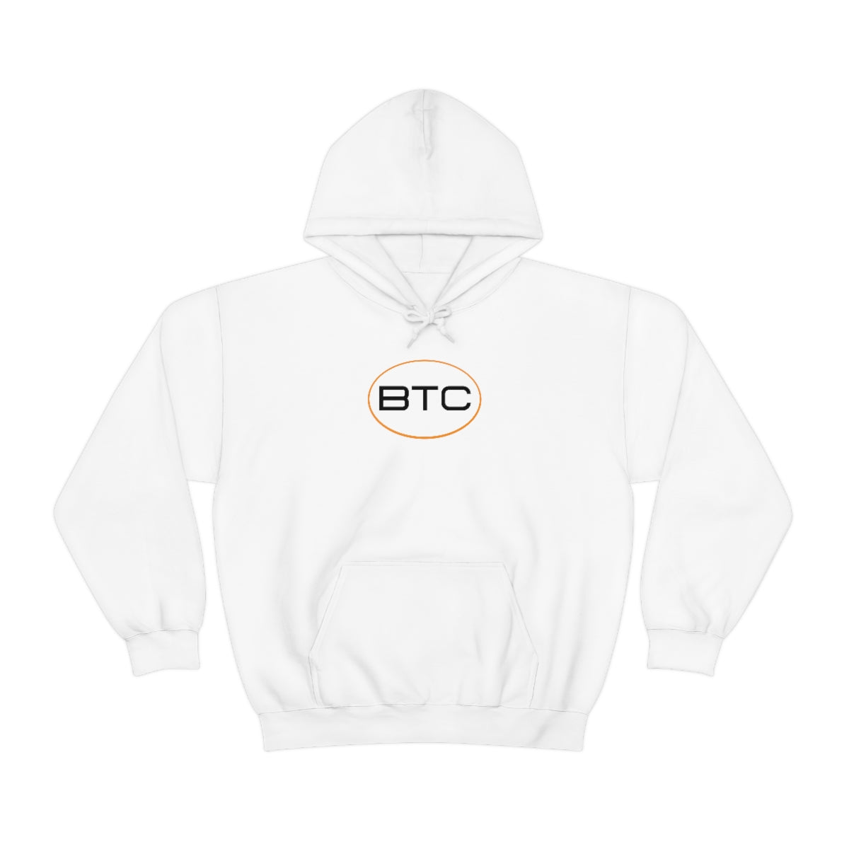 Show your pride in Bitcoin with this awesome hoodie with BTC logo inspired by the European country code decals. This unisex heavy blend hooded sweatshirt is relaxation itself. Made with a thick blend of cotton and polyester, it feels plush, soft and warm, a perfect choice for any cold day. In the front, the spacious kangaroo pocket adds daily practicality while the hood's drawstring is the same color as the base sweater for extra style points.