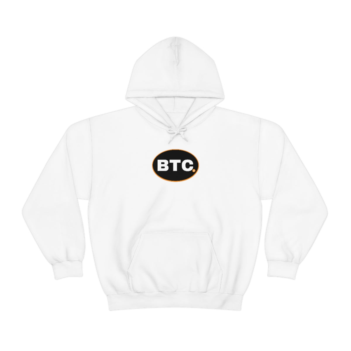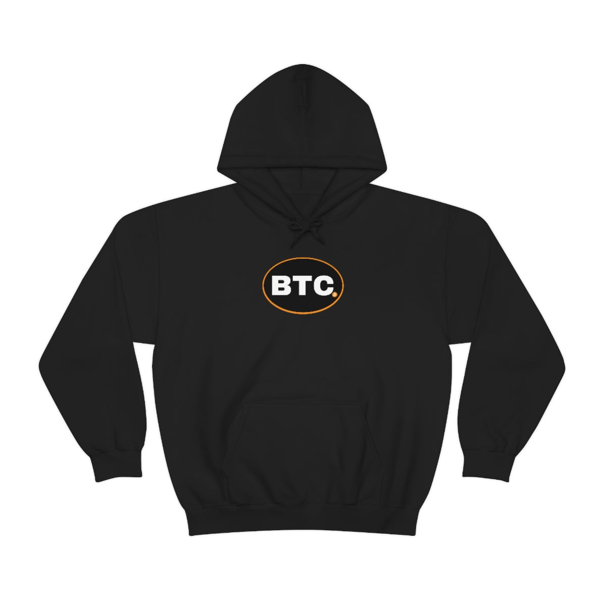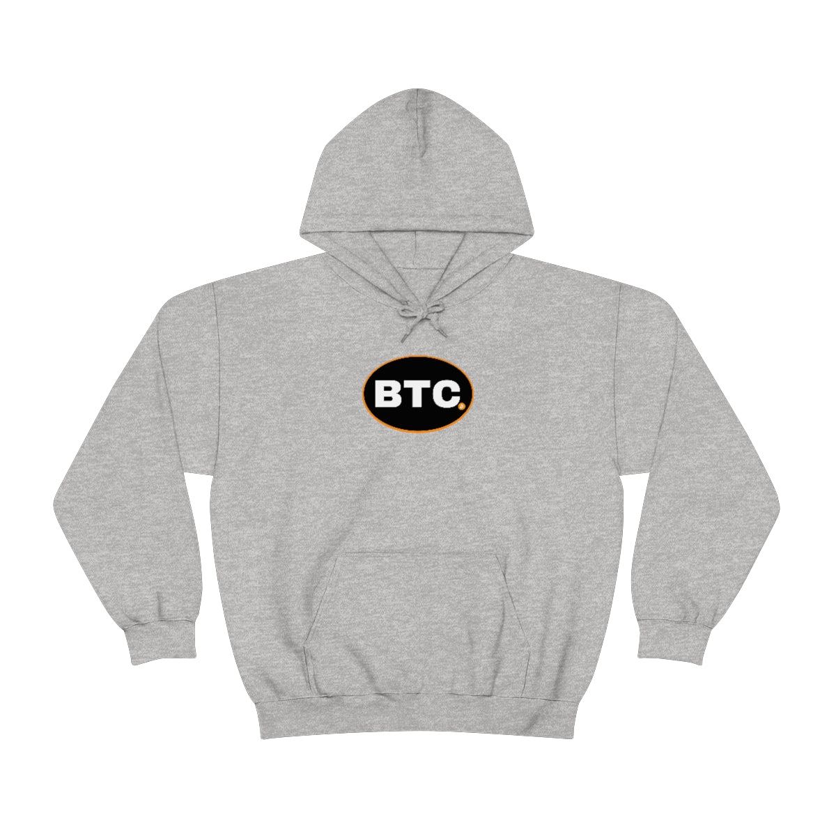 Show your pride in Bitcoin with this awesome hoodie with BTC logo inspired by the European country code decals. This unisex heavy blend hooded sweatshirt is relaxation itself. Made with a thick blend of cotton and polyester, it feels plush, soft and warm, a perfect choice for any cold day. In the front, the spacious kangaroo pocket adds daily practicality while the hood's drawstring is the same color as the base sweater for extra style points.