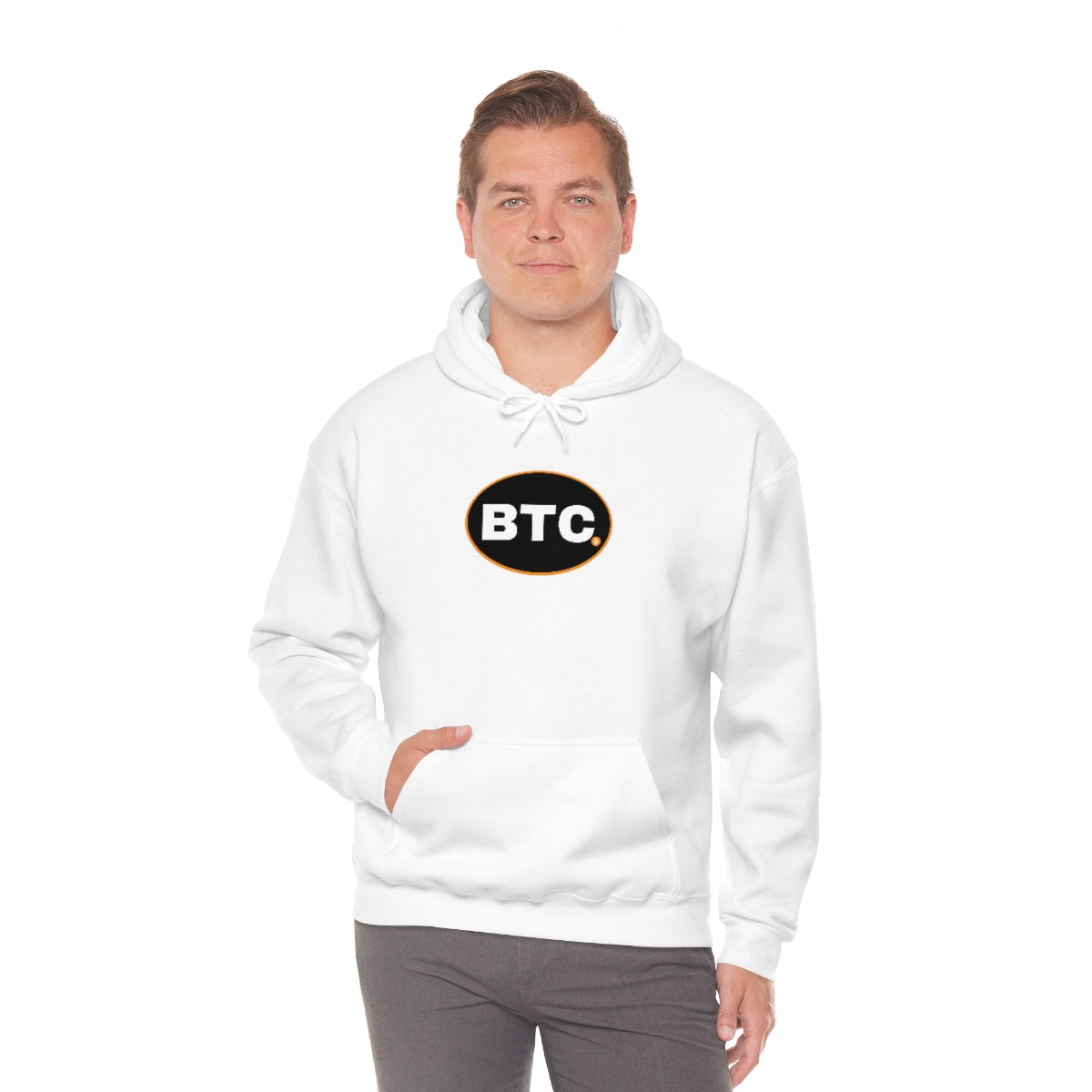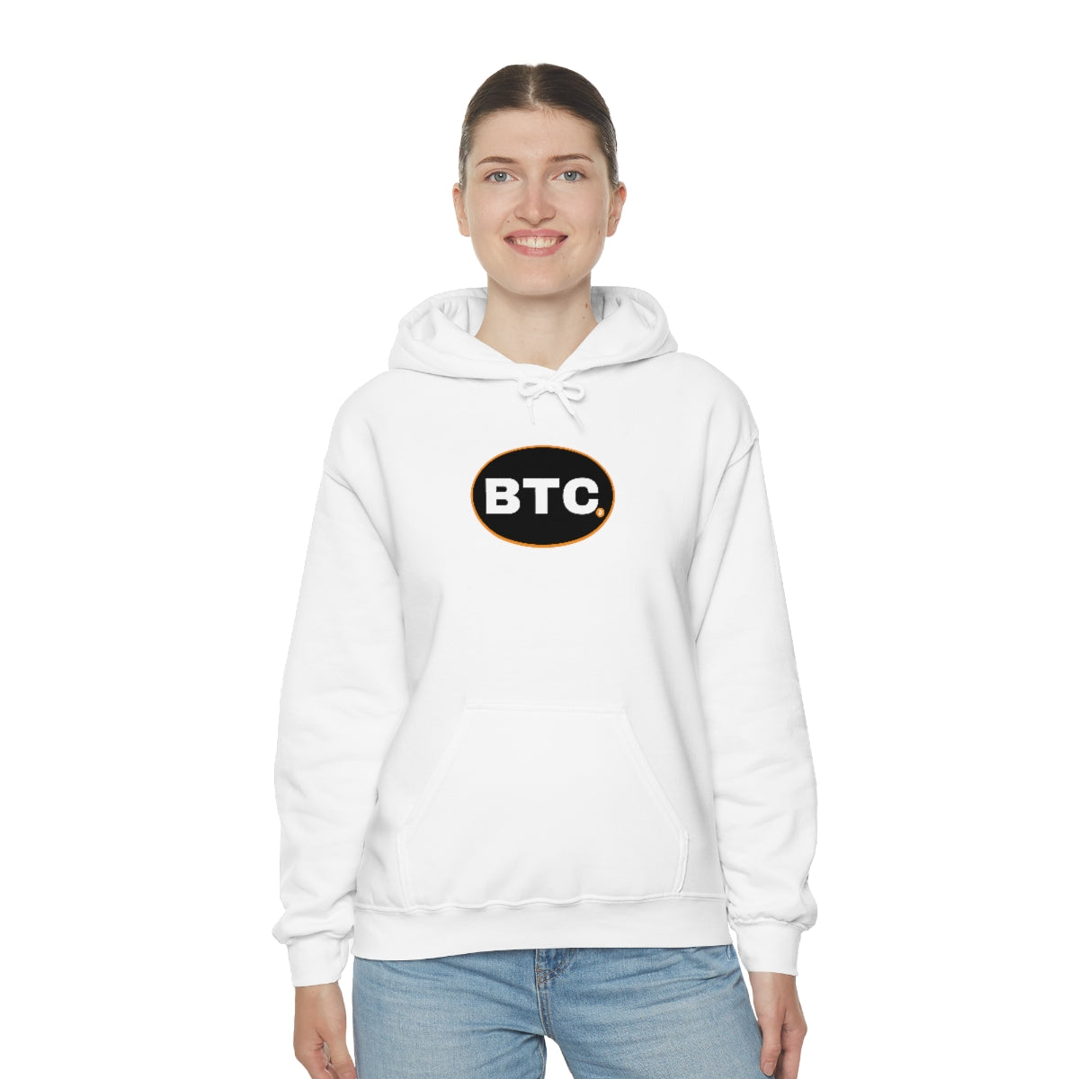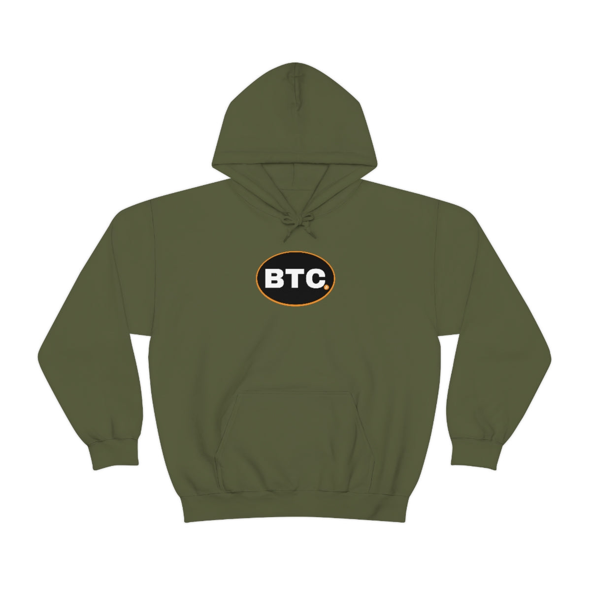 Show your pride in Bitcoin with this awesome hoodie with BTC logo inspired by the European country code decals. This unisex heavy blend hooded sweatshirt is relaxation itself. Made with a thick blend of cotton and polyester, it feels plush, soft and warm, a perfect choice for any cold day. In the front, the spacious kangaroo pocket adds daily practicality while the hood's drawstring is the same color as the base sweater for extra style points.