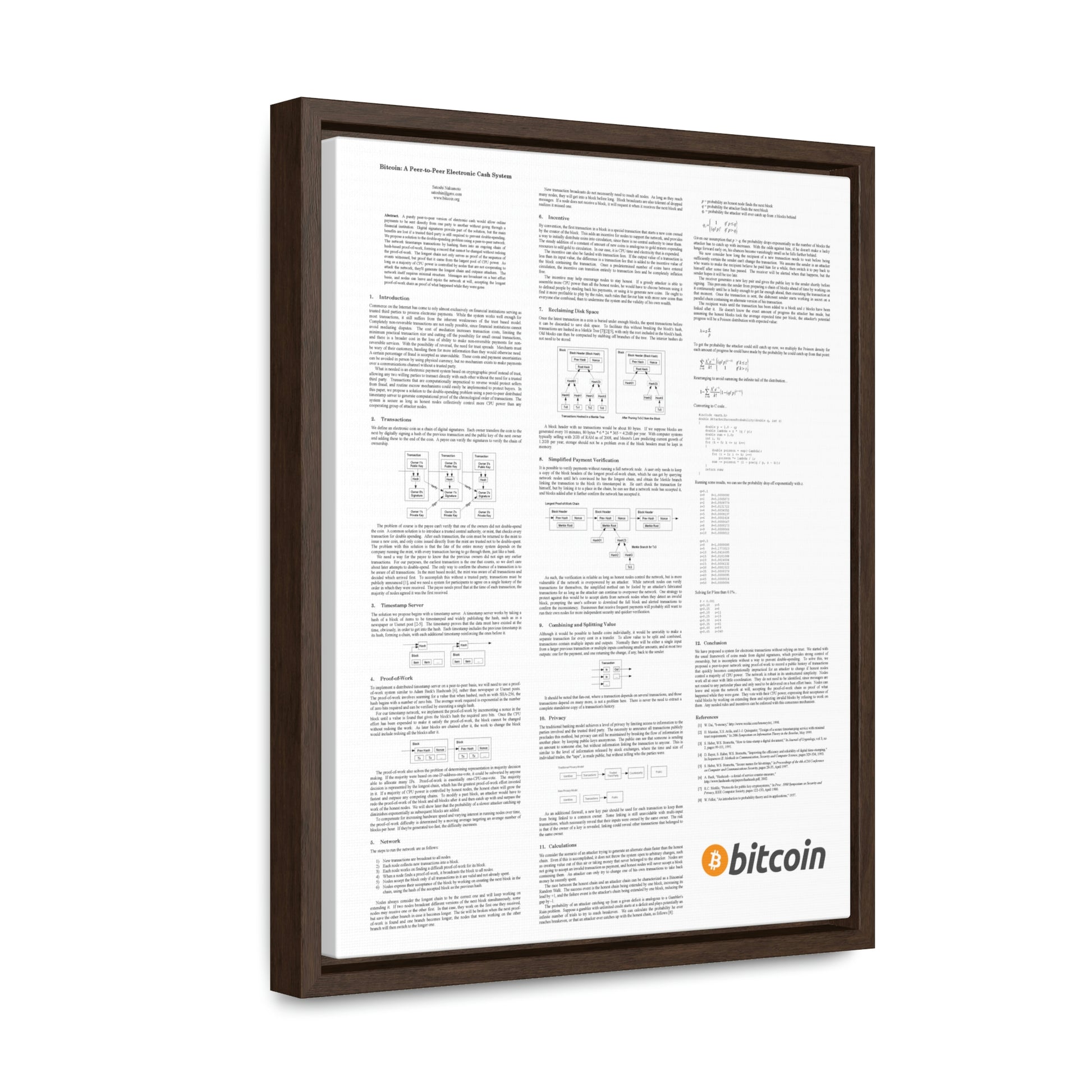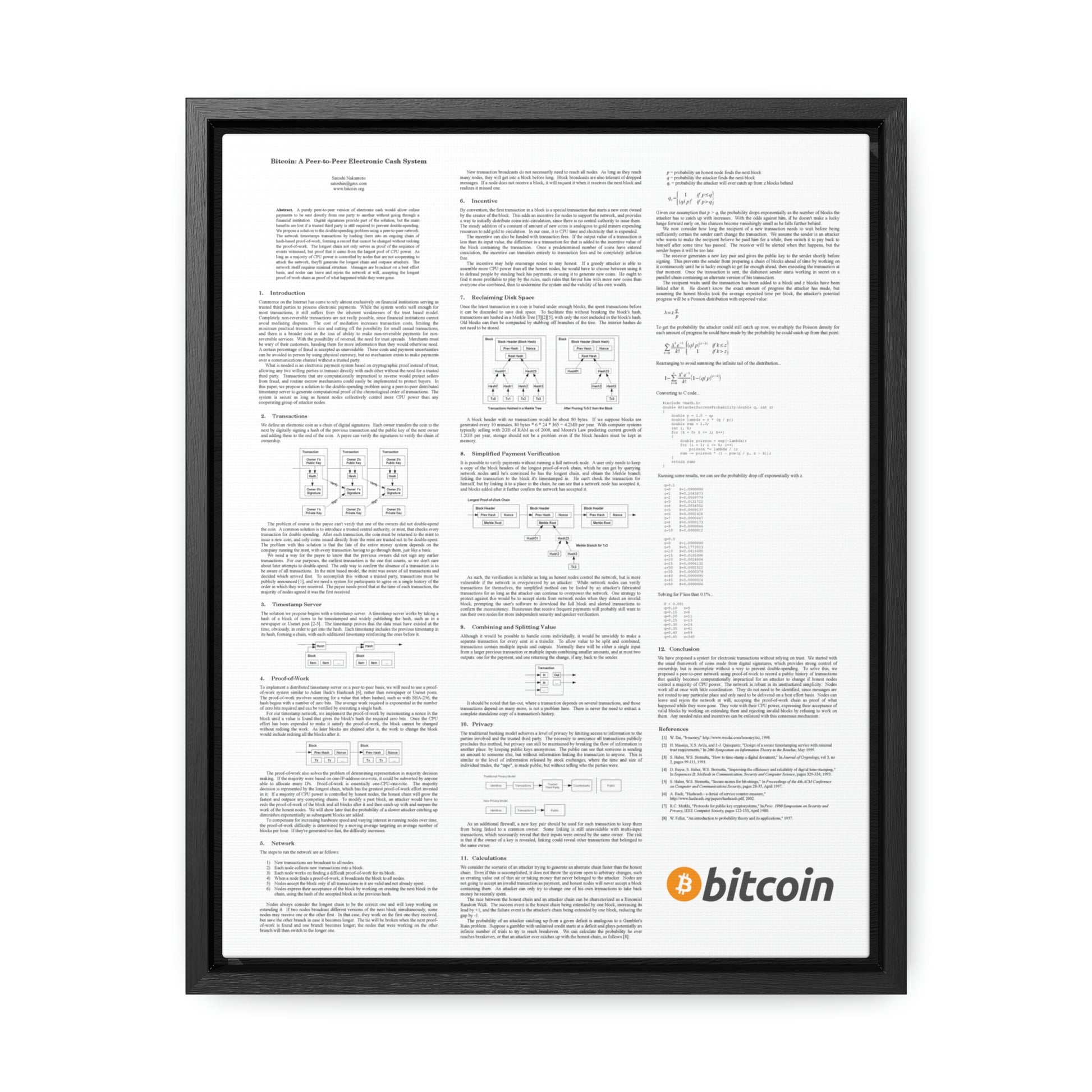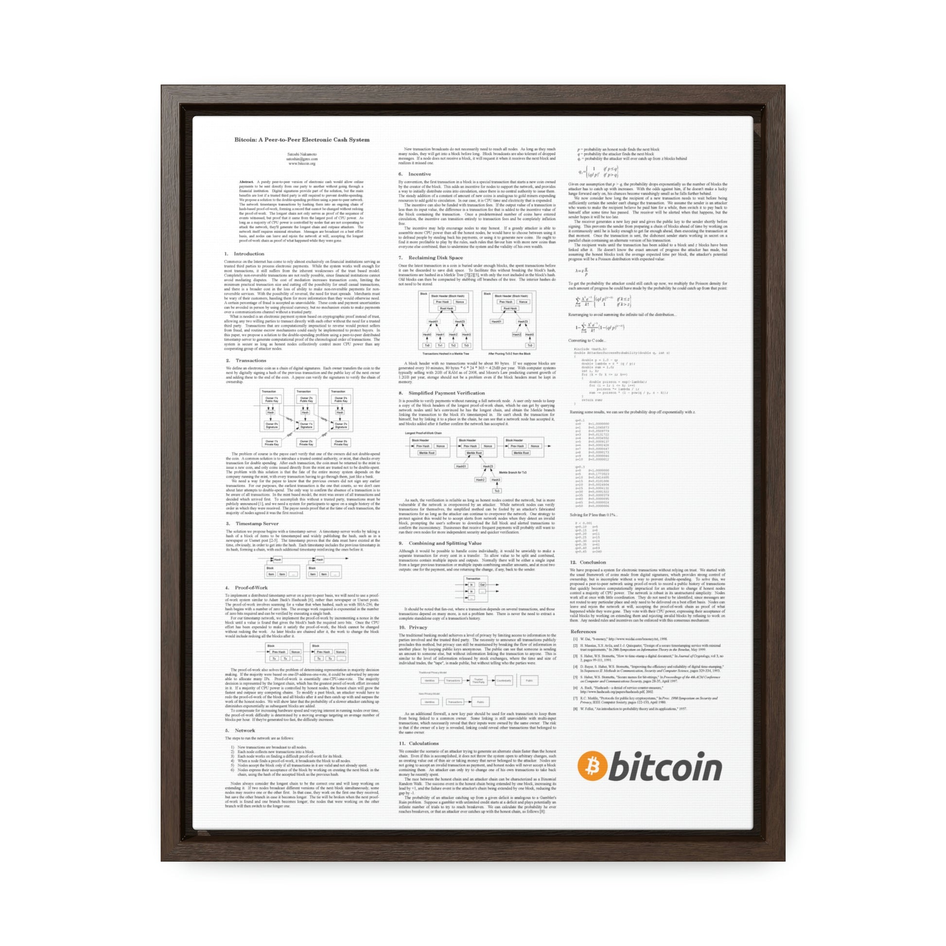 Let your personality be reflected by adorning your walls with the Bitcoin White Paper. This vertical gallery wrapped canvas print will always look as tight and flat as the day it was made. Every frame is built with a solid face to support the canvas and prevent deforming. Available in multiple sizes, comes in walnut and black frame options.