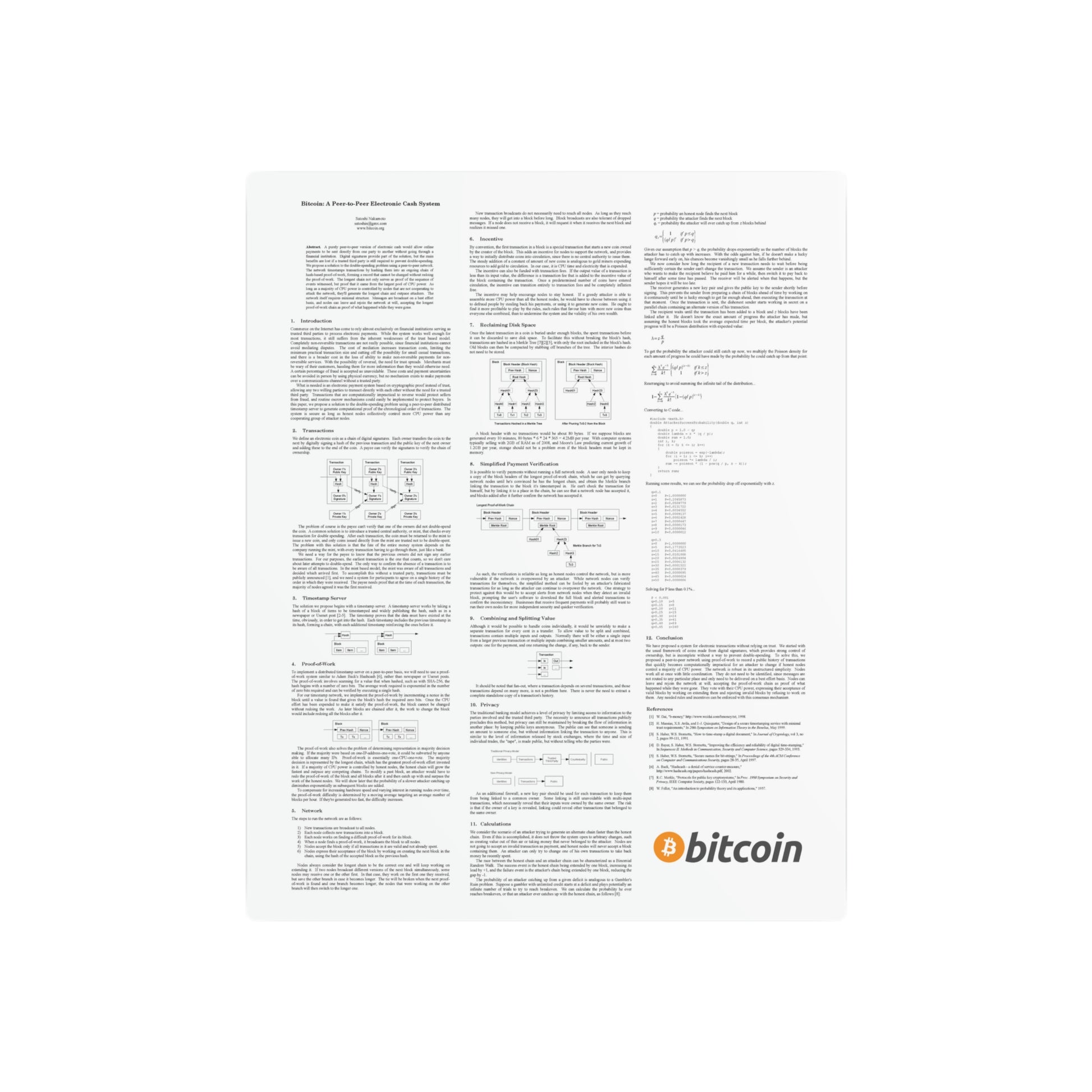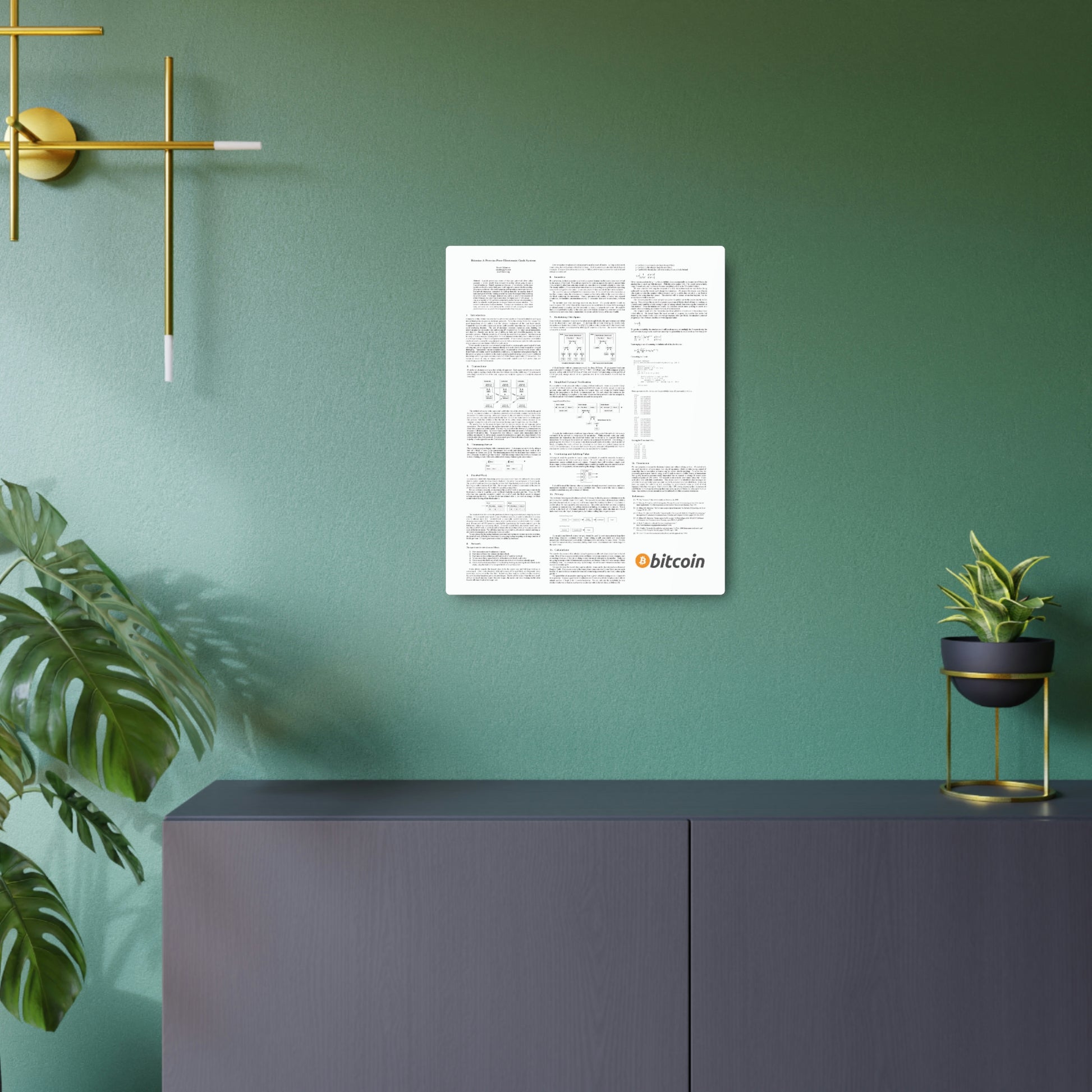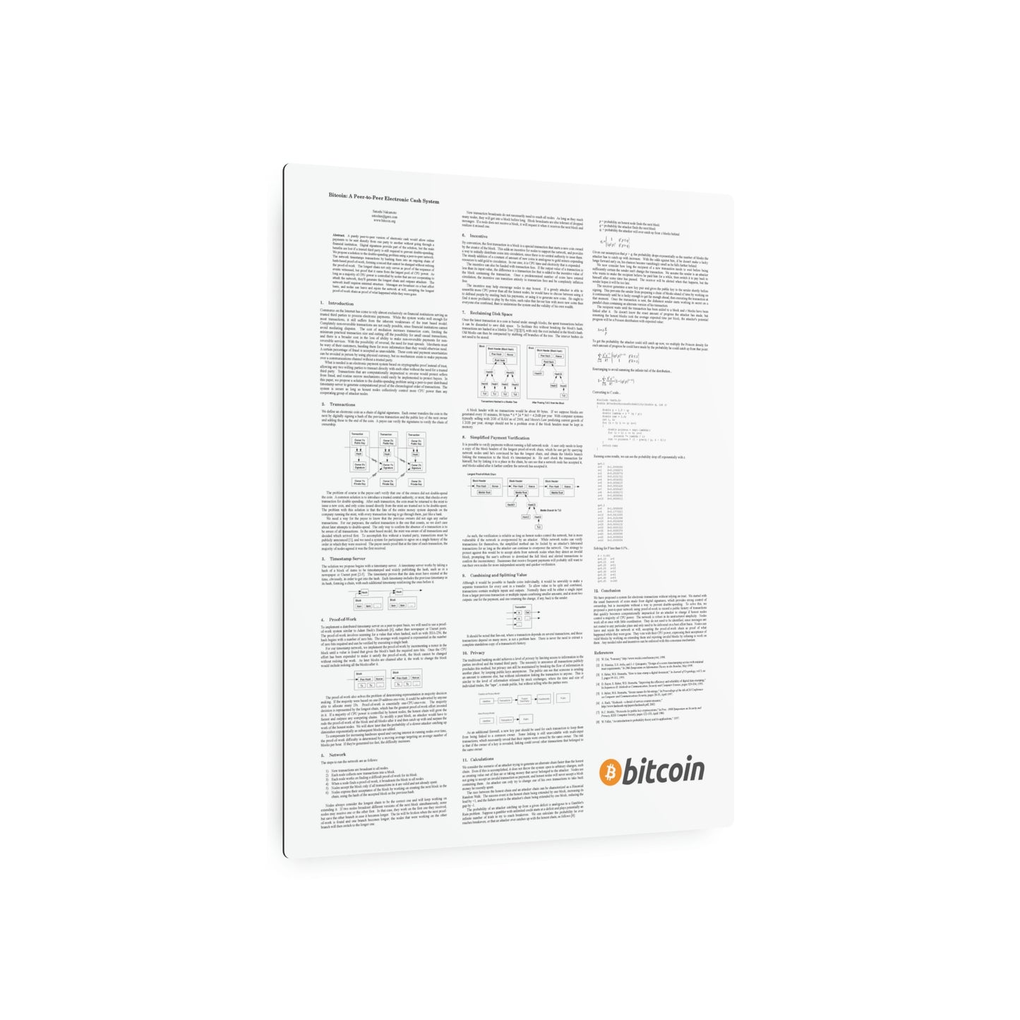 Display the Bitcoin White Paper on this awesome metal signs for a unique decoration piece. Made with 3mm white aluminum composite, these signs come with a beautiful white matte finish. Each sign comes with one mounting block for effortless hanging and is available in 11 sizes.