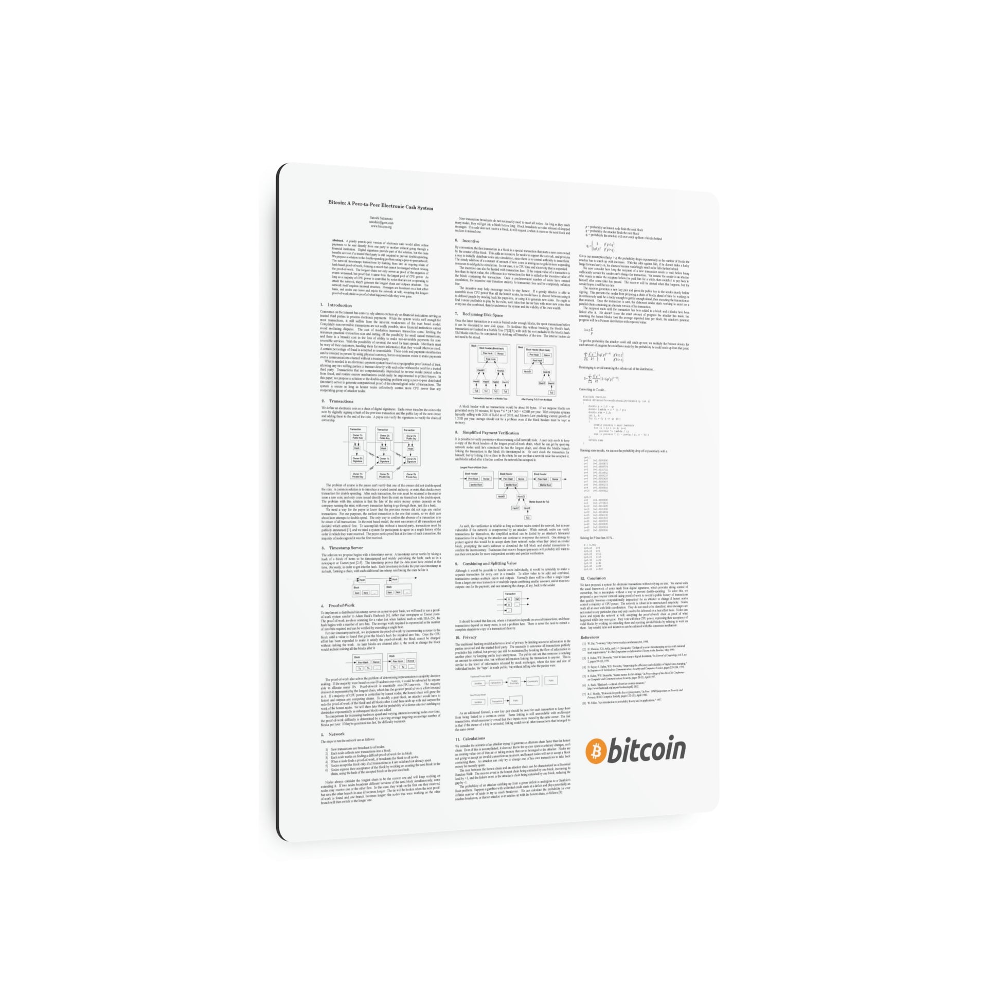 Display the Bitcoin White Paper on this awesome metal signs for a unique decoration piece. Made with 3mm white aluminum composite, these signs come with a beautiful white matte finish. Each sign comes with one mounting block for effortless hanging and is available in 11 sizes.