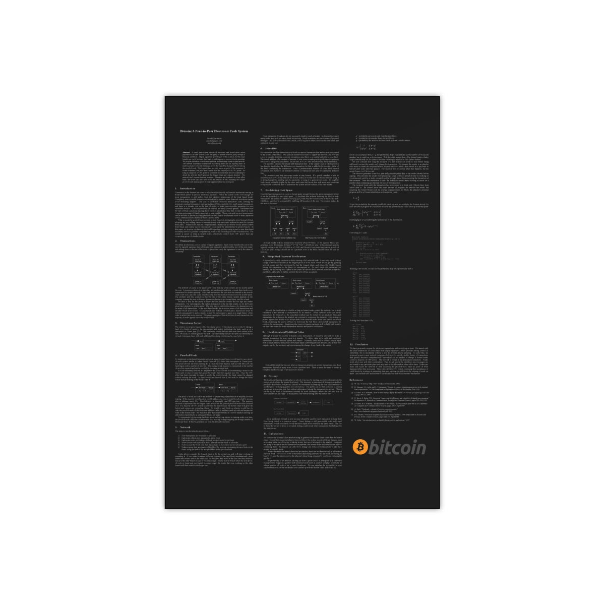 Discover one of the best ways to display the B itcoin Whitepaper and bring it to life, with a premium satin poster. Each poster is made with 300gsm, resin-coated inkjet photo paper - a pro photographer's favorite due to its heftiness and robust nature that surpasses in durability mass-market photo papers. Available in multiple sizes, for indoor use only.