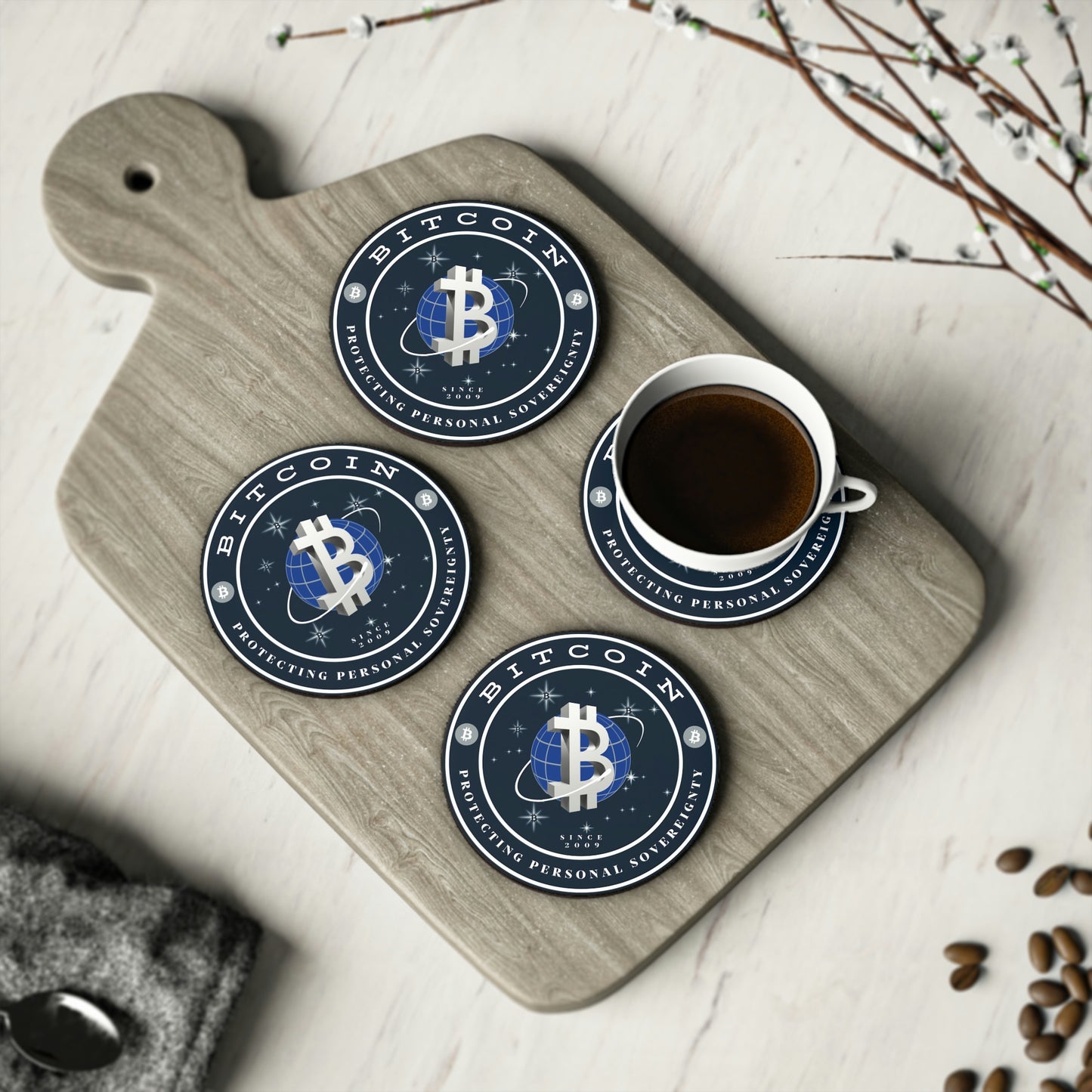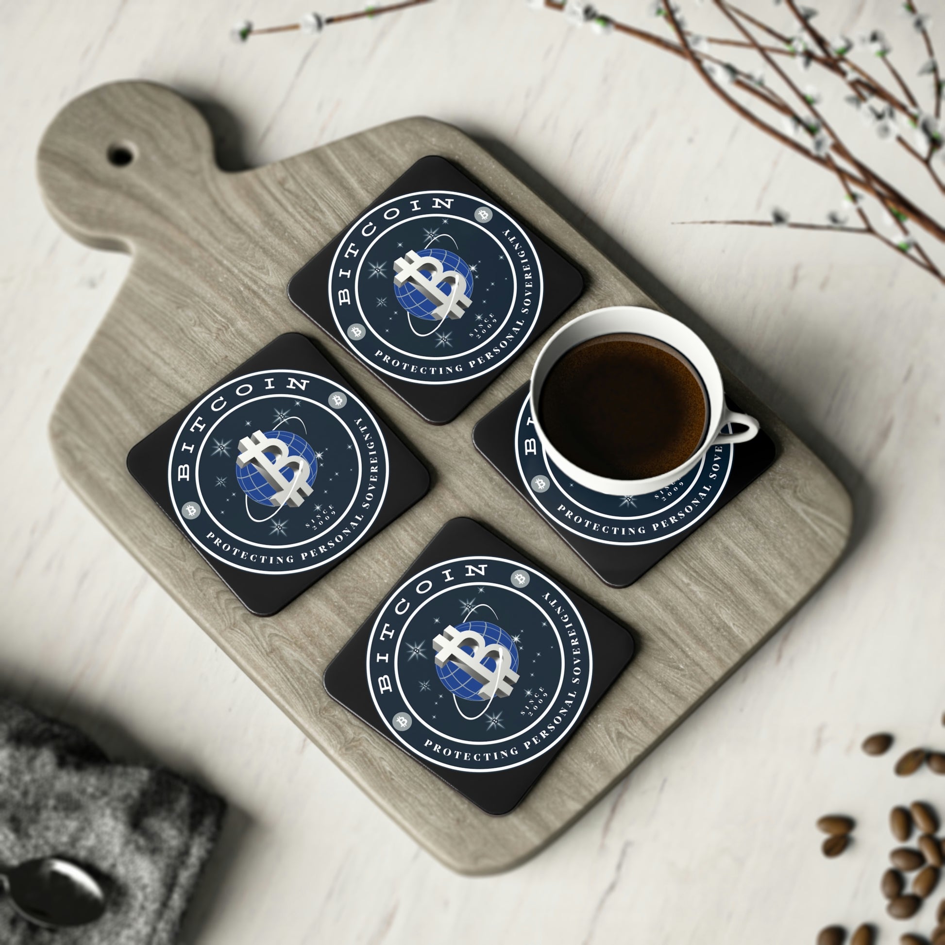 Who wouldn't want a set of Bitcoin coasters to use and have on display beneath you favorite beverages?!
