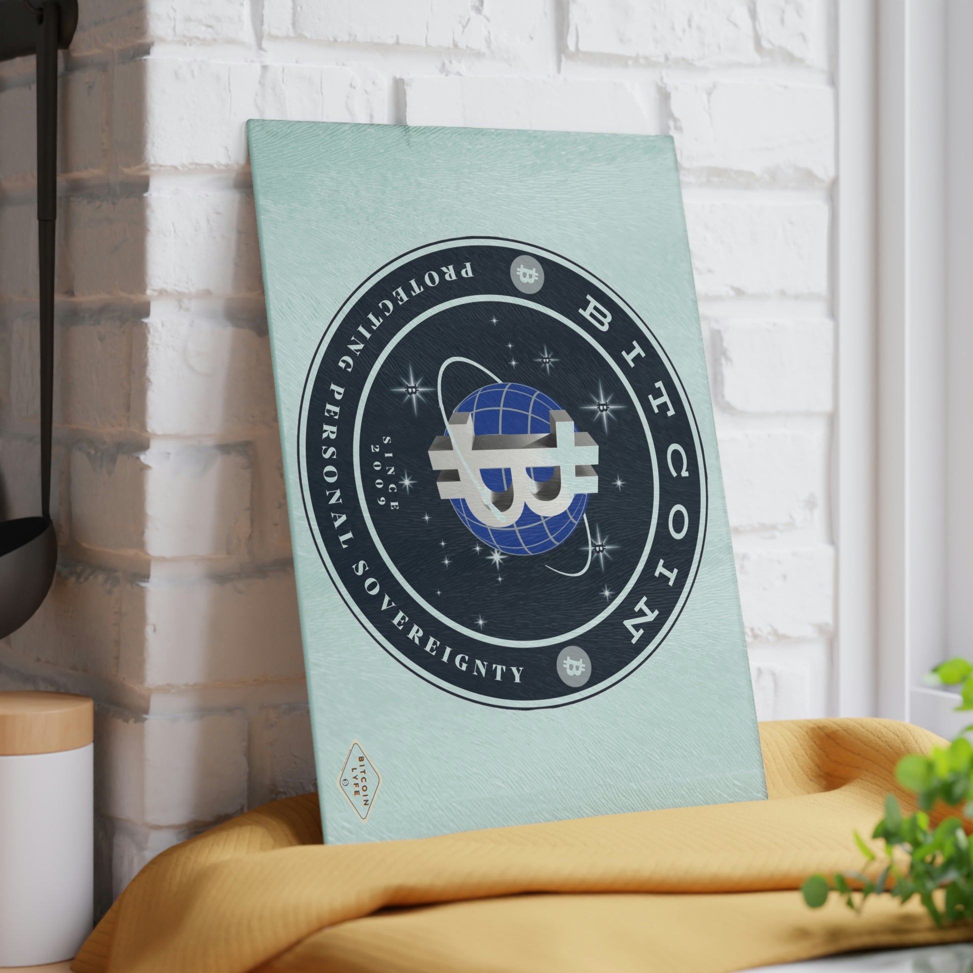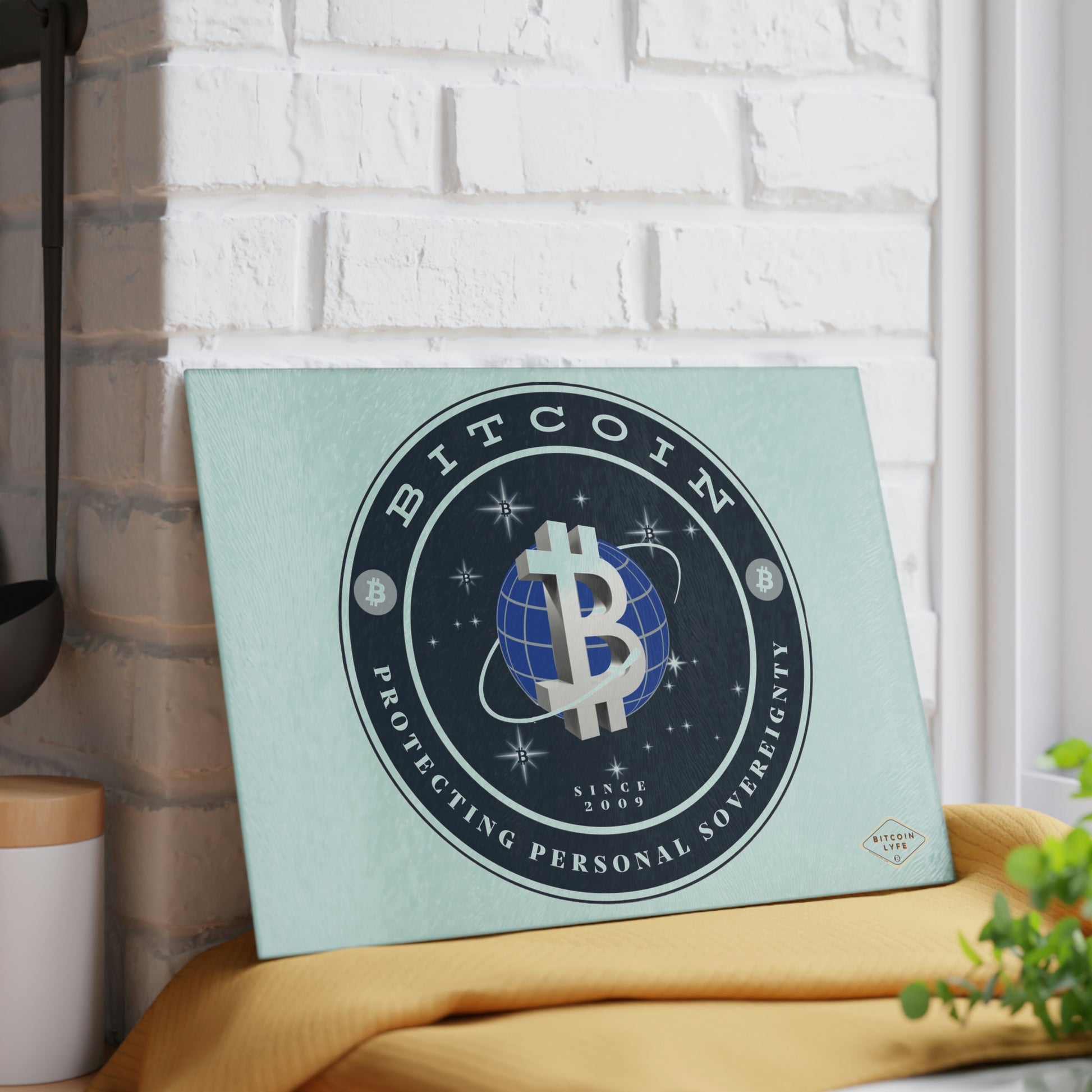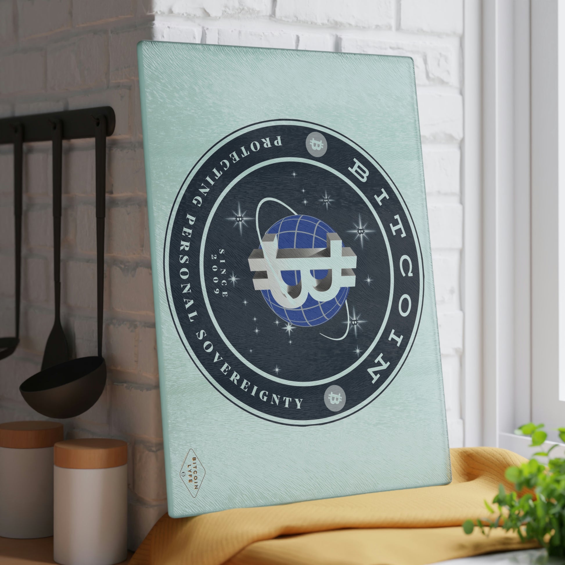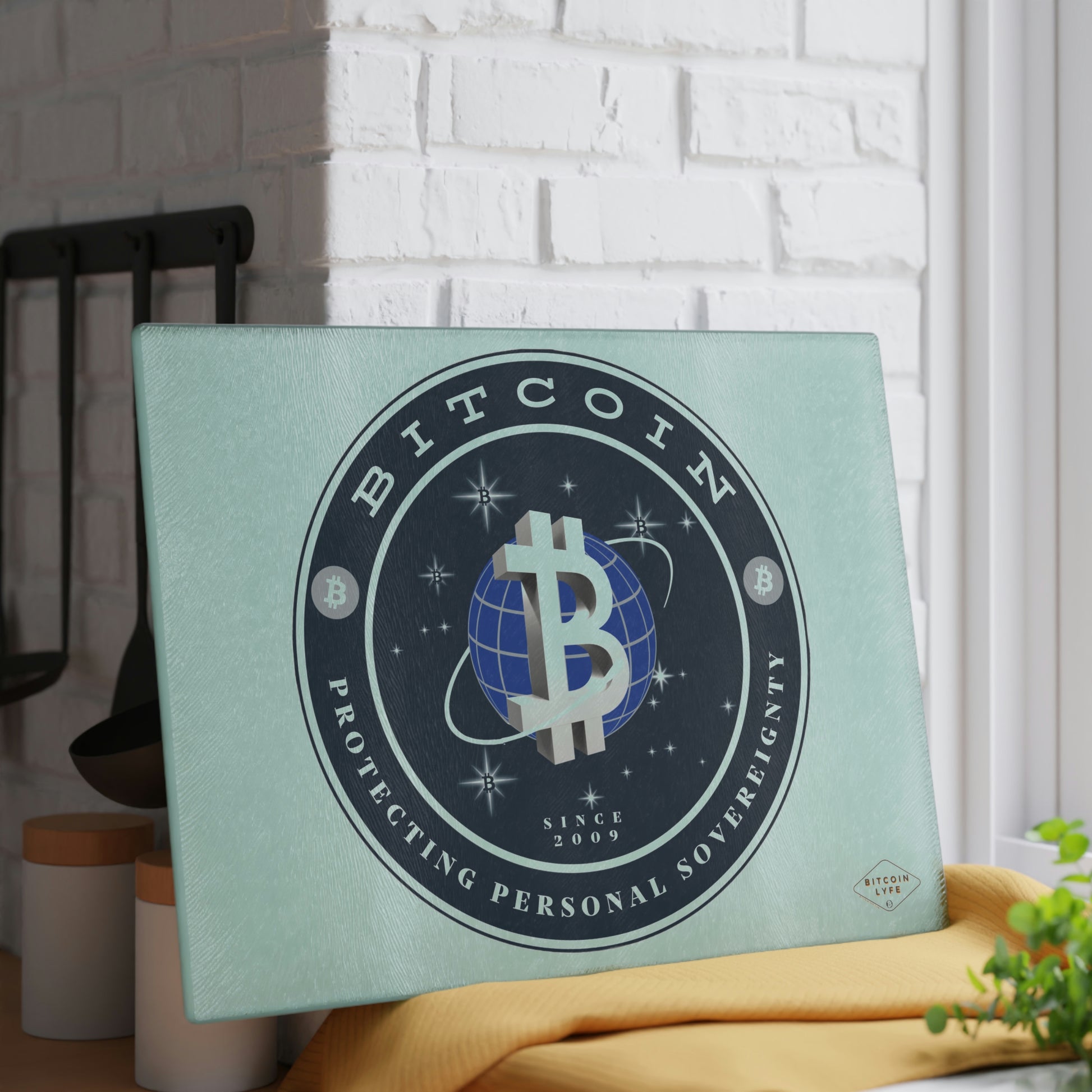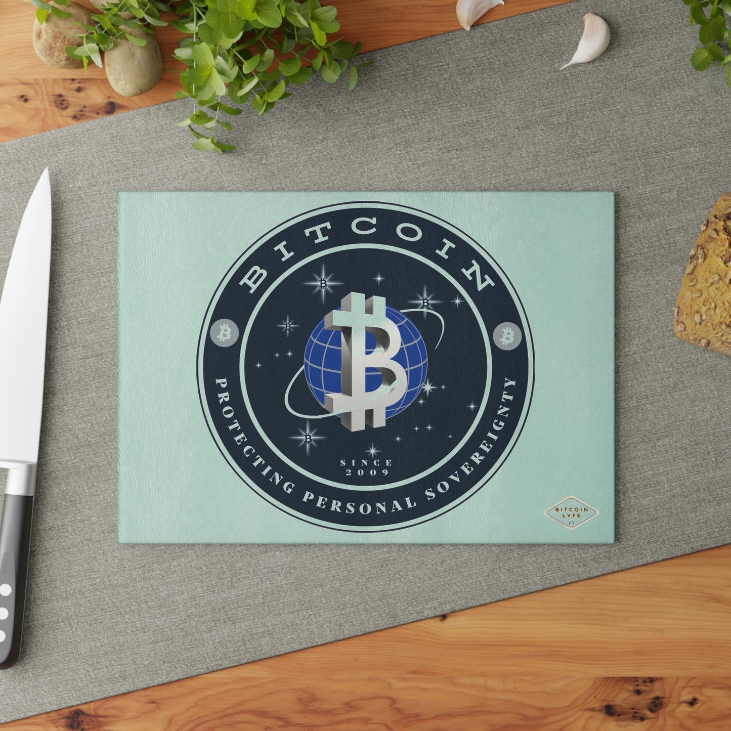 Bring a touch of character into any kitchen with this Bitcoin glass cutting board. Its tampered glass material is robust and helps prepare many a tasty meal for a long time to come. The textured surface makes it an ideal chopping, slicing, and dicing area. Available in two sizes: 8" x 11" and 11" x 15".