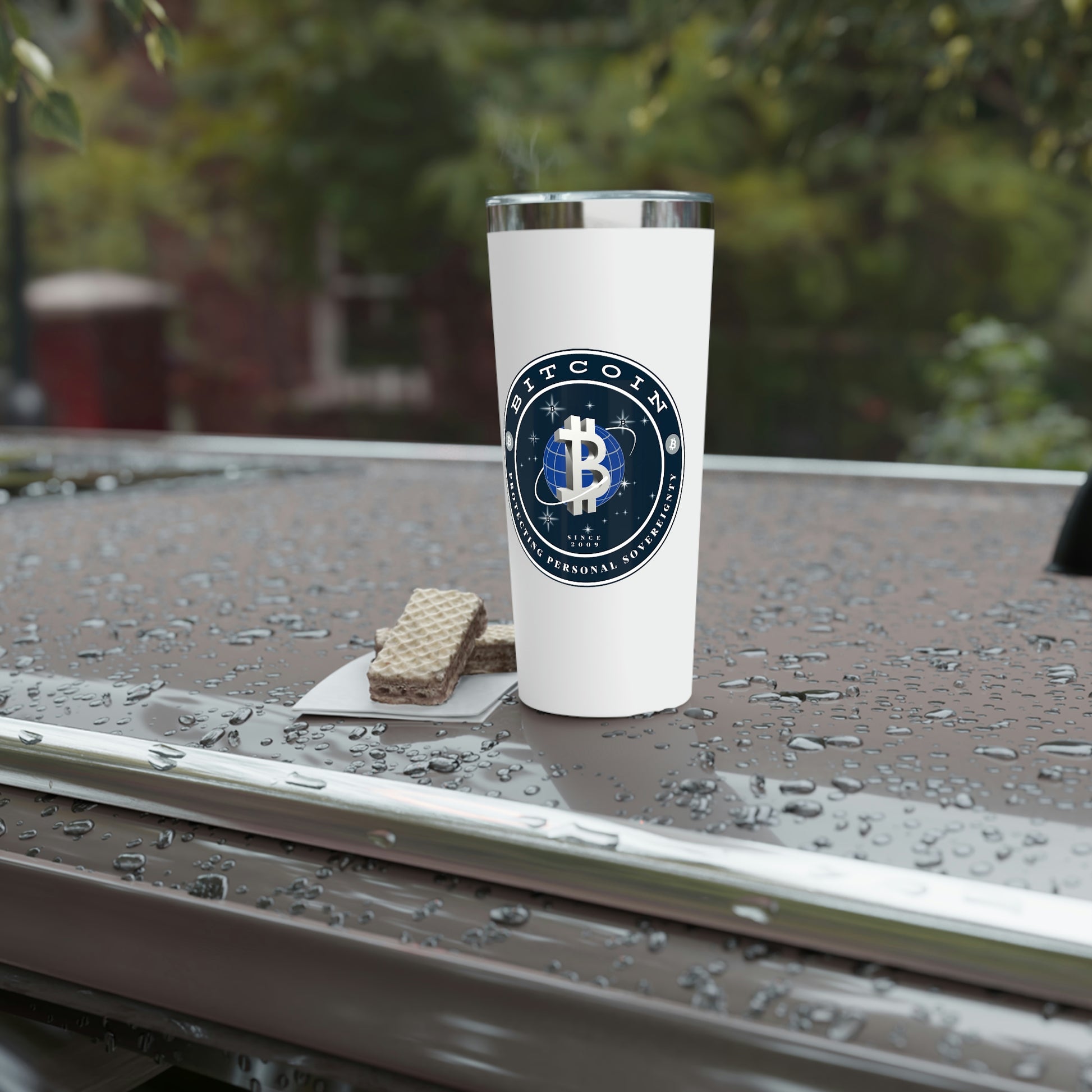 Stay hydrated in style on a daily basis with this Bitcoin tumbler. With a 22oz capacity and copper vacuum insulation, our tumbler keeps your favorite beverages refreshingly cold for 24 hours, and soothingly hot for up to 6. Its stainless steel exterior is condensation-resistant while the powder coating adds extra style points.