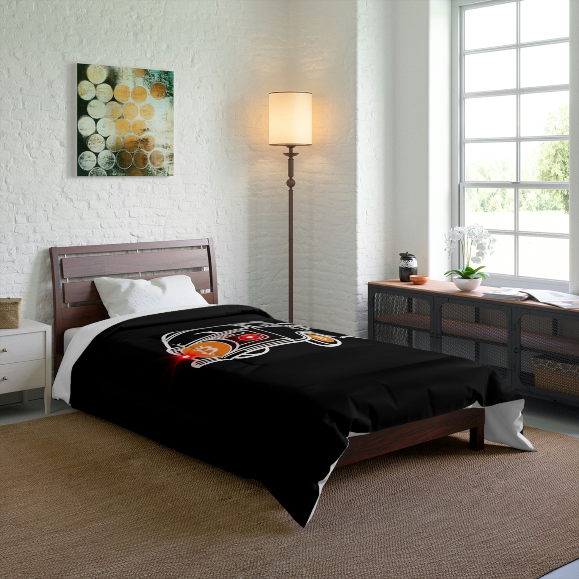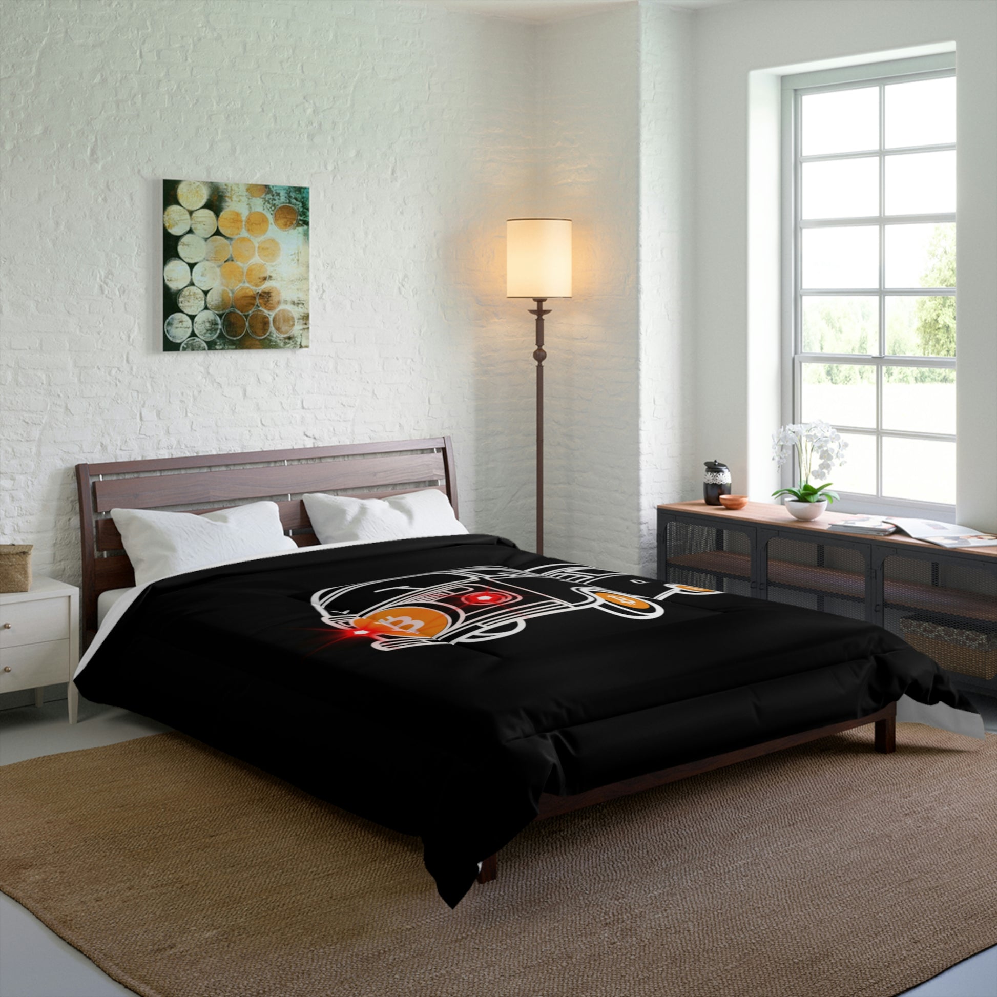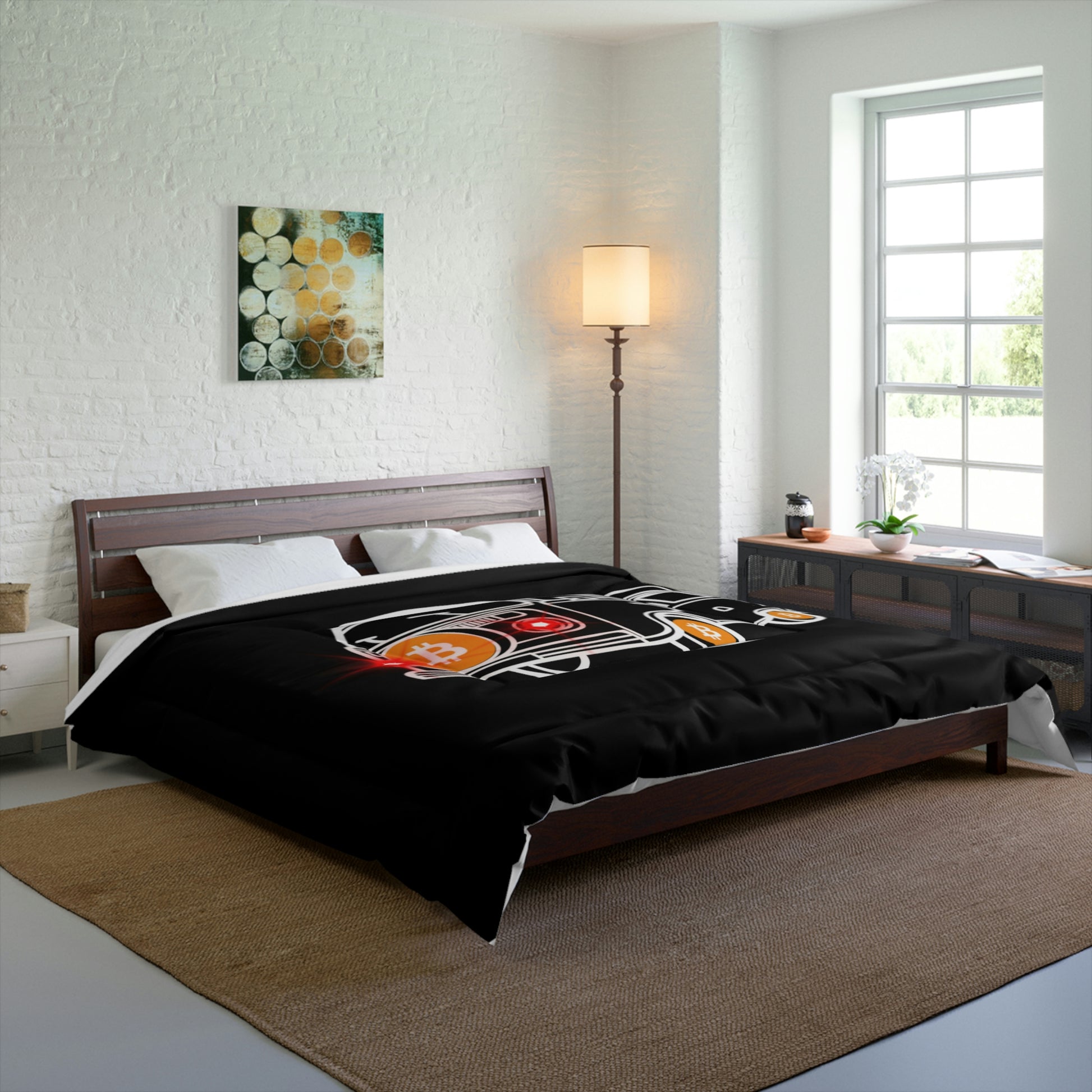 Comfy, fluffy, and warm. Cozy up underneath our snug comforter for a deep and relaxing sleep. This Bitcoin comforter is the perfect solution for cold days in bed with coffee, waiting for the morning light to peak through the window and wake up the house.