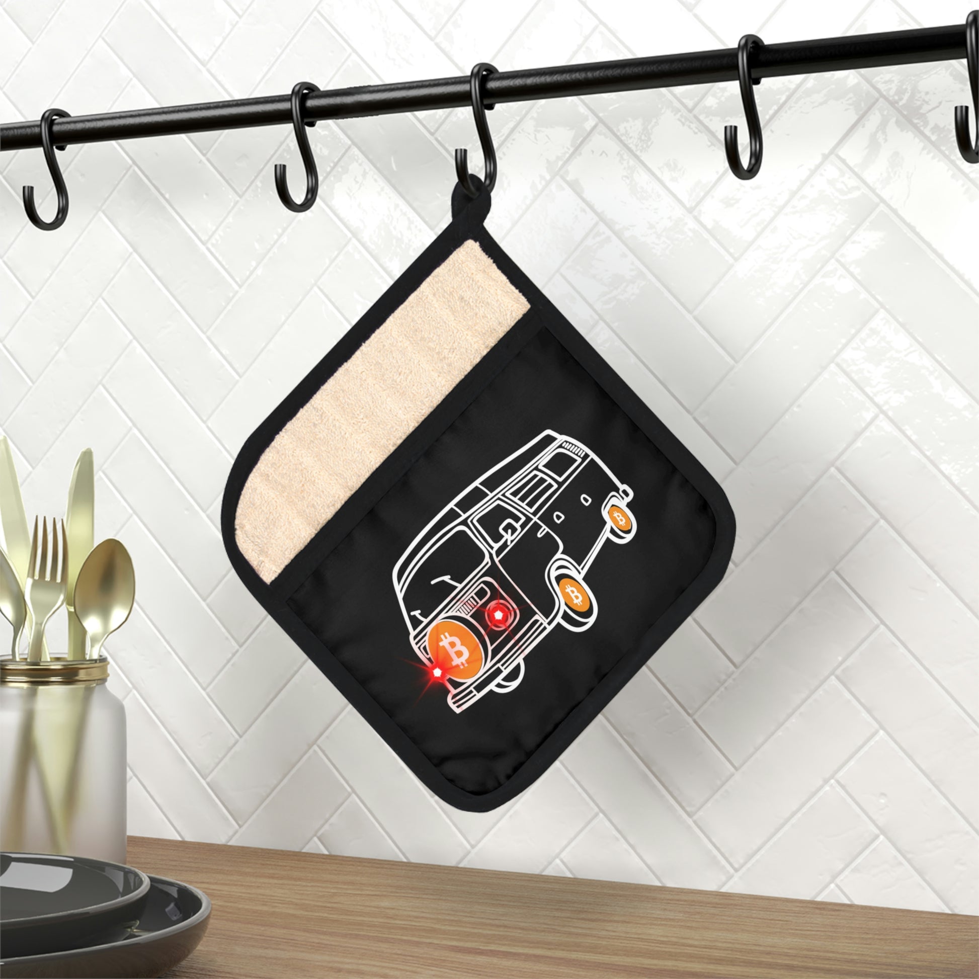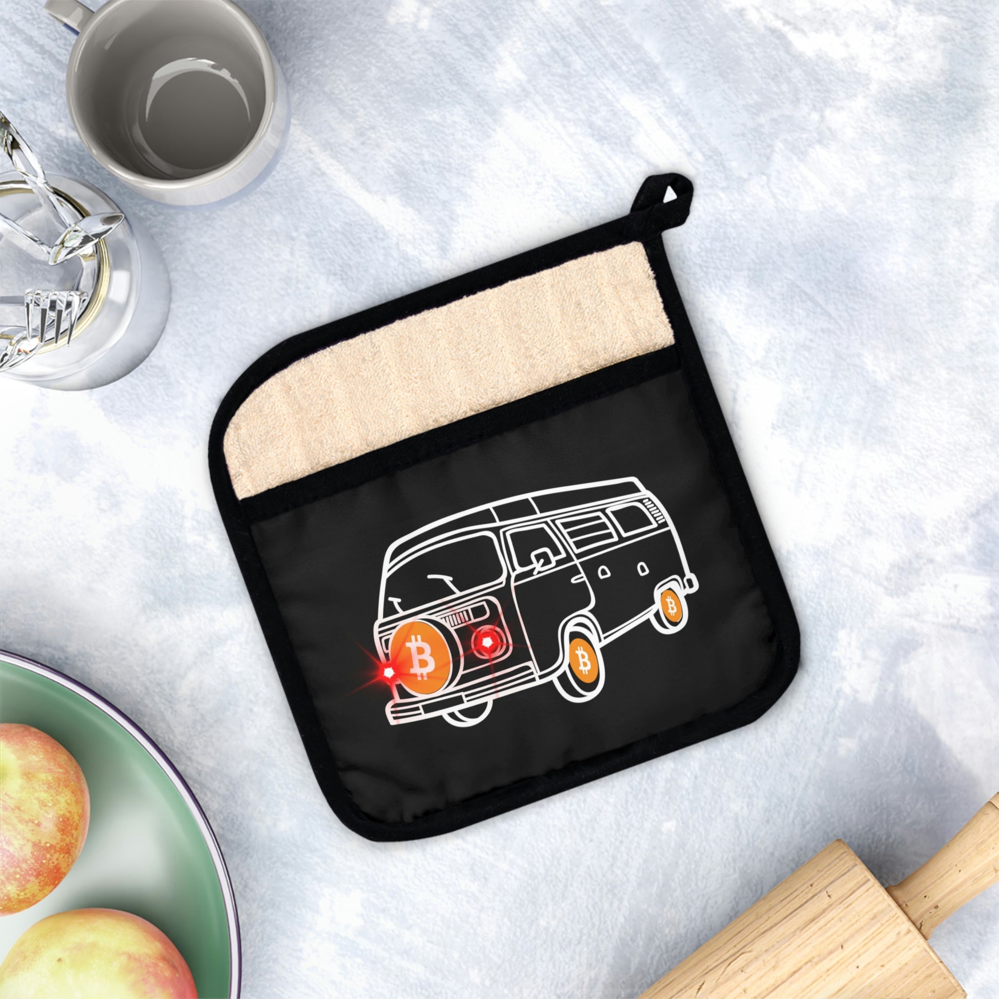 This Bitcoin pot holder was designed to be a stylish kitchen helper that ups any kitchen's decor with a custom flair. Measuring at 9x9 inches in size, it’s perfect for handling hot kitchen pots, or taking out oven trays thanks to its heat resistance of up to 350F. What’s more, the cotton hanging loop allows for convenient storage when not in use.