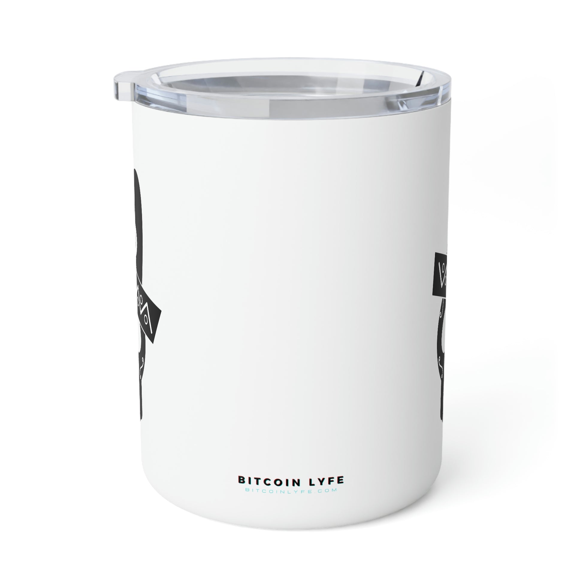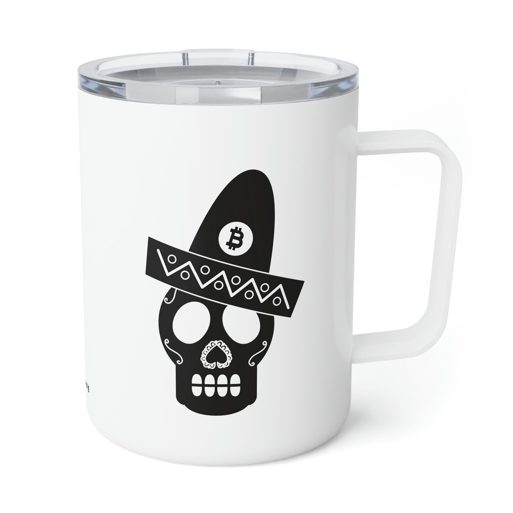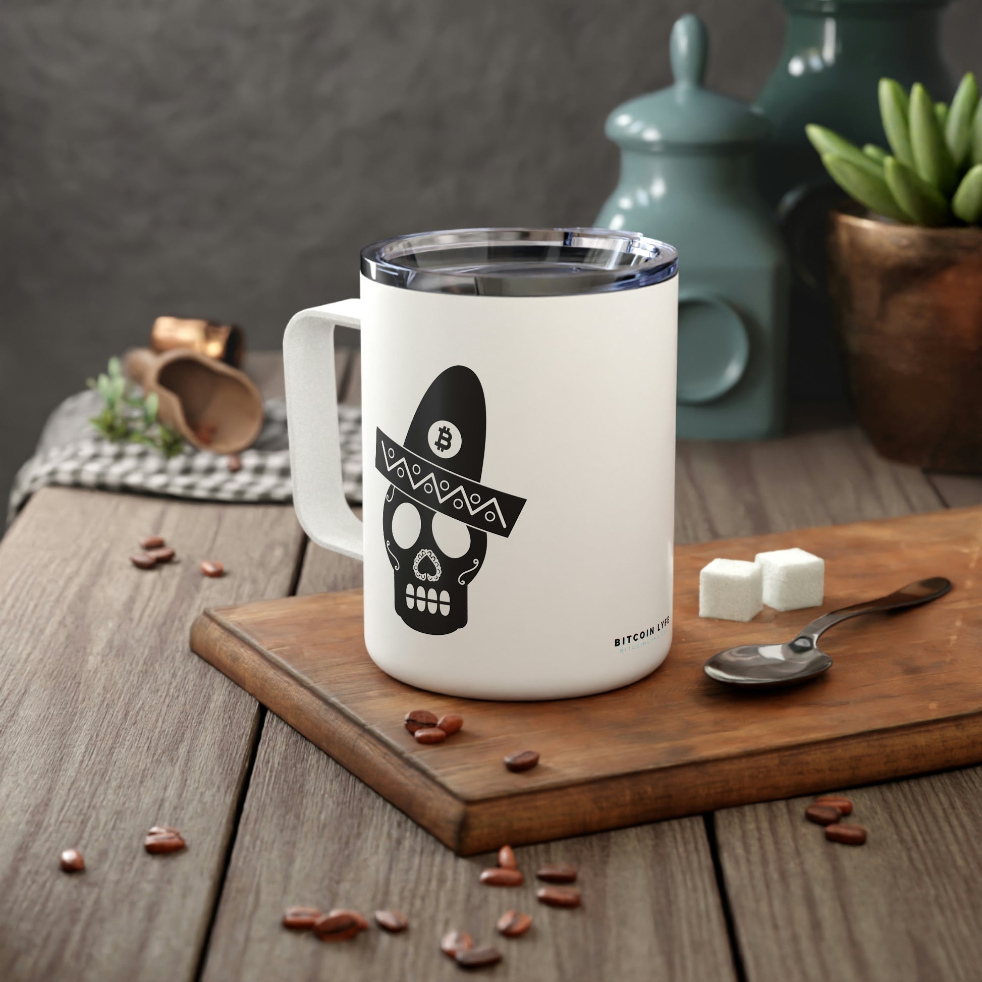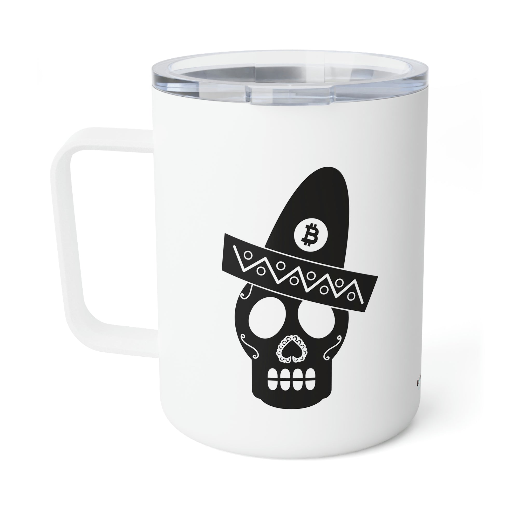 Nothing quite like a refreshing sip of one's favorite beverage in the middle of a long adventure with an awesome Día de los Muertos Bitcoin inspired insulated mug. These insulated travel mugs hold 10oz of liquid and come with a robust stainless steel, double wall construction making them a hard-wearing sidekick for the road. The white detailing adds extra style points while the clear acrylic lid adds another layer of practicality to an already functional favorite.