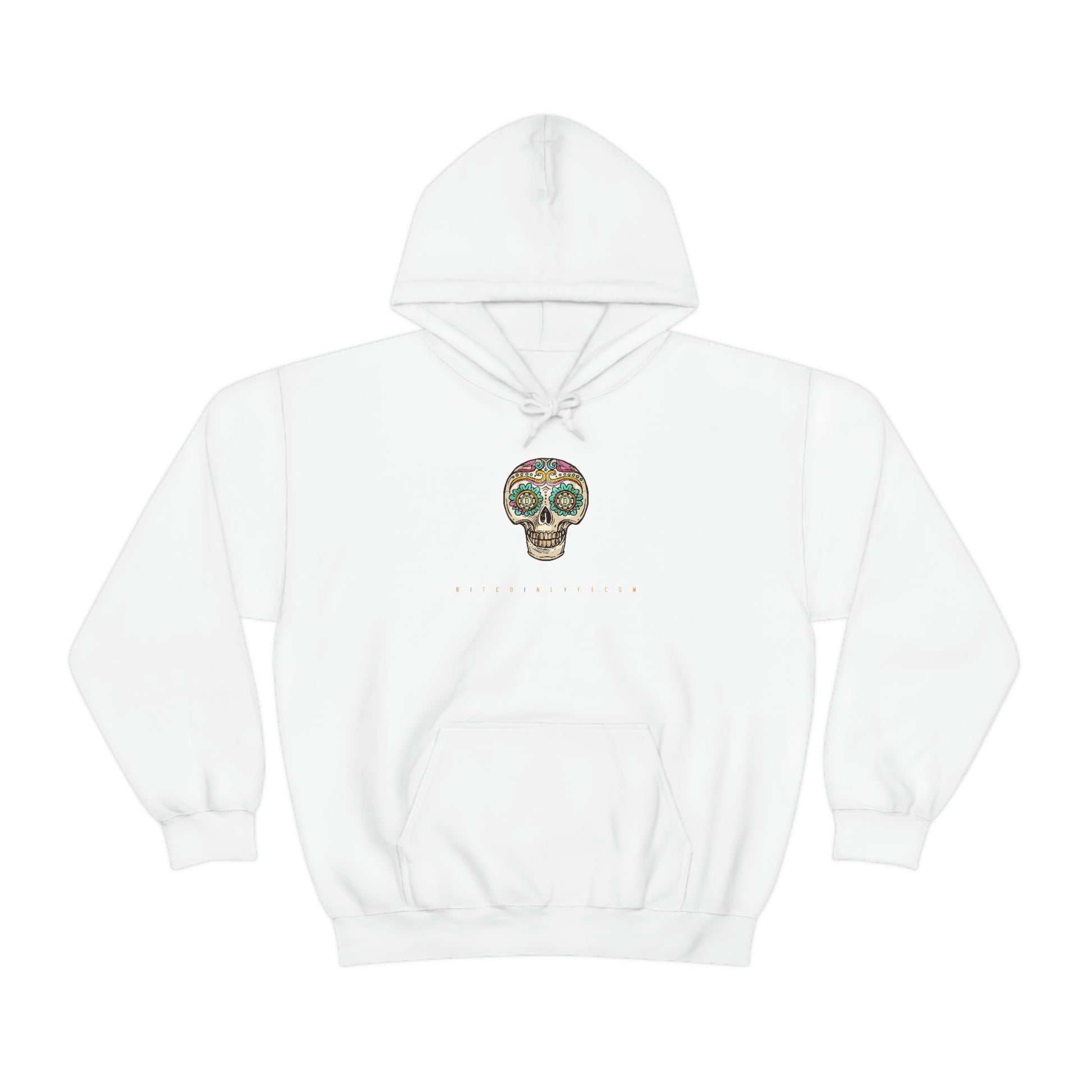 Why not take some of the cool designs celebrating Día de los Muertos and combine them with a creative way to subtly express our conviction or interest in Bitcoin? Yea, that's what we were thinking! hahaha We hope you like these designs. We tried to work in variations of the Bitcoin logo that would compliment the Día de los Muertos skull designs. Who knows...maybe you will attract some fellow orange-pilled individuals along your way and maybe even help to educate others. Ok, well, maybe that's a little deep for a hoodie - so, anyway, we hope you enjoy these designs!