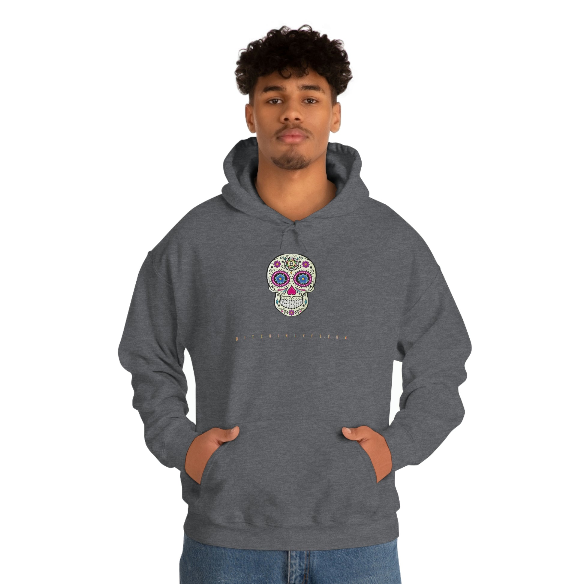 Why not take some of the cool designs celebrating Día de los Muertos and combine them with a creative way to subtly express our conviction or interest in Bitcoin? Yea, that's what we were thinking! hahaha We hope you like these designs. We tried to work in variations of the Bitcoin logo that would compliment the Día de los Muertos skull designs. Who knows...maybe you will attract some fellow orange-pilled individuals along your way and maybe even help to educate others. Ok, well, maybe that's a little deep for a hoodie - so, anyway, we hope you enjoy these designs!