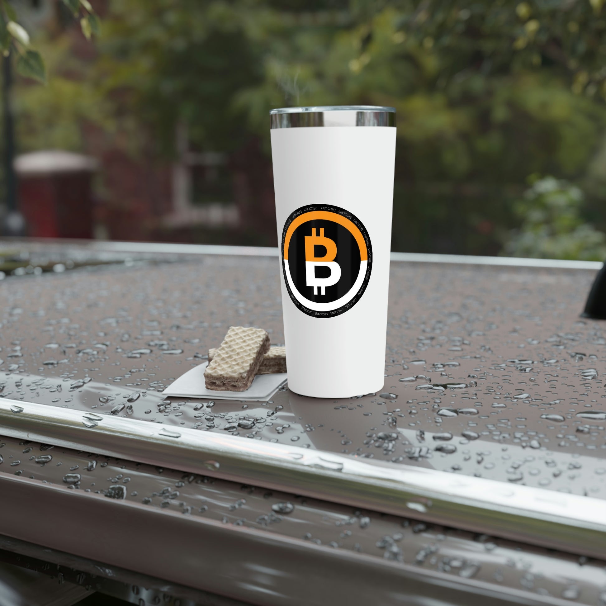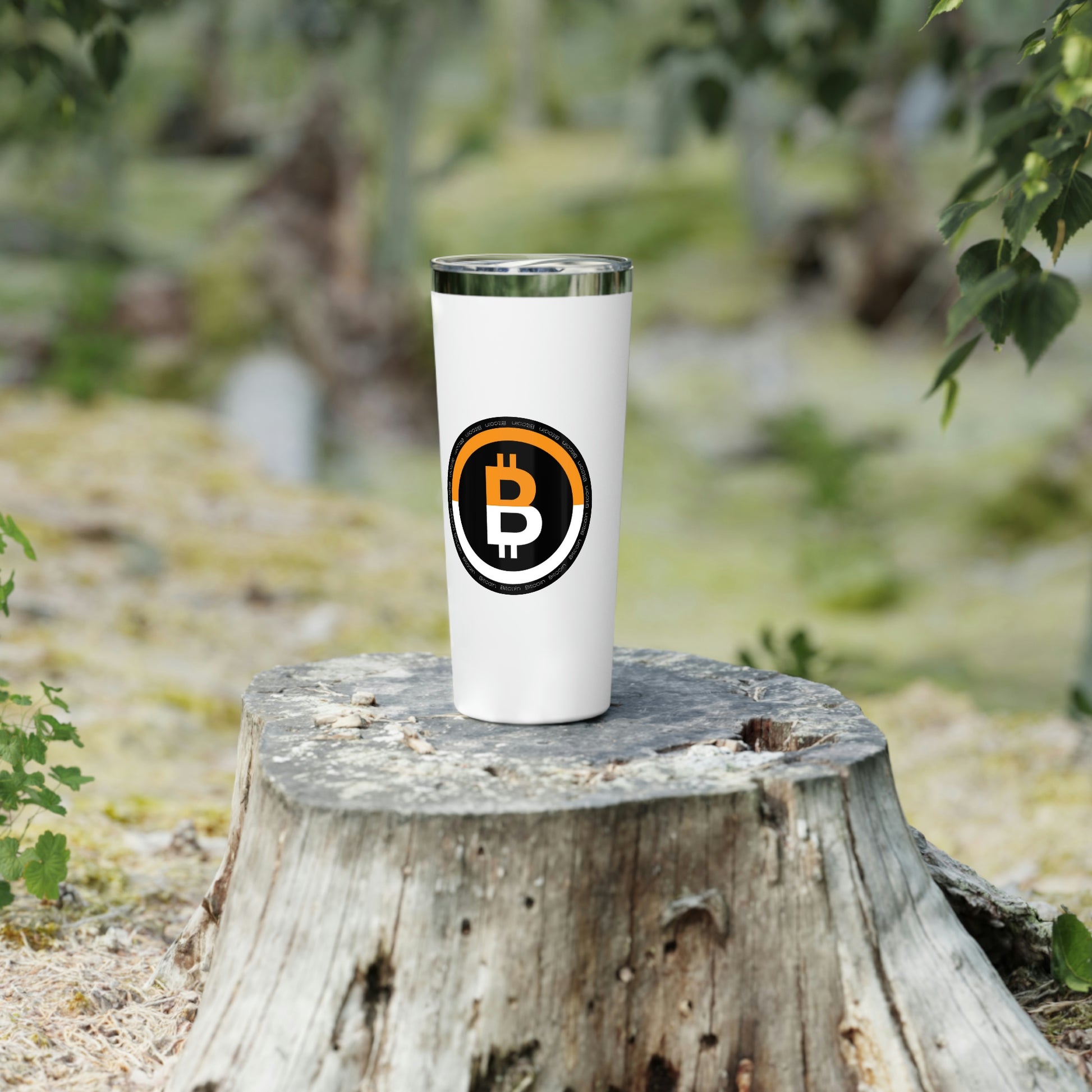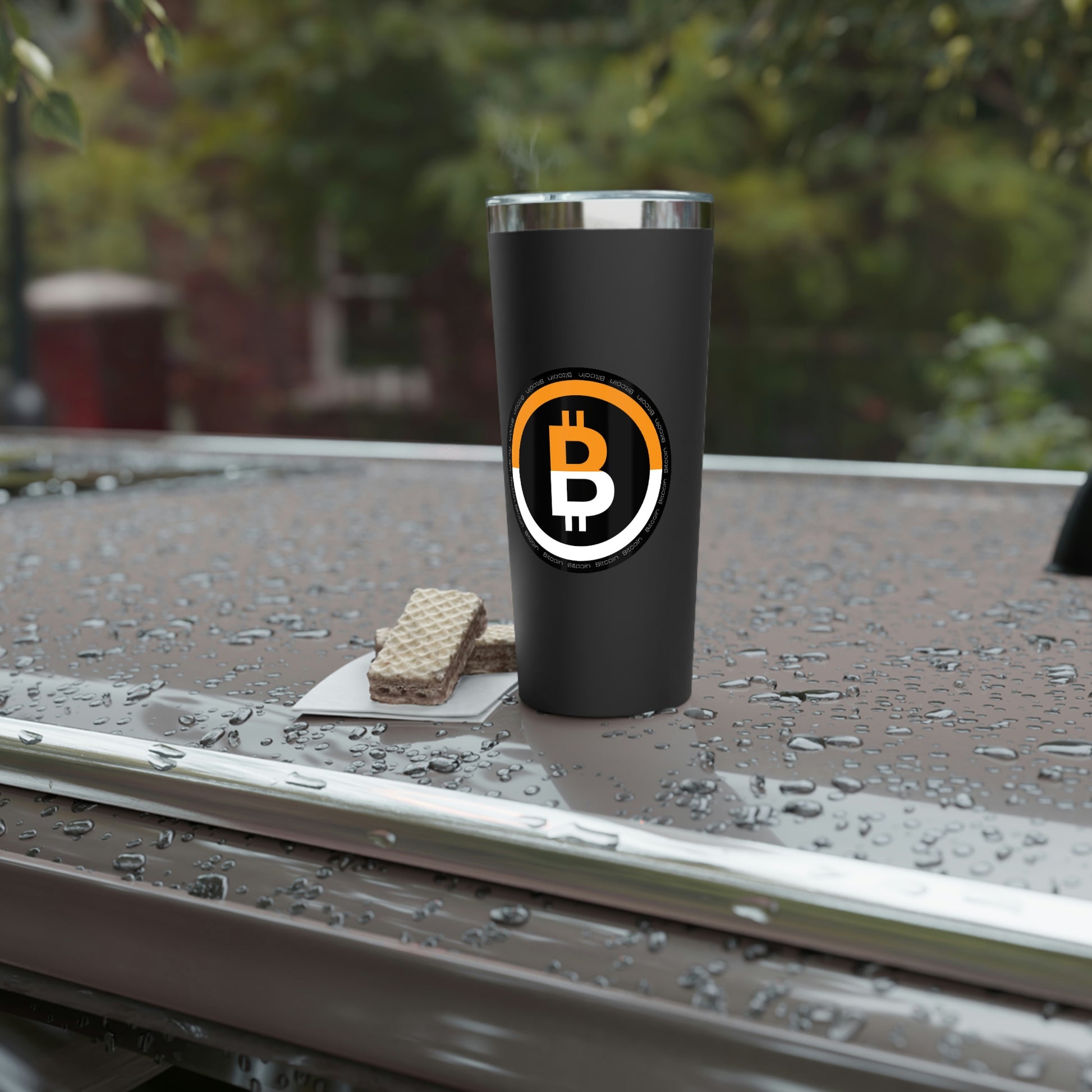Stay hydrated in style on a daily basis with this Bitcoin tumbler. With a 22oz capacity and copper vacuum insulation, our tumbler keeps your favorite beverages refreshingly cold for 24 hours, and soothingly hot for up to 6. Its stainless steel exterior is condensation-resistant while the powder coating adds extra style points.
