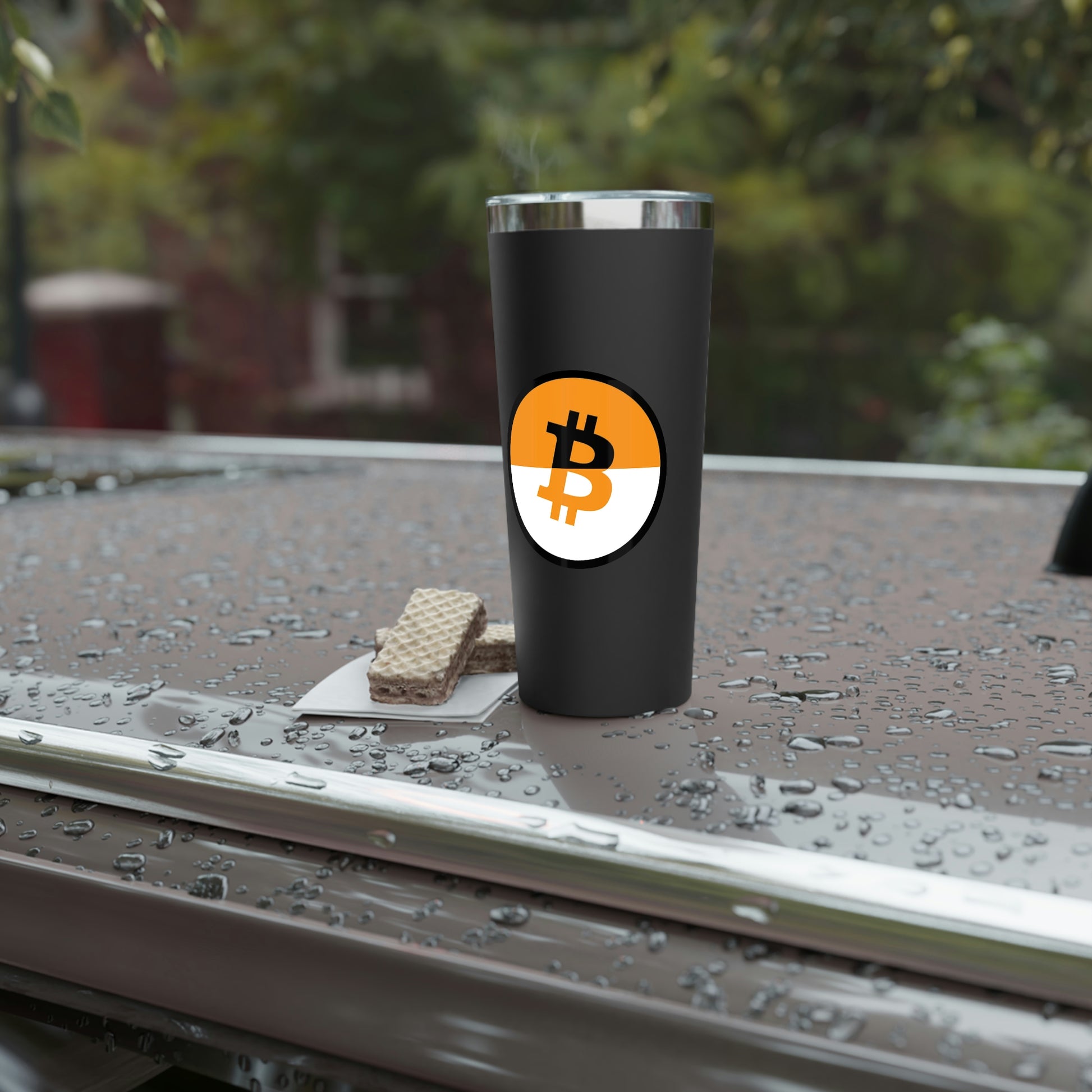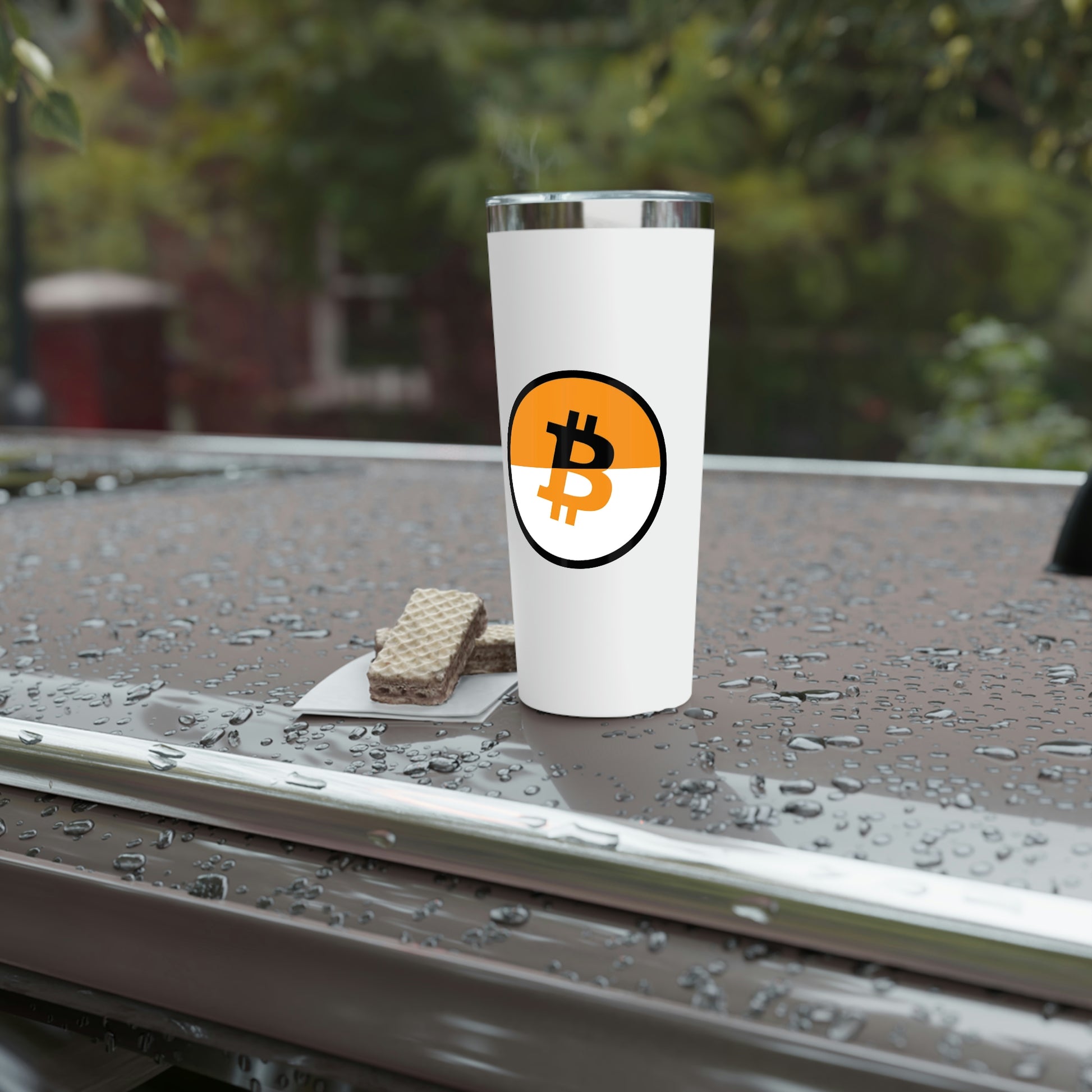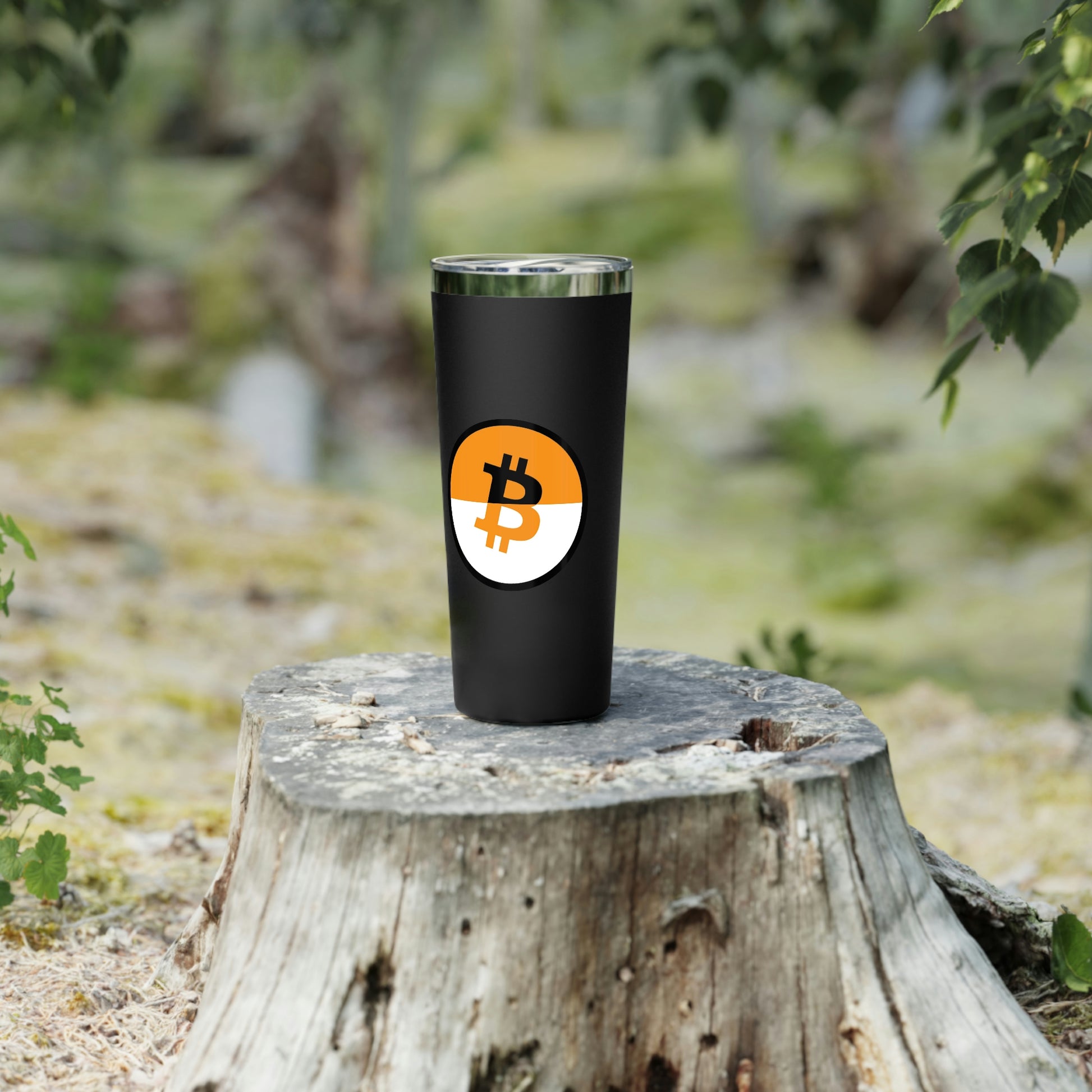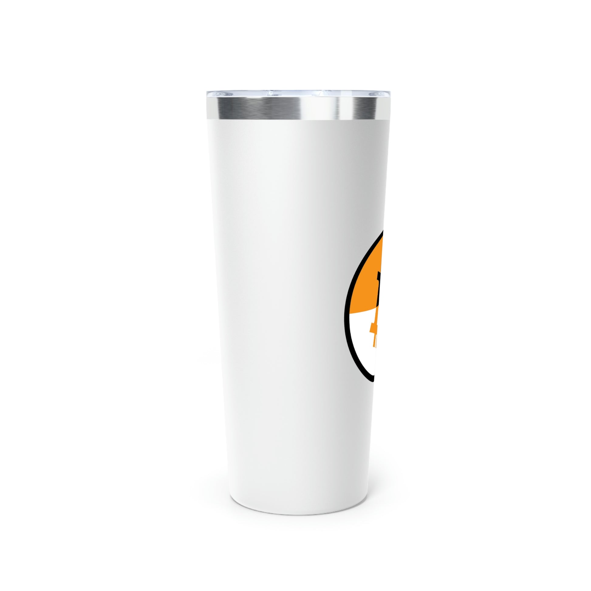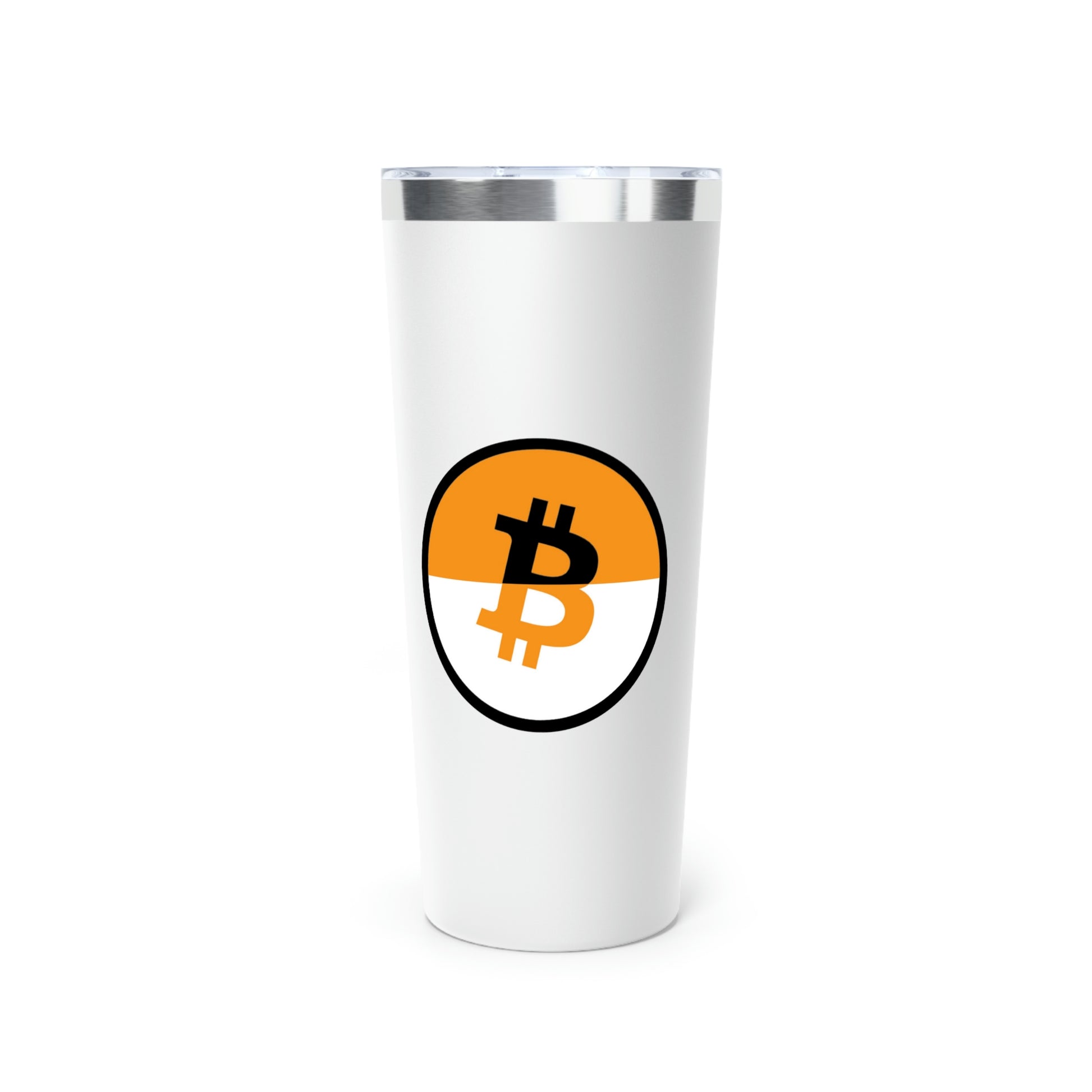 Stay hydrated in style on a daily basis with this Bitcoin tumbler. With a 22oz capacity and copper vacuum insulation, our tumbler keeps your favorite beverages refreshingly cold for 24 hours, and soothingly hot for up to 6. Its stainless steel exterior is condensation-resistant while the powder coating adds extra style points.