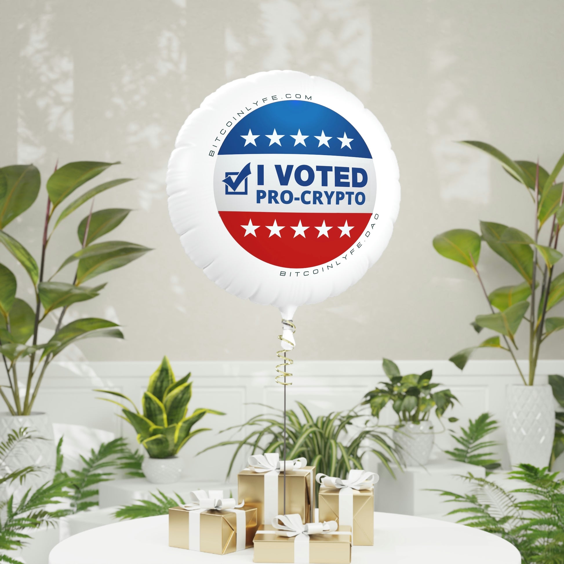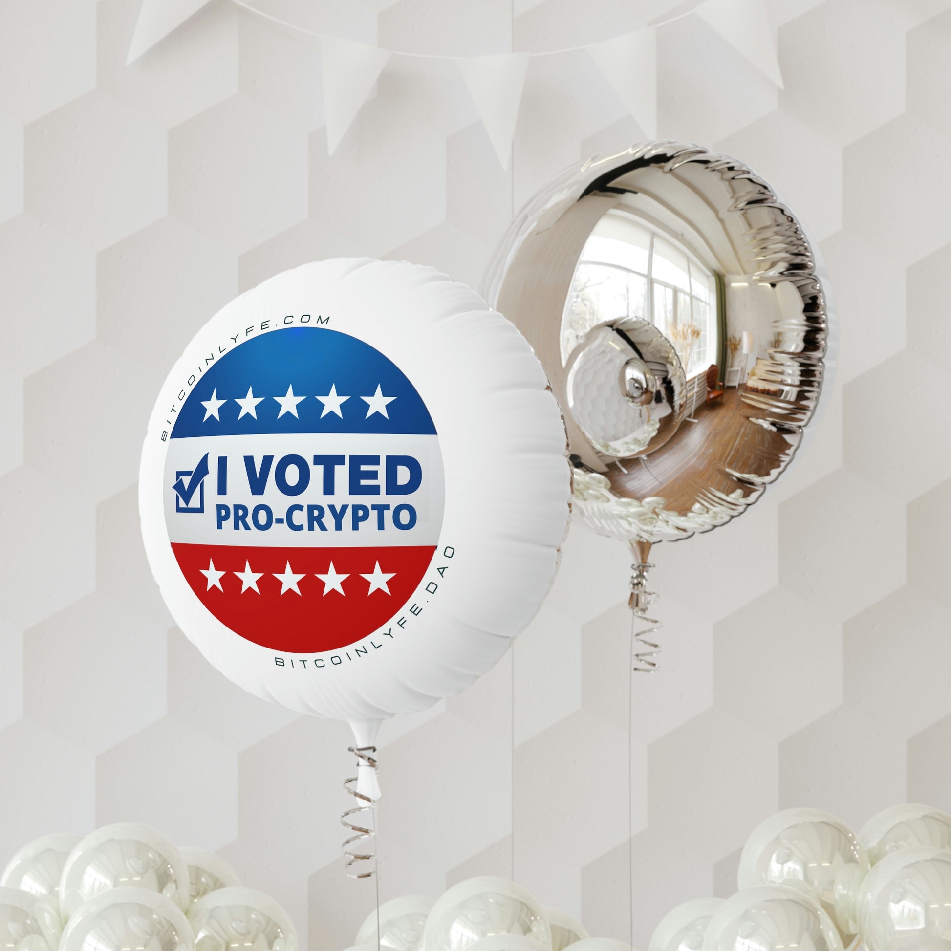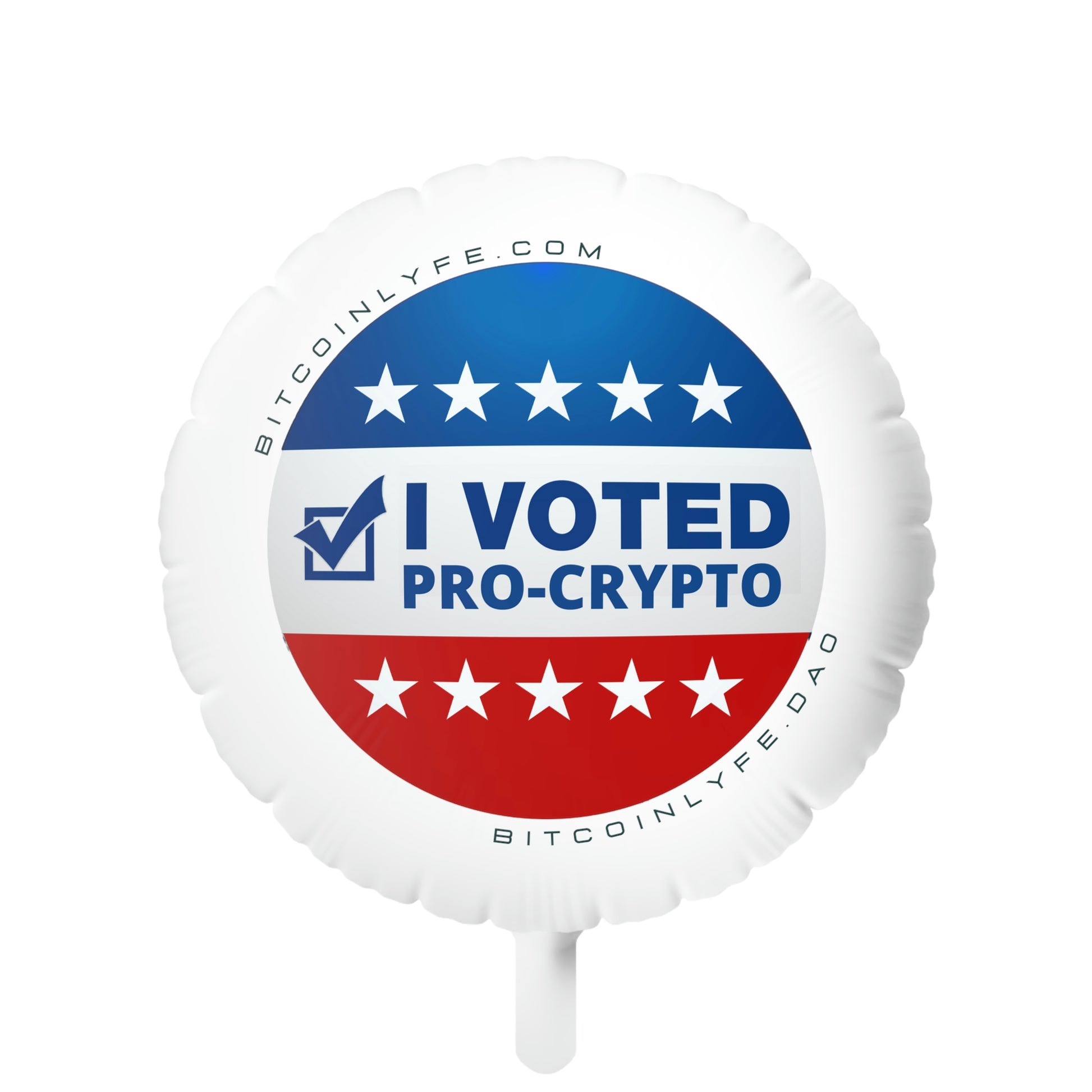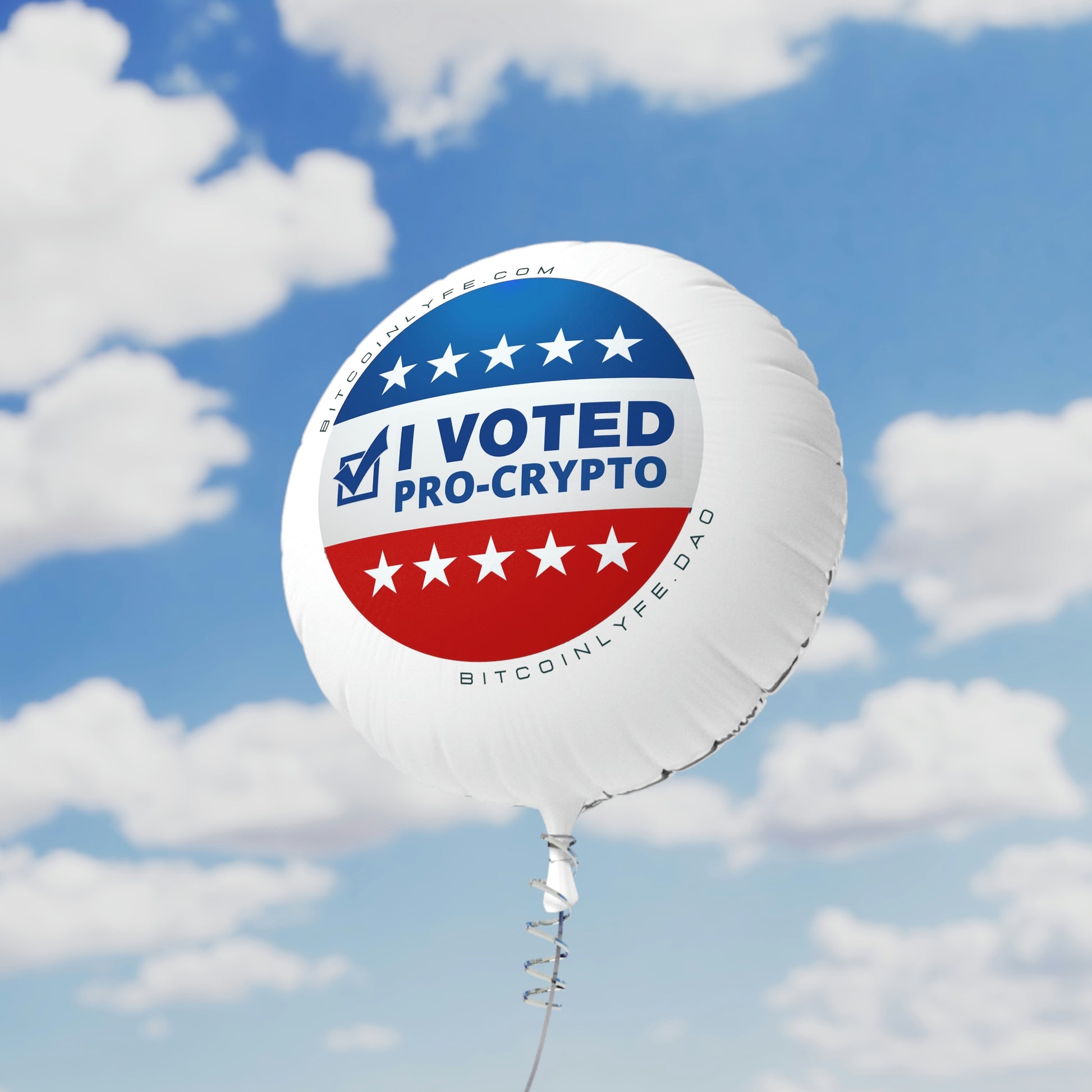 Make special events feel even more personal with "I Voted Pro-Crypto" balloons. The design is presented in beautiful quality on the white mylar surface with silver mylar on the back. These balloons take the podium for practicality. They're reusable and waterproof—perfect for indoor and outdoor events.