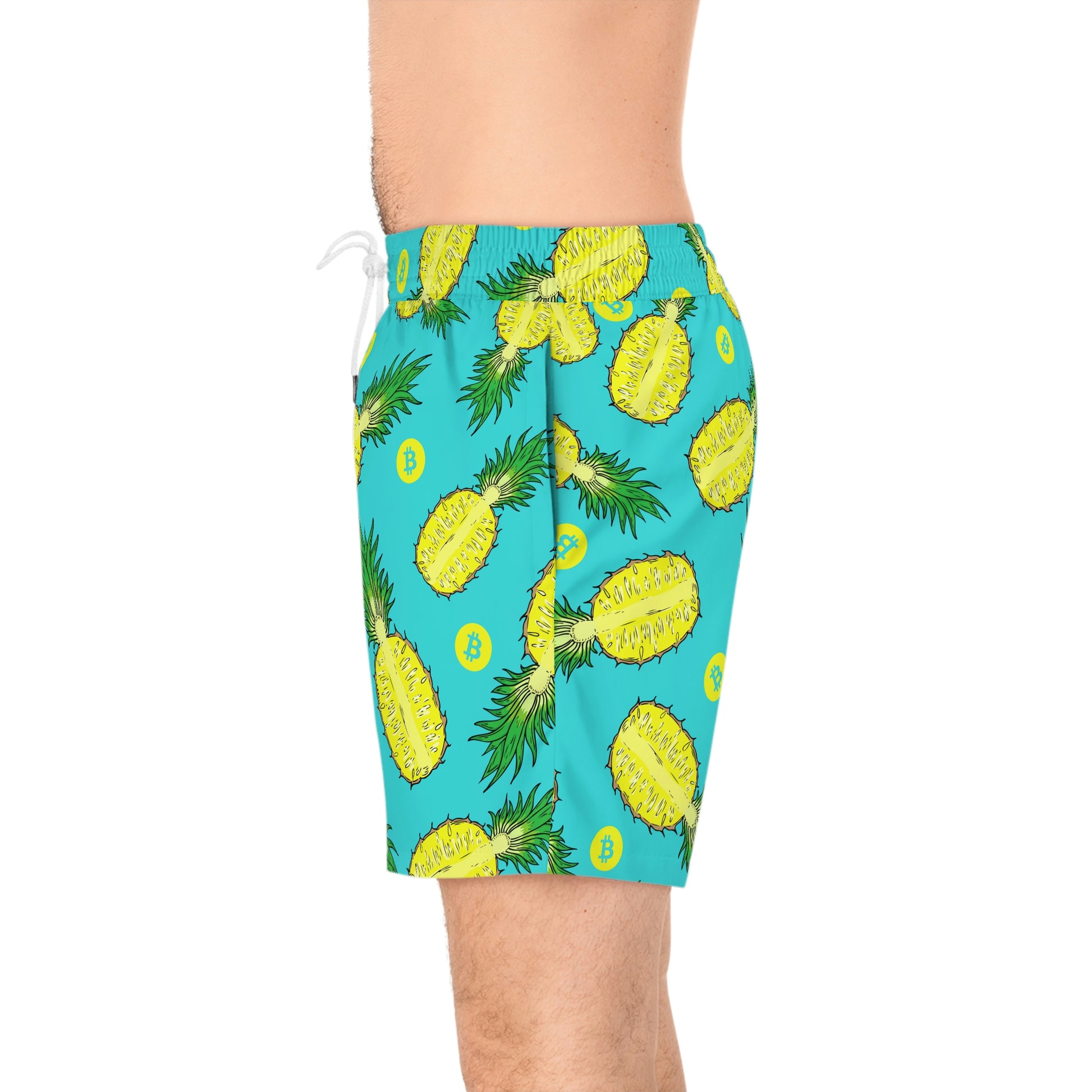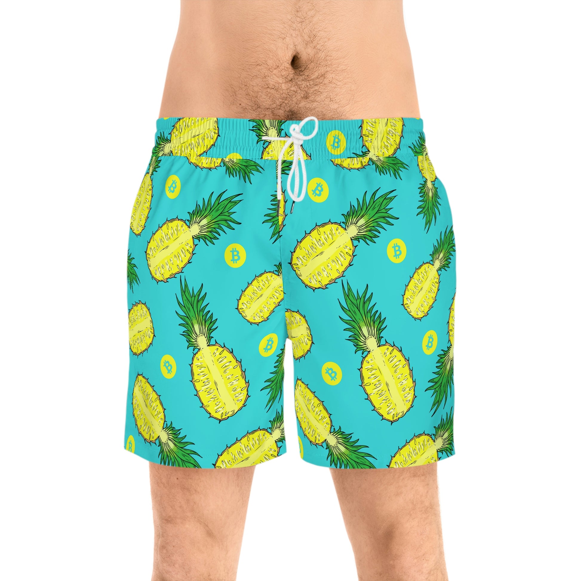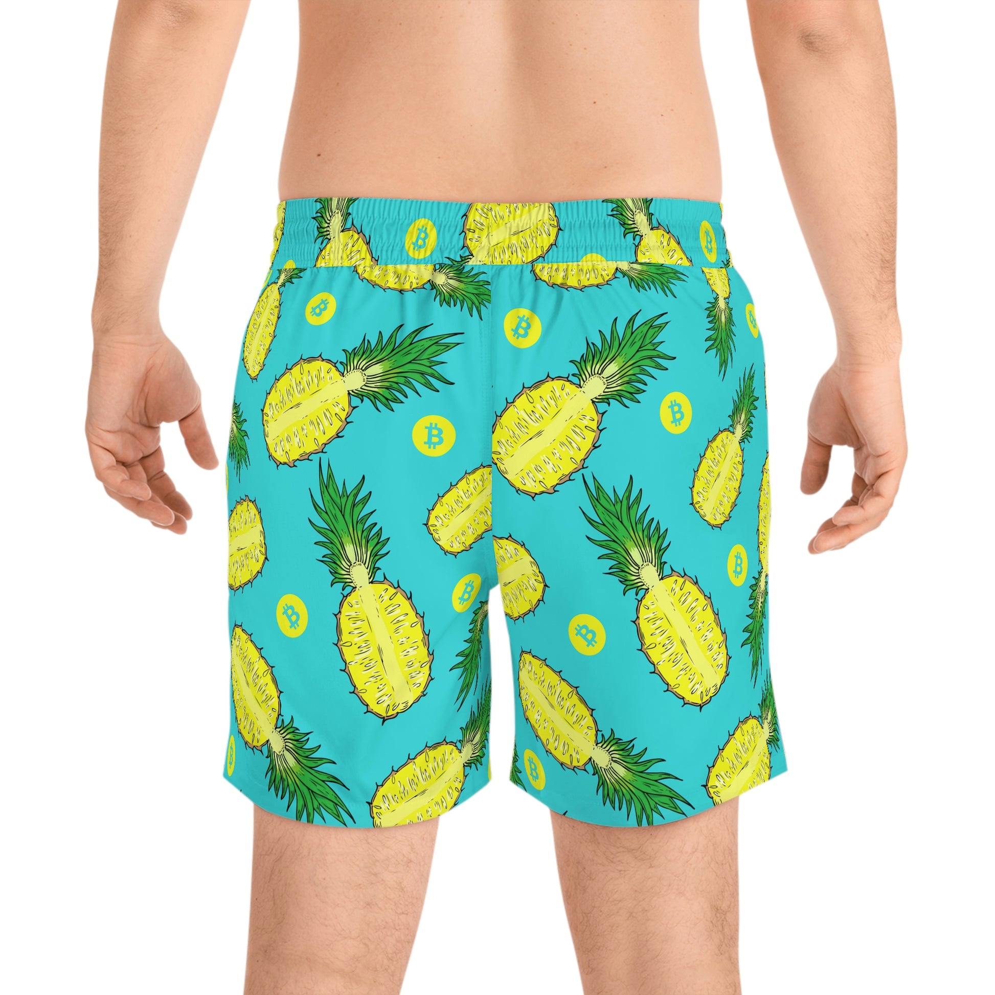 Made with 95% polyester and 5% spandex, it's the perfect blend for swimming and relaxing. These mid-length shorts are lightweight, come with an inner mesh brief and a relaxed fit, because sunny days at the coast are all about lounging and showing your Bitcoin pride. These shorts also come with two side pockets for added practicality.