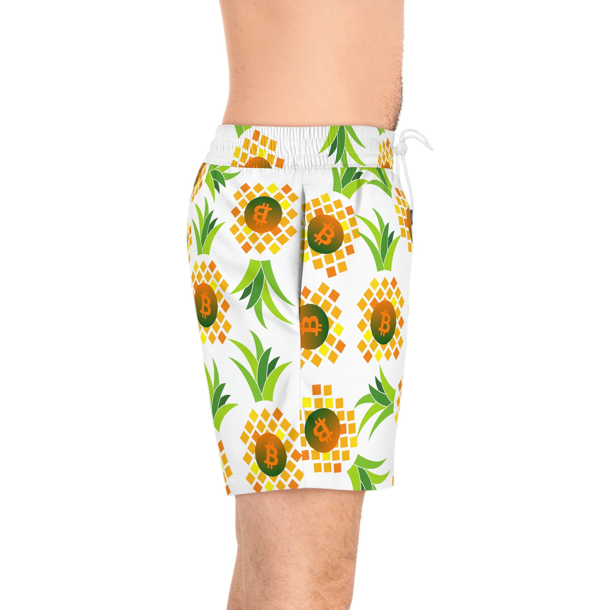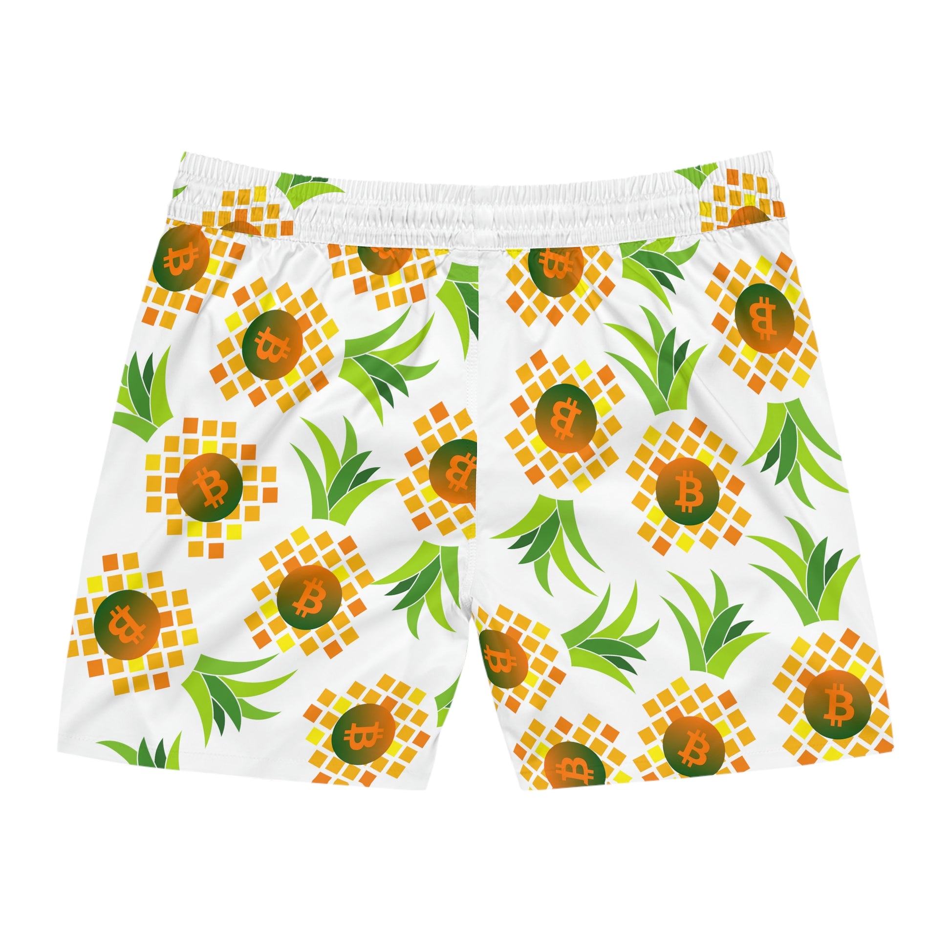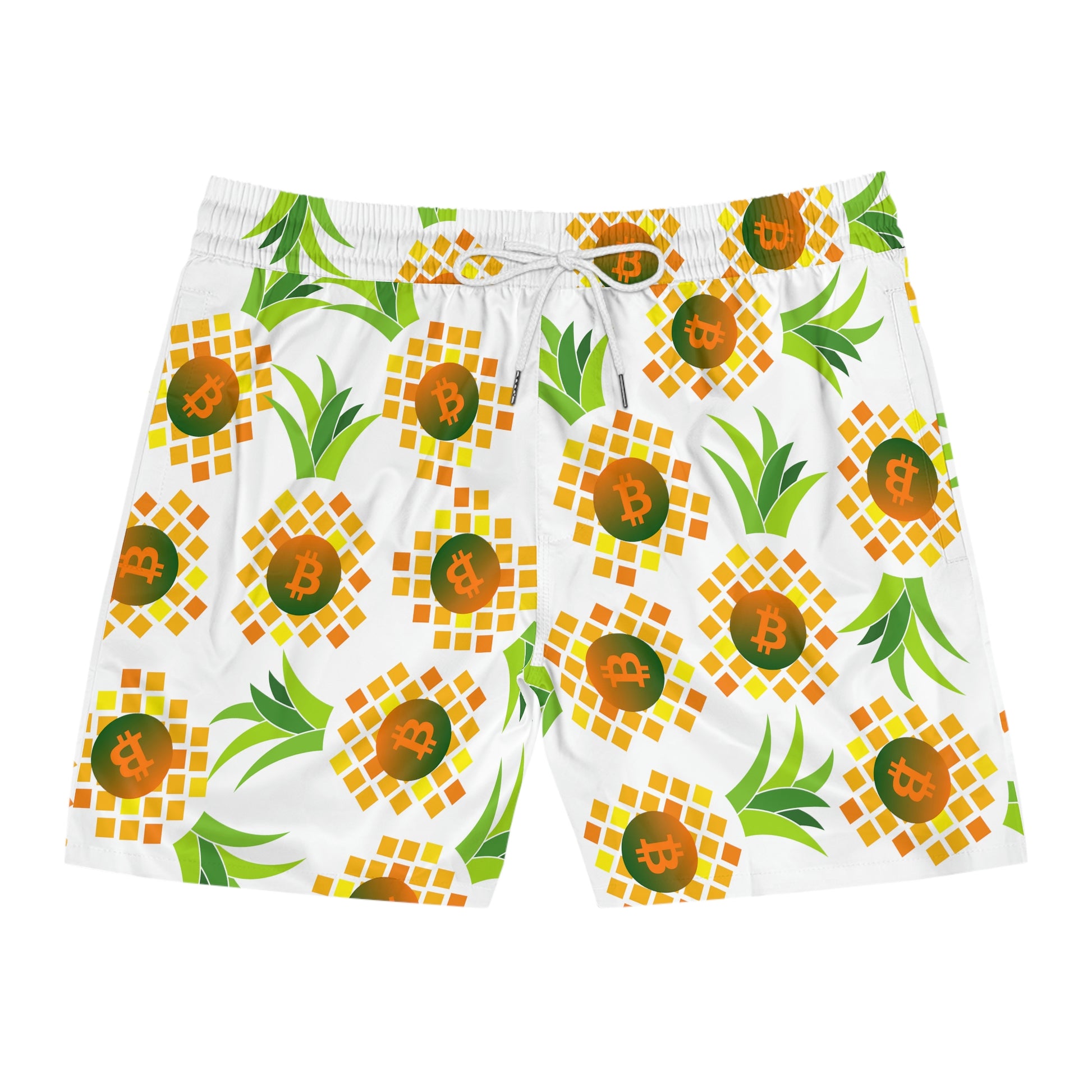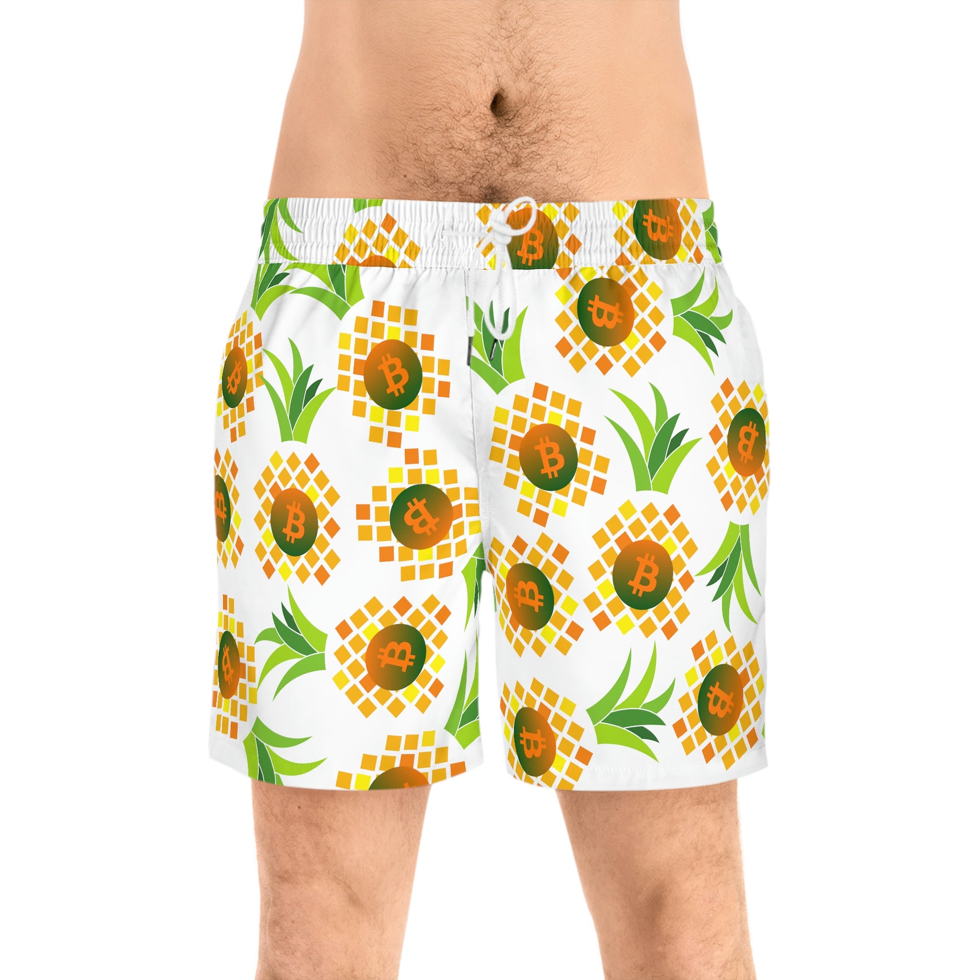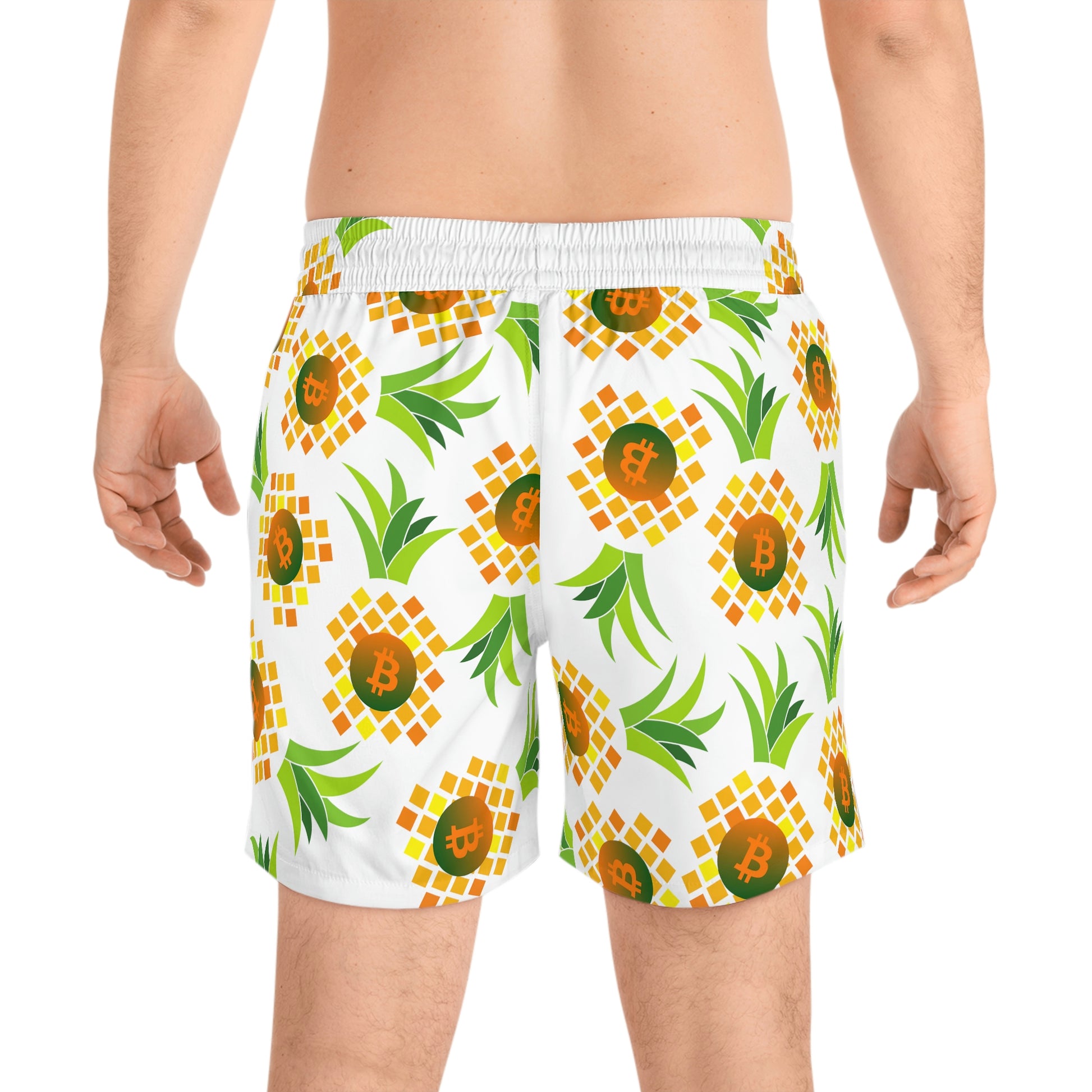 Made with 95% polyester and 5% spandex, it's the perfect blend for swimming and relaxing. These mid-length shorts are lightweight, come with an inner mesh brief and a relaxed fit, because sunny days at the coast are all about lounging and showing your Bitcoin pride. These shorts also come with two side pockets for added practicality.