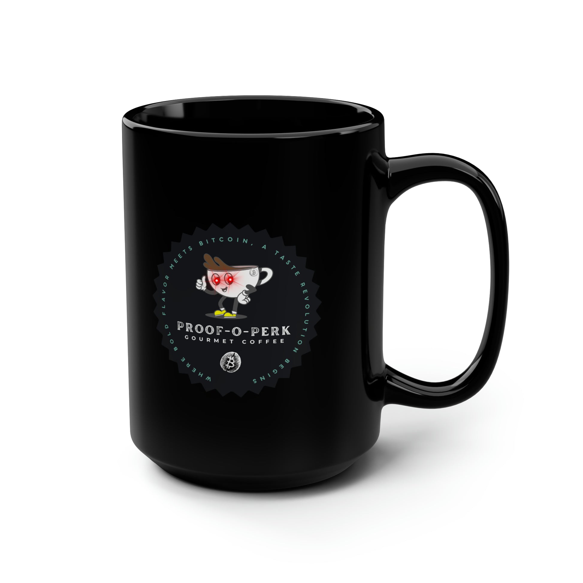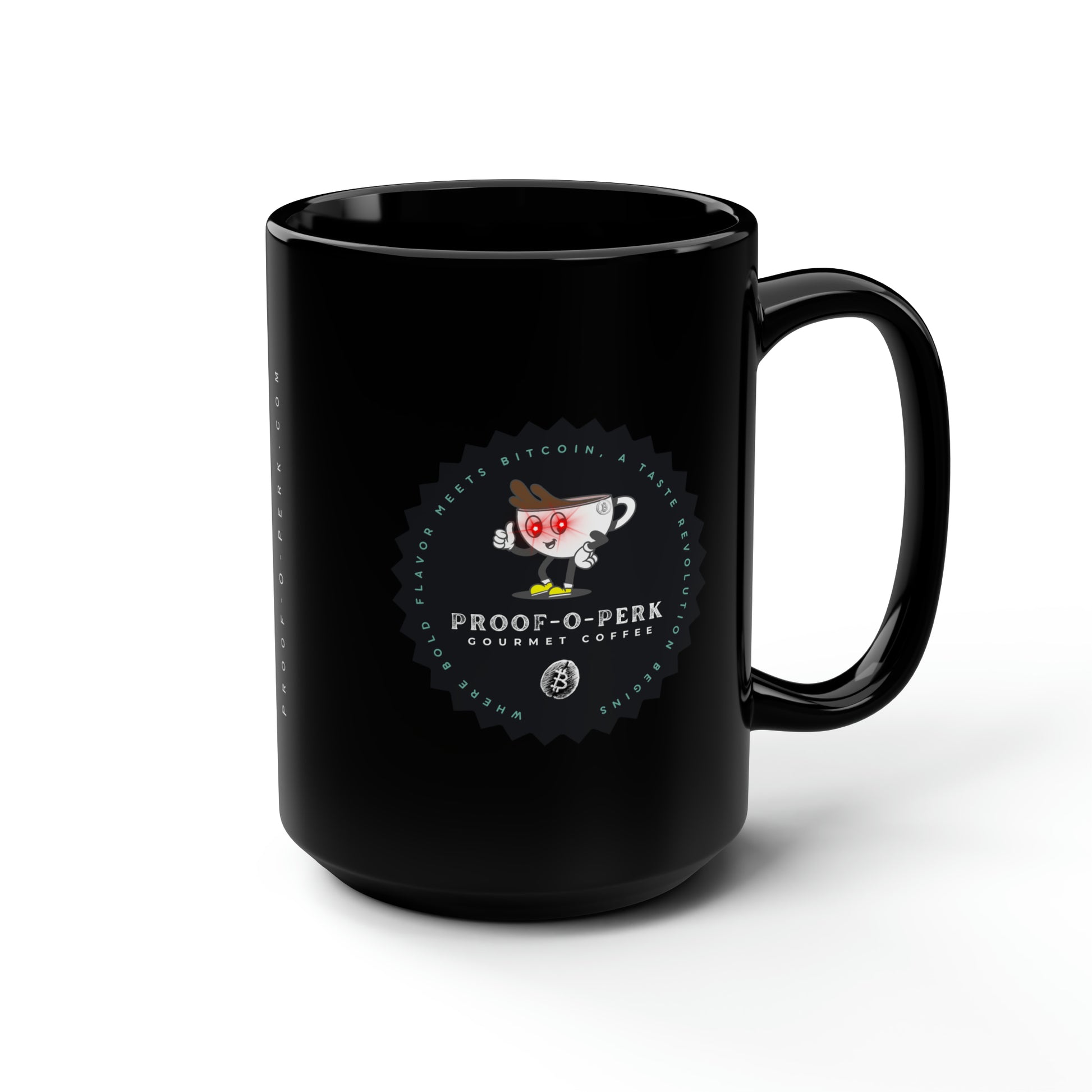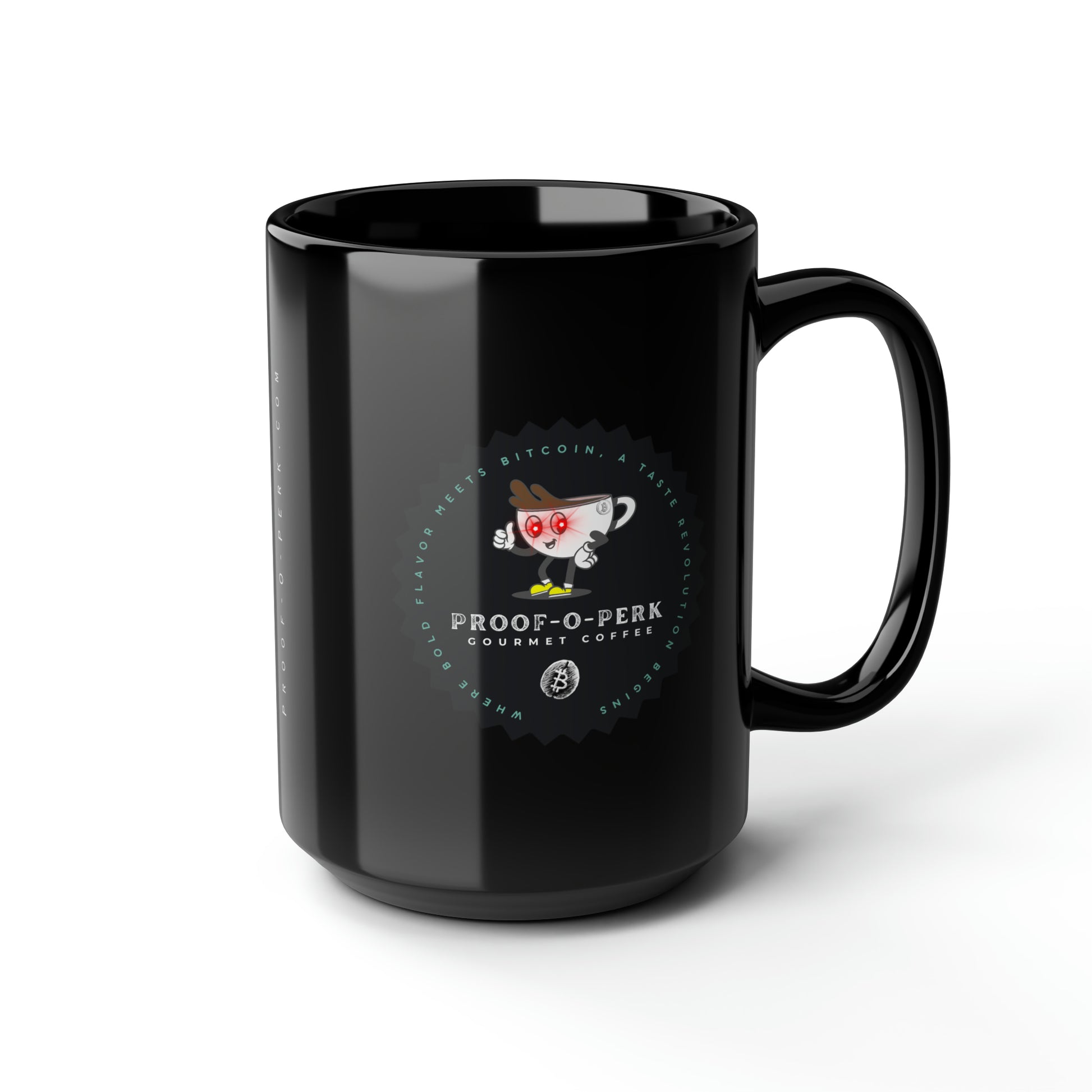 Introducing the Proof-O-Perk-inspired mug, a perfect fusion of coffee culture and digital scarcity that lets you show your love for exceptional brews and the Bitcoin revolution in style. These black mugs come in one size – 15oz (0.44l) – plenty for morning caffeine boosts and hot cups of tea on a rainy day. They're easy to grip and feel sturdy thanks to the C-shaped handle. Add more personality by decorating them with your original designs. They'll be printed on the black ceramic material in picture-perfect quality with a glossy finish.