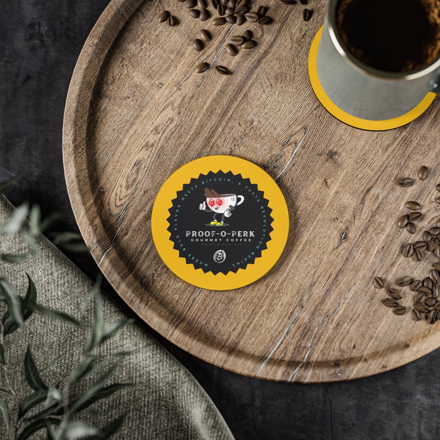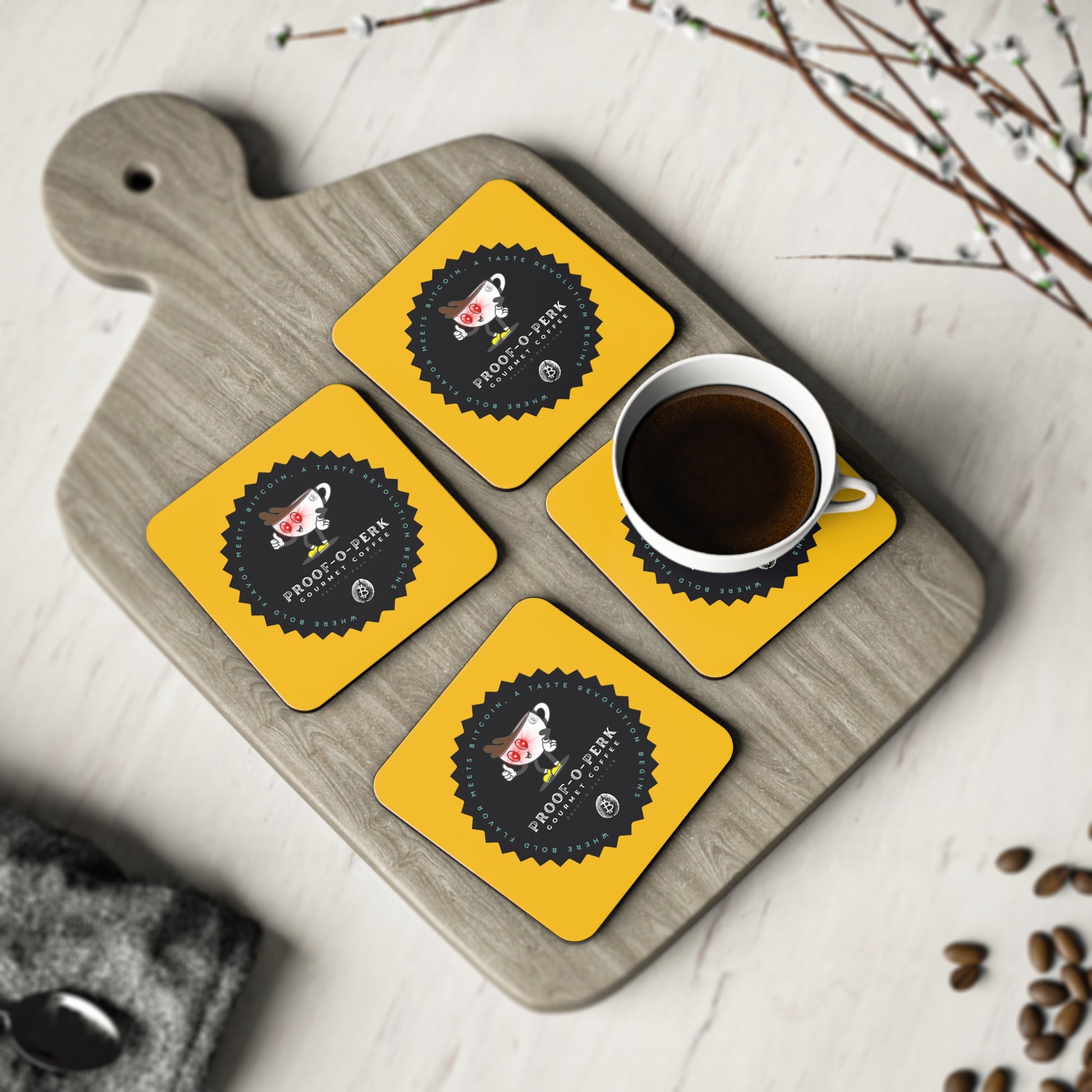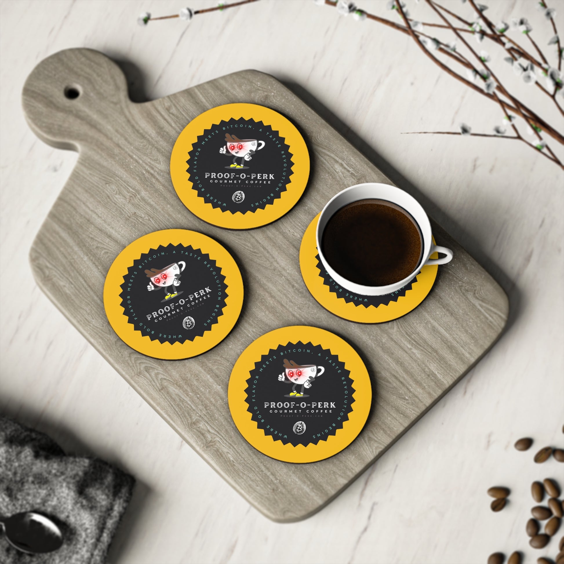 Who wouldn't want a set of Proof-O-Perk coasters to use and have on display beneath you favorite beverages?! A perfect fusion of coffee culture and digital scarcity that lets you show your love for exceptional brews and the Bitcoin revolution in style.