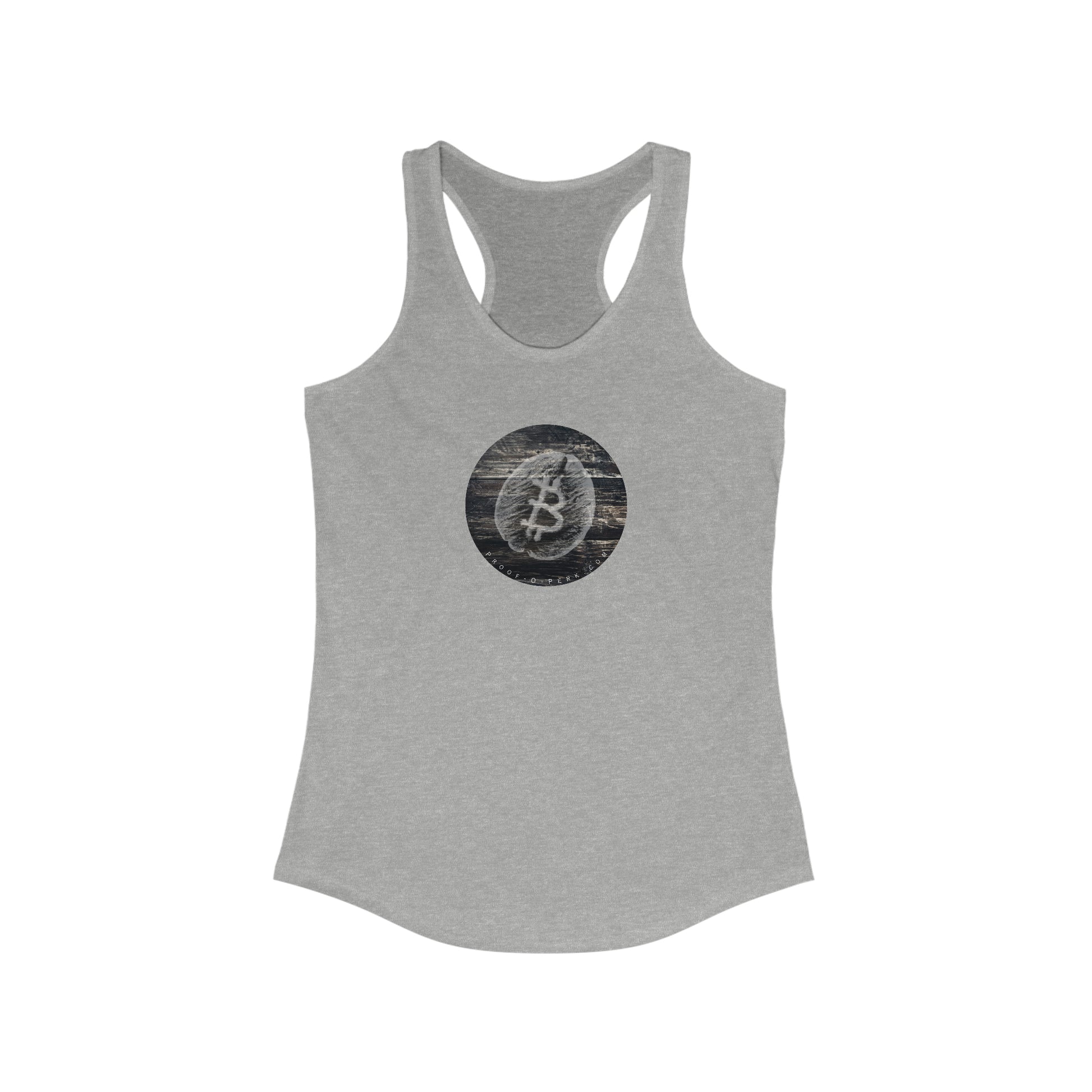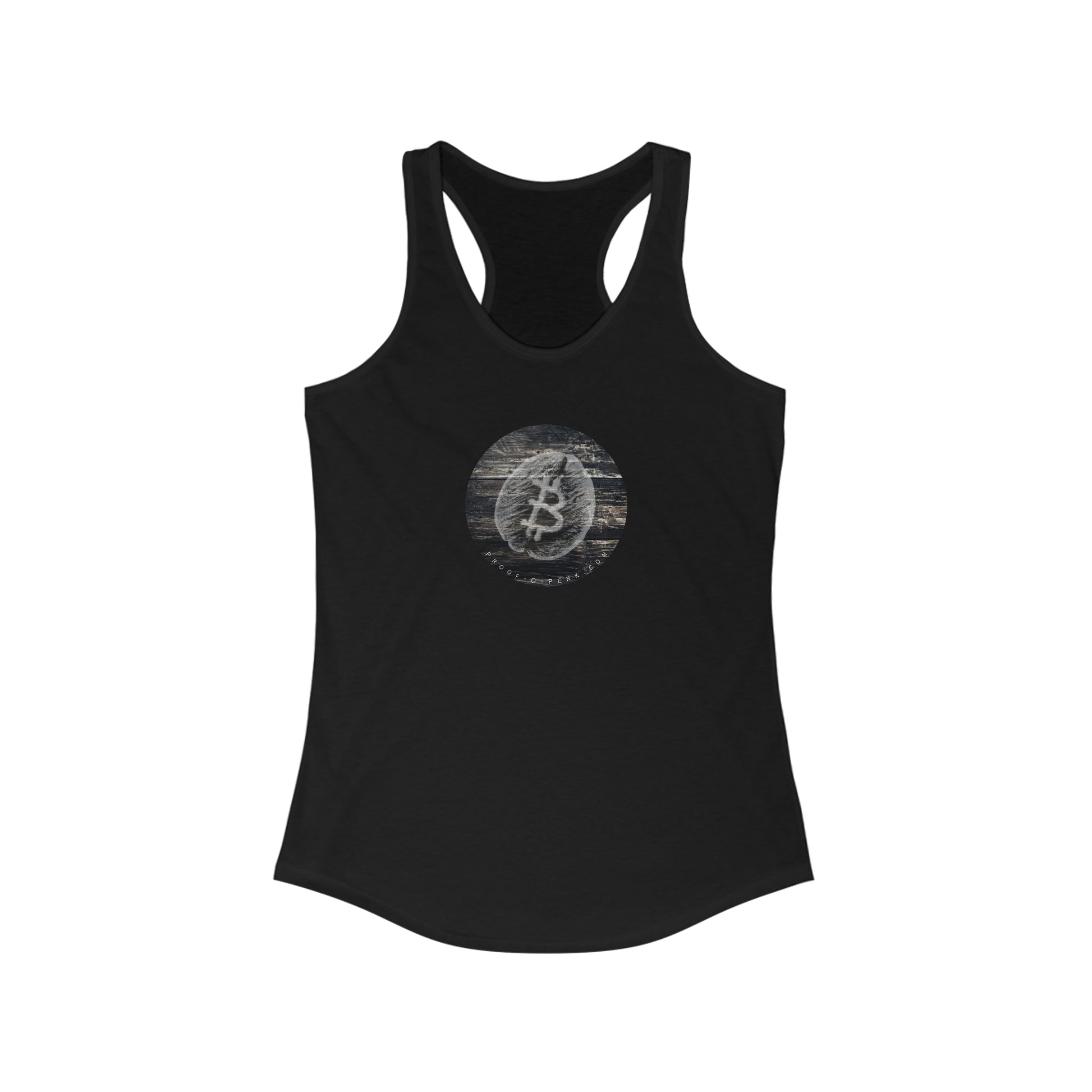 Introducing the Proof-O-Perk-inspired women's racerback tank, a perfect fusion of coffee culture and digital scarcity that lets you wear your love for exceptional brews and the Bitcoin revolution in style.