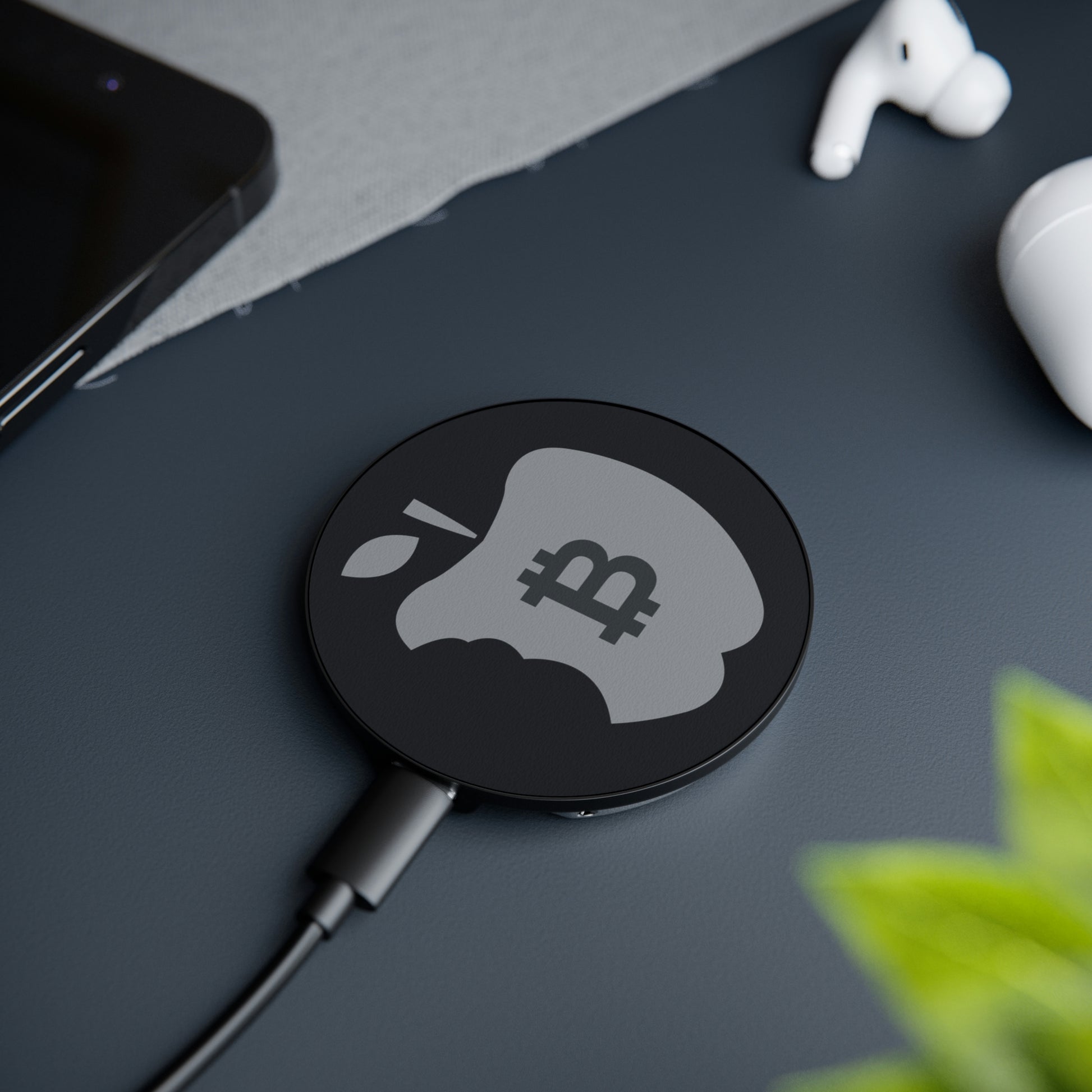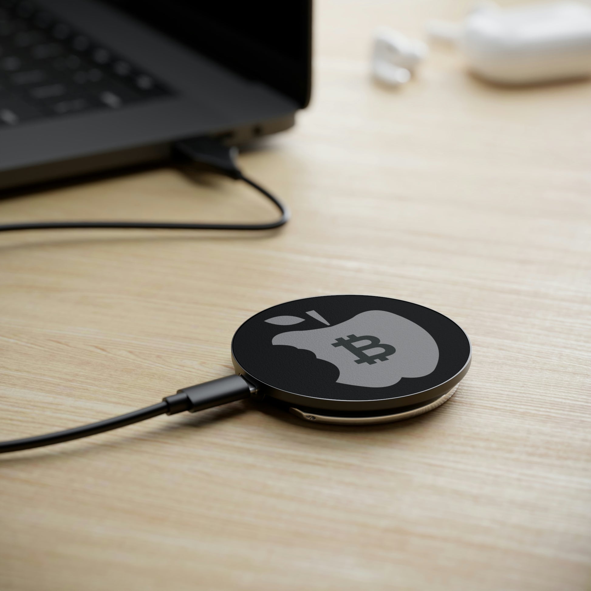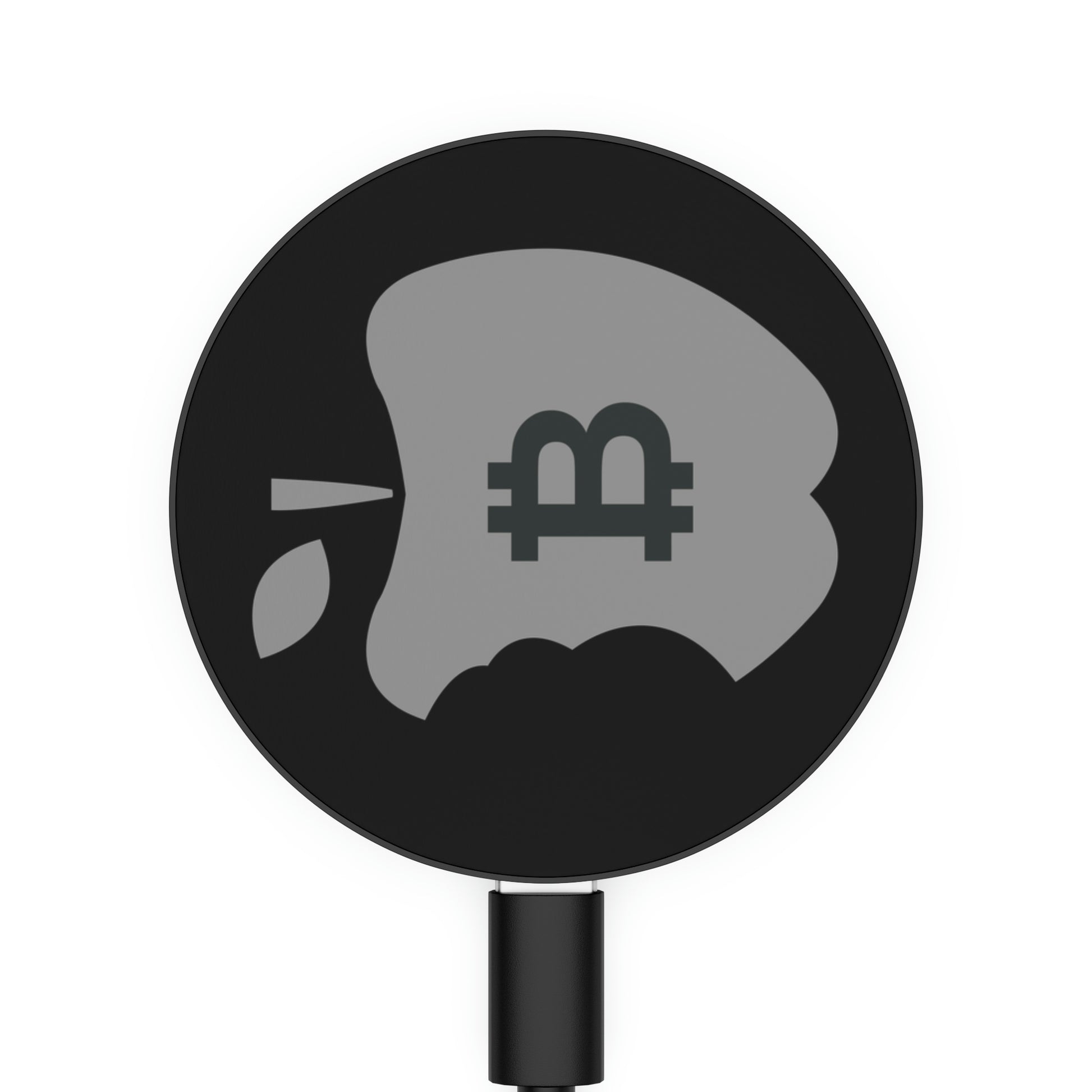 Created to satisfy gadget fans around the world, this customized wireless charger works universally with all wireless charging-compatible smartphones. With a slick black body, a matte white top, and a silver metal ring, it's a perfect way to subtlety plant a reminder of you conviction for Bitcoin in a tasteful and useful way. Comes with a built-in ring holder, supports Qi wireless charging standard and MagSafe function, and ships with a USB-C cable included.