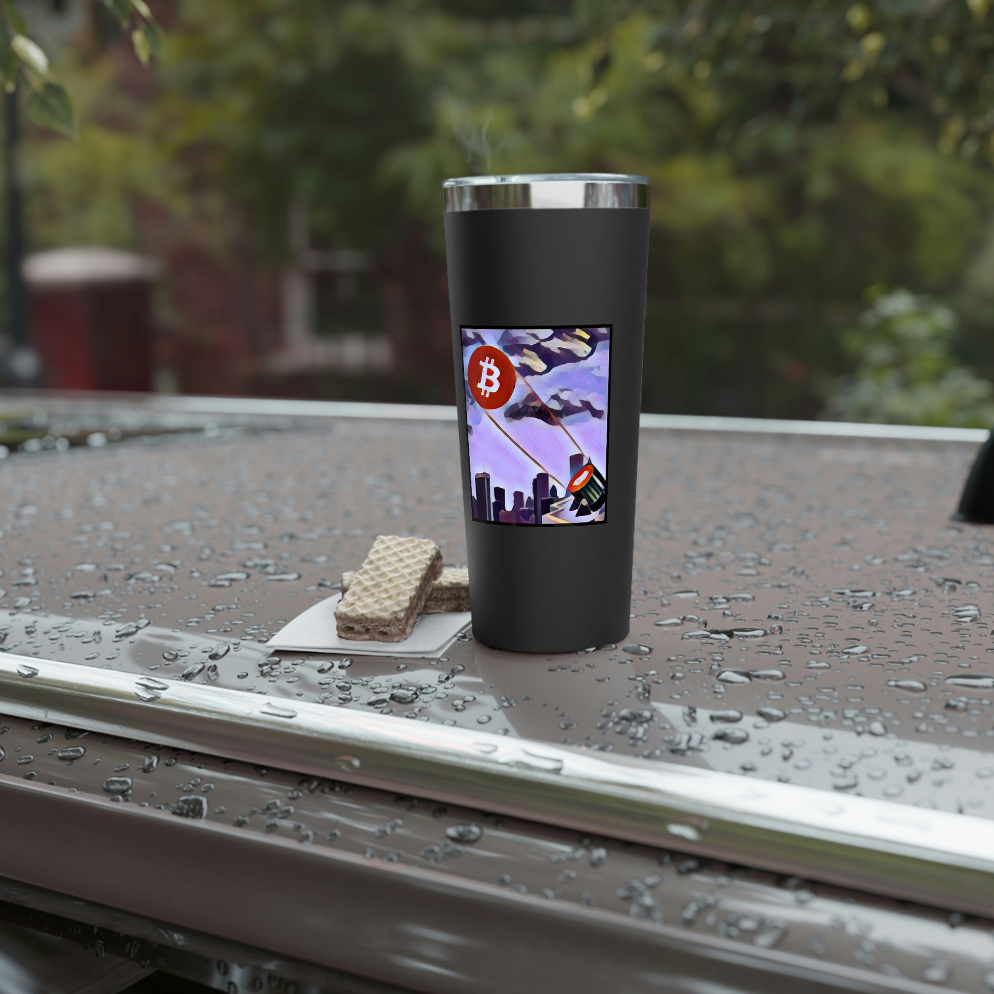 Stay hydrated in style on a daily basis with this Bitcoin tumbler. With a 22oz capacity and copper vacuum insulation, our tumbler keeps your favorite beverages refreshingly cold for 24 hours, and soothingly hot for up to 6. Its stainless steel exterior is condensation-resistant while the powder coating adds extra style points.